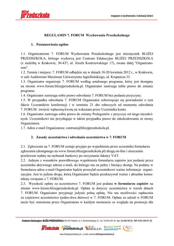 magazyn o wychowaniu i edukacji dzieci REGULAMIN 7. FORUM Wychowania Przedszkolnego 1. Postanowienia ogólne 1.1. Organizatorem 7. FORUM Wychowania Przedszkolnego jest miesięcznik BLIŻEJ PRZEDSZKOLA, którego wydawcą jest Centrum Edukacyjne BLIŻEJ PRZEDSZKOLA (z siedzibą w Krakowie, 30-437, ul. Józefa Kostrzewskiego 17), zwane dalej "Organizatorem". 1.2. Termin i miejsce: 7. FORUM odbędzie się w dniach 18-20 kwietnia 2012 r., w Krakowie, w auli Auditorium Maximum Uniwersytetu Jagiellońskiego, ul. Krupnicza 33. 1.3. Organizator organizuje 7. FORUM według ustalonego programu, który jest dostępny na stronie www.forum.blizejprzedszkola.pl. Organizator zastrzega sobie prawo do zmiany programu. 1.4. Organizator zastrzega sobie prawo odwołania 7. FORUM bez podania przyczyny. 1.5. W przypadku odwołania 7. FORUM Organizator zobowiązuje się powiadomić o tym fakcie Uczestników konferencji i w terminie 21 dni roboczych od momentu odwołania 7. FORUM zwrócić wpłaconą kwotę na wskazane przez Uczestnika konto. 1.6. Organizator zastrzega sobie prawo do zmiany Prelegentów z przyczyn od niego niezależnych. Uczestnikowi nie przysługuje w takim przypadku prawo do odszkodowania ze strony Organizatora. 1.7. Adres e-mail Organizatora: [email protected]. 2. Zasady uczestnictwa i odwołania uczestnictwa w 7. FORUM 2.1. Zgłoszenie na 7. FORUM zostaje przyjęte po wypełnieniu przez uczestnika formularza zgłoszenia (dostępnego na www.forum.blizejprzedszkola.pl) drogą on-line i uiszczeniu przelewem wpłaty na rachunek bankowy po otrzymaniu faktury VAT. 2.2. Jednym z warunków prawidłowego wypełnienia formularza zapisów jest podanie przez uczestnika aktywnego adresu e-mail, do którego ma on pełny i bieżący dostęp. Na podany w formularzu adres e-mail Organizator będzie przesyłał uczestnikowi ważne informacje organizacyjne. Jest to jedyna droga, którą Organizator będzie przekazywał ważne i aktualne komunikaty związane z 7. FORUM. 2.3. Wysokość opłaty za uczestnictwo 7. FORUM jest podana w formularzu zapisów na stronie www.forum.blizejprzedszkola.pl. Opłata ta dotyczy uczestnictwa w trzech dniach 7. FORUM. Organizator przyjmuje jedynie pełną opłatę. Nie ma możliwości zapłacenia za częściowe uczestnictwo (jedno-dwu dniowe) w 7. FORUM. Opłata za udział w FORUM może być zmieniona przez Organizatora w każdym momencie ze względu na promocje dla Centrum Edukacyjne BLIŻEJ PRZEDSZKOLA 30-437 Kraków, ul. J. Kostrzewskiego 17, tel. 12 631 04 10, fax. 12 262 50 34, NIP: 678-136-67-32 www.blizejprzedszkola.pl, e-mail: [email protected] magazyn o wychowaniu i edukacji dzieci prenumeratorów miesięcznika BLIŻEJ PRZEDSZKOLA i Uczestników poprzednich edycji 7. FORUM. 2.4. W przypadku, gdy zgłoszenie Uczestnika zostanie przyjęte i okaże się, że nie będzie mógł on uczestniczyć w 7. FORUM, może ubiegać się o zwrot pełnej wpłaconej opłaty uczestnictwa. Rezygnacja musi być zgłoszona w formie pisemnej jednak nie później niż do dnia 11 kwietnia 2012 r. Uczestnikowi, który rezygnuje z 7. FORUM po tym terminie lub też będzie nieobecny na 7. FORUM, nie przysługuje prawo do zwrotu wpłaconej kwoty oraz do otrzymania certyfikatu uczestnictwa. Istnieje możliwość odstąpienia swojego udziału w 7. FORUM innej osobie jednakże po wcześniejszym poinformowaniu Organizatora drogą e-mail (najpóźniej do 11 kwietnia 2012 r.). 2.5. Rezygnacja z 7. FORUM wymaga formy pisemnej (mail: [email protected] lub fax 12 262 50 34). 2.6. Uczestnik ma prawo do: a) uzyskania niezbędnych informacji dotyczących programu, terminu i miejsca 7. FORUM; b) otrzymania od Organizatora materiałów konferencyjnych oraz certyfikatu uczestnictwa; 2.7. Koszt pobytu, przejazdu i noclegów Uczestnik pokrywa we własnym zakresie. 2.8. Organizator nie zapewnia miejsc noclegowych. 2.9. Liczba uczestników jest ograniczona. W przypadku dużej liczby chętnych decyduje kolejność zgłoszeń (wypełnienia formularza on-line i wpłata na konto Organizatora). 3. Zasady uczestnictwa i korzystania z propozycji kulturalnych przygotowanych dla Uczestników 7. FORUM. 3.1. Propozycje kulturalne zaplanowane są na dzień 19 kwietnia 2012 r., (na godziny popołudniowo-wieczorne). Są one przewidziane dla Uczestników 7. FORUM, którzy zapisując się na FORUM zgłoszą chęć uczestnictwa w zwiedzaniu Muzeum Narodowego w Sukiennicach lub wycieczce po Krakowie (liczba miejsc jest ograniczona – decyduje kolejność zgłoszenia). 3.2. Koszty uczestnictwa w propozycjach kulturalnych zamieszczone są na stronie internetowej www.forum.blizejprzedszkola.pl. 3.3. Uczestnik może wybrać wyłącznie jedną z propozycji. 3.4. Uczestnik, który zdecyduje się na jedną z propozycji, będzie poinformowany drogą emailową (do dnia 26 marca 2012 r., o szczegółowym planie związanym z wybraną propozycją). 3.5. Istnieje możliwość odstąpienia swojego udziału w wybranej przez siebie propozycji, jednakże po wcześniejszym poinformowaniu o tym fakcie Organizatora drogą e-mailową [email protected] najpóźniej do 11 kwietnia 2012 r. 3.6. W przypadku gdy Uczestnik nie będzie mógł uczestniczyć w wybranej przez siebie propozycji i nie odstąpi swojego udziału innej osobie, zwrot całkowitej kwoty będzie dokonany Centrum Edukacyjne BLIŻEJ PRZEDSZKOLA 30-437 Kraków, ul. J. Kostrzewskiego 17, tel. 12 631 04 10, fax. 12 262 50 34, NIP: 678-136-67-32 www.blizejprzedszkola.pl, e-mail: [email protected] magazyn o wychowaniu i edukacji dzieci do 14 dni. Taką informację należy przesłać drogą e-mailową [email protected] do Organizatora najpóźniej do 11 kwietnia 2012 r. 3.7. Uczestnikowi, który rezygnuje z wybranej przez siebie propozycji kulturalnej po 11 kwietnia 2012 r., nie przysługuje prawo do zwrotu wpłaconej kwoty. 3.8. Organizator zastrzega sobie możliwość odwołania zwiedzania Muzeum Narodowego i wycieczki po Krakowie w dn. 19 kwietnia 2012r. Zainteresowani Uczestnicy zostaną o tym
