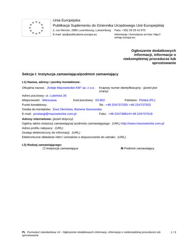 Unia Europejska Publikacja Suplementu do Dziennika Urzędowego Unii Europejskiej 2, rue Mercier, 2985 Luxembourg, Luksemburg Faks: +352 29 29 42 670 E-mail: [email protected] Informacje i formularze on-line: http:// simap.europa.eu Ogłoszenie dodatkowych informacji, informacje o niekompletnej procedurze lub sprostowanie Sekcja I: Instytucja zamawiająca/podmiot zamawiający I.1) Nazwa, adresy i punkty kontaktowe: Oficjalna nazwa: „Koleje Mazowieckie-KM” sp. z o.o. Krajowy numer identyfikacyjny: (jeżeli jest znany) _____ Adres pocztowy: ul. Lubelska 26 Miejscowość: Warszawa Kod pocztowy: 03-802 Punkt kontaktowy: _____ Państwo: Polska (PL) Tel.: +48 224737255/ +48 224737353 Osoba do kontaktów: Ewa Oknińska, Bożena Sosnowska E-mail: [email protected] Faks: +48 224738814/+48 224737518 Adresy internetowe: (jeżeli dotyczy) Ogólny adres instytucji zamawiającej/ podmiotu zamawiającego: (URL) http://www.mazowieckie.com.pl Adres profilu nabywcy: (URL) _____ Dostęp elektroniczny do informacji: (URL) _____ Elektroniczne składanie ofert i wniosków o dopuszczenie do udziału: (URL) _____ I.2) Rodzaj zamawiającego: Instytucja zamawiająca Podmiot zamawiający PL Formularz standardowy 14 - Ogłoszenie dodatkowych informacji, informacje o niekompletnej procedurze lub sprostowanie 1/5 Sekcja II: Przedmiot zamówienia II.1.1) Nazwa nadana zamówieniu: Dostawa i wdrożenie zintegrowanego systemu informatycznego z infrastrukturą techniczną II.1.2) Krótki opis zamówienia lub zakupu: (podano w pierwotnym ogłoszeniu) 1.Przedmiotem zamówienia jest dostawa zintegrowanego systemu informatycznego (ZSI) klasy ERP obejmująca dostawę infrastruktury technicznej, zaprojektowanie systemu, udzielenie licencji, wdrożenie i uruchomienie zintegrowanego systemu informatycznego oraz zapewnienie serwisu gwarancyjnego. 2.Przedmiot zamówienia obejmuje: 2.1. dostawę licencji ZSI oraz wszelkiego innego oprogramowania niezbędnego do funkcjonowania ZSI w wymaganym zakresie, w tym np. systemów operacyjnych serwerów, systemów baz danych i innych dla wymaganej liczby użytkowników, 2.2. dostarczenie infrastruktury technicznej, 2.3. instalację i konfigurację dostarczonego oprogramowania oraz infrastruktury technicznej, 2.4. wykonanie analizy przedwdrożeniowej zawierającej przemodelowanie funkcjonujących u Zamawiającego procesów z uwzględnieniem specyfiki wdrażanego systemu i modeli referencyjnych w nim zawartych, 2.5. wdrożenie ZSI wraz z wykonaniem modyfikacji programistycznych, 2.6. przeprowadzenie szkoleń użytkowników, administratorów i programistów, 2.7. wykonanie i uruchomienie interfejsów do systemów informatycznych, Zamawiającego 2.8. serwis gwarancyjny. Szczegółowy opis przedmiotu zamówienia oraz specyfikację wymagań na system informatyczny zawiera załącznik nr 5 do SIWZ. Szczegółowy opis oraz sposób realizacji przedmiotu zamówienia określają istotne postanowienia umowy stanowiące załacznik nr 2 do SIWZ. II.1.3) Wspólny Słownik Zamówień (CPV) Główny przedmiot Dodatkowe przedmioty Słownik główny 72263000 72260000 48000000 48820000 Słownik uzupełniający (jeżeli dotyczy) PL Formularz standardowy 14 - Ogłoszenie dodatkowych informacji, informacje o niekompletnej procedurze lub sprostowanie 2/5 Sekcja IV: Procedura IV.1)Rodzaj procedury (podano w pierwotnym ogłoszeniu) Otwarta Ograniczona Ograniczona przyspieszona Negocjacyjna Negocjacyjna przyspieszona Dialog konkurencyjny Negocjacyjna z uprzednim ogłoszeniem Negocjacyjna bez uprzedniego ogłoszenia Negocjacyjna z publikacją ogłoszenia o zamówieniu Negocjacyjna bez publikacji ogłoszenia o zamówieniu Udzielenie zamówienia bez uprzedniej publikacji ogłoszenia o zamówieniu w Dzienniku Urzędowym Unii Europejskiej IV.2)Informacje administracyjne IV.2.1)Numer referencyjny: (podano w pierwotnym ogłoszeniu) MWZ7-205-79-2014 IV.2.2)Dane referencyjne ogłoszenia w przypadku ogłoszeń przesłanych drogą elektroniczną: Pierwotne ogłoszenie przesłane przez eNotices TED eSender Login: ENOTICES_aniaw Dane referencyjne ogłoszenia: 2014-134844 rok i numer dokumentu IV.2.3)Ogłoszenie, którego dotyczy niniejsza publikacja: Numer ogłoszenia w Dz.U.: 2014/S 200-353786 z dnia: 17/10/2014 (dd/mm/rrrr) IV.2.4)Data wysłania pierwotnego ogłoszenia: 13/10/2014 (dd/mm/rrrr) PL Formularz standardowy 14 - Ogłoszenie dodatkowych informacji, informacje o niekompletnej procedurze lub sprostowanie 3/5 Sekcja VI: Informacje uzupełniające VI.1) Ogłoszenie dotyczy: Procedury niepełnej Sprostowania Informacji dodatkowych VI.2) Informacje na temat niepełnej procedury udzielenia zamówienia: Postępowanie o udzielenie zamówienia zostało przerwane Postępowanie o udzielenie zamówienia uznano za nieskuteczne Zamówienia nie udzielono Zamówienie może być przedmiotem ponownej publikacji VI.3) Informacje do poprawienia lub dodania : VI.3.1) Zmiana oryginalnej informacji podanej przez instytucję zamawiającą Publikacja w witrynie TED niezgodna z oryginalną informacją, przekazaną przez instytucję zamawiającą Oba przypadki VI.3.2) W ogłoszeniu pierwotnym W odpowiedniej dokumentacji przetargowej (więcej informacji w odpowiedniej dokumentacji przetargowej) W obu przypadkach (więcej informacji w odpowiedniej dokumentacji przetargowej) VI.3.3) Tekst, który należy poprawić w pierwotnym ogłoszeniu Miejsce, w którym znajduje się Zamiast: Powinno być: zmieniany tekst: 5.Wadium wnoszone w pieniądzu 5.Wadium wnoszone w pieniądzu Sekcja III. 1.1) pkt 5 wpłaca się przelewem na rachunek wpłaca się przelewem na rachunek bankowy Zamawiającego: bankowy Zamawiającego: Bank Bank Handlowy w Warszawie Pekao S.A. w Warszawie 29 S. A. 21 1030 1508 0000 1240 1082 1111 0010 1924 0008 1597 3003 z dopiskiem 1167 z dopiskiem wadium wadium na przetarg „Dostawa na przetarg „Dostawa i i wdrożenie zintegrowanego wdrożenie zintegrowanego systemu informatycznego z systemu informatycznego z infrastrukturą techniczn