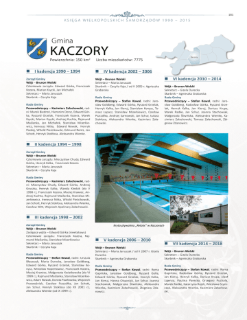 181 Księga wielkopolskich samorządów 1990 – 2015 Gmina KACZORY Powierzchnia: 150 km2 I kadencja 1990 – 1994 Zarząd Gminy Wójt – Brunon Wolski Członkowie zarządu: Edward Górka, Franciszek Kozera, Marian Ksycki, Jan Michałek Sekretarz – Maria Januszak Skarbnik – Cecylia Kaja Rada Gminy Przewodniczący – Kazimierz Załachowski, radni: Marek Biedroń, Hieronim Dorsz, Edward Górka, Ryszard Grzelak, Franciszek Kozera, Marek Ksycki, Marian Ksycki, Andrzej Kuchta, Rajmund Maślanka, Jan Michałek, Stanisław Mizerkiewicz, Ireneusz Nitka, Edward Nowak, Henryk Pazdej, Witold Pieścikowski, Edmund Rentz, Jan Schott, Henryk Stokłosa, Aleksandra Wienke. Liczba mieszkańców: 7775 IV kadencja 2002 – 2006 Wójt – Brunon Wolski Sekretarz – Maria Januszak Skarbnik – Cecylia Kaja / od II 2005 r. Agnieszka Grabarska Rada Gminy Przewodniczący – Stefan Kowal, radni: Jarosław Goldberg, Edward Górka, Ryszard Grzelak, Henryk Kalka, Jan Kieruj, Stanisław Konysz, Tomasz Łapacz, Stanisław Mizerkiewicz, Czesław Pszczółka, Andrzej Sarnowski, Jan Schur, Łukasz Stokłosa, Aleksandra Wienke, Kazimierz Załachowski. VI kadencja 2010 – 2014 Wójt – Brunon Wolski Sekretarz – Gizela Durecka Skarbnik – Agnieszka Grabarska Rada Gminy Przewodniczący – Stefan Kowal, radni: Jarosław Goldberg, Radosław Górka, Ryszard Grzelak, Henryk Kalka, Jan Kieruj, Dariusz Krupa, Marek Radke, Jan Schur, Joanna Stachowiak, Małgorzata Śliwińska, Aleksandra Wienke, Kazimierz Załachowski, Tomasz Załachowski, Zbigniew Zdanowicz. II kadencja 1994 – 1998 Zarząd Gminy Wójt – Brunon Wolski Członkowie zarządu: Mieczysław Chudy, Edward Górka, Henryk Kalka, Franciszek Kozera Sekretarz – Maria Januszak Skarbnik – Cecylia Kaja Rada Gminy Przewodniczący – Kazimierz Załachowski, radni: Mieczysław Chudy, Edward Górka, Andrzej Gryczka, Henryk Kalka, Wanda Kledzik (do V 1998 r.), Franciszek Kozera, Maciej Krawiec, Andrzej Kuchta, Rajmund Maślanka, Stanisław Mizerkiewicz, Ireneusz Nitka, Witold Pieścikowski, Jan Schott, Henryk Stokłosa, Aleksandra Wienke, Czesław Witt, Wojciech Apolinary Załachowski. III kadencja 1998 – 2002 Zarząd Gminy Wójt – Brunon Wolski Zastępca wójta – Edward Górka (nieetatowy) Członkowie zarządu: Franciszek Kozera, Rajmund Maślanka, Stanisław Mizerkiewicz Sekretarz – Maria Januszak Skarbnik – Cecylia Kaja Rada Gminy Przewodniczący – Stefan Kowal, radni: Urszula Błaszczyk, Maria Durecka, Jarosław Goldberg, Edward Górka, Ryszard Grzelak, Stanisław Konysz, Mirosław Kopertowicz, Franciszek Kozera, Maciej Krawiec, Małgorzata Kwiatkowska (do VI 1999 r.), Rajmund Maślanka, Stanisław Mizerkiewicz, Adam Nowak, Dorota Pawłowska, Wojciech Przewoźniak, Czesław Pszczółka, Jan Schott, Jan Schur, Henryk Stokłosa (do XII 2001 r.), Aleksandra Wienke (od IX 1999 r.). Kryta pływalnia „Relaks” w Kaczorach V kadencja 2006 – 2010 Wójt – Brunon Wolski Sekretarz – Maria Januszak / od II 2007 r. Gizela Durecka Skarbnik – Agnieszka Grabarska Rada Gminy Przewodniczący – Stefan Kowal, radni: Roma Gapińska, Jarosław Goldberg, Ryszard Golla, Edward Górka, Ryszard Grzelak, Henryk Kalka, Jan Kieruj, Hanna Okupniak, Jan Schur, Joanna Stachowiak, Małgorzata Śliwińska, Aleksandra Wienke, Kazimierz Załachowski, Zbigniew Zdanowicz. VII kadencja 2014 – 2018 Wójt – Brunon Wolski Sekretarz – Gizela Durecka Skarbnik – Agnieszka Grabarska Rada Gminy Przewodniczący – Stefan Kowal, radni: Roma Gapińska, Radosław Górka, Ryszard Grzelak, Jan Kieruj, Henryk Kalka, Dariusz Krupa, Józef Ligenza, Paulina Parecka, Grzegorz Puchała, Marek Radke, Katarzyna Rajek, Wiesława Szymczak, Aleksandra Wienke, Kazimierz Załachowski.