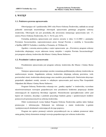 Program Ochrony Środowiska dla Miasta i Gminy Borne Sulinowo ABRYS Technika Sp. z o.o. I. WSTĘP 1.1. Podstawa prawna opracowania Obowiązujące od 1 października 2001 roku Prawo Ochrony Środowiska, nakłada na zarząd jednostki samorządu terytorialnego obowiązek opracowania gminnego programu ochrony środowiska. Obowiązek ten jest przesłanką dla utworzenia niniejszego opracowania (art. 17, ustawy Prawo Ochrony Środowiska, Dz. U. Nr 62, poz. 627). Formalną podstawą opracowania jest umowa zawarta w dniu 11.12.2003 r. pomiędzy Powiatem Szczecineckim, reprezentowanym przez Zarząd Powiatu z siedzibą w Szczecinku a Spółką ABRYS Technika z siedzibą w Poznaniu, ul. Wiślana 46. Zgodnie z zawartą umową jedną z części opracowania pn. „Powiatowy program ochrony środowiska obejmujący swym zakresem tereny miejskie i wiejskie Powiatu Szczecineckiego” jest program ochrony środowiska dla Miasta i Gminy Borne Sulinowo. 1.2. Przedmiot i zakres opracowania Przedmiotem opracowania jest program ochrony środowiska dla Miasta i Gminy Borne Sulinowo. Niniejsze opracowanie prezentuje szeroko rozumianą problematykę ochrony środowiska na analizowanym terenie. Zagadnienia ochrony środowiska obejmują ochronę powietrza, wód, powierzchni ziemi, środowiska akustycznego oraz zasobów przyrodniczych. Omówienia dotyczące gospodarki odpadami zostały zawarte w odrębnym opracowaniu pod nazwą Plan Gospodarki Odpadami dla Miasta i Gminy Borne Sulinowo. Program Ochrony Środowiska wskazuje tzw. „punkty zapalne” w środowisku, wywołane niezrównowaŜonym rozwojem gospodarczym oraz przedstawia konkretne propozycje działań zmierzających do stopniowej likwidacji zagroŜeń. Hierarchicznie uporządkowanie celów pod kątem ich waŜności, decyduje o podziale przyszłego budŜetu gminy i spodziewanych środków pomocowych przeznaczonych na ochronę środowiska. Obok wymienionych wyŜej funkcji Program Ochrony Środowiska spełnia takŜe funkcje promocyjne i informacyjne. Dokument ten informuje o stanie środowiska w gminie i podejmowanych działaniach zmierzających do jego poprawy. Program ten oprócz promocji walorów przyrodniczych ma za zadanie promować takŜe samą gminę, której elementem strategii rozwoju gospodarczego jest ochrona środowiska. I.WSTĘP 7 Program Ochrony Środowiska dla Miasta i Gminy Borne Sulinowo ABRYS Technika Sp. z o.o. 1.3. Potrzeba i cel opracowania Programu Programy Ochrony Środowiska są podstawowym instrumentem realizacji II Polityki Ekologicznej Państwa. Sporządzane dla kolejnych szczebli administracji samorządowej, umoŜliwiają najbardziej efektywną ochronę środowiska przyrodniczego. Ochrona środowiska przyrodniczego jest jedną z głównych dróg prowadzących do osiągnięcia zrównowaŜonego rozwoju, naleŜy jednak pamiętać, Ŝe nie jedyną. O w pełni zrównowaŜonym rozwoju moŜna dopiero mówić po osiągnięciu czterech ładów: • ekologicznego, • społecznego, • ekonomicznego (gospodarczego), • przestrzennego. Podstawowym narzędziem osiągnięcia ładu ekologicznego jest ochrona i kształtowanie środowiska przyrodniczego. Ład społeczny moŜe być osiągnięty np. poprzez akceptację mieszkańców dla proponowanych i podejmowanych działań. Ład gospodarczy osiąga się poprzez kształtowanie odpowiedniej struktury gospodarki i ograniczanie bezrobocia. Ład przestrzenny wiąŜe się np. z odpowiednią lokalizacją terenów przemysłowych, mieszkaniowych, komunikacyjnych i innych. PowyŜsze zasady zrównowaŜonego rozwoju i ochrony środowiska zostały uwzględnione w niniejszym opracowaniu. Są one zaleŜne od specyfiki oraz rzeczywistych potrzeb i moŜliwości gminy, na nim bowiem spocznie większość obowiązków związanych z wdraŜaniem kierunków i hierarchii działań zmierzających do osiągnięcia zrównowaŜonego rozwoju gminy. Do najistotniejszych zaproponowanych dla Miasta i Gminy Borne Sulinowo, celów i kierunków działań w zakresie rozwoju społeczno – gospodarczego i ochrony środowiska naleŜą: • ochrona powietrza, ochrona przed hałasem (zapewnienie wysokiej jakości powietrza, redukcja emisji gazów i pyłów, zminimalizowanie uciąŜliwego hałasu); • ochrona wód (zapewnienie odpowiedniej jakości uŜytkowej wód, racjonalizacja zuŜycia wody, właściwa gospodarka wodno-ściekowa); • ochrona zasobów przyrodniczych (zachowanie zasobów przyrodniczych z uwzględnieniem ich róŜnorodności oraz rozwój zasobów leśnych, racjonalna eksploatacja lasów, poprawa jakości wód powierzchniowych); • racjonalne uŜytkowanie zasobów naturalnych (zmniejszenie zuŜycia energii, surowców i materiałów, wzrost udziału wykorzystywanych zasobów odnawialnych); • prowadzenie skutecznej akcji edukacyjno-informacyjnej gwarantującej powodzenie realizacji wyŜej wymienionych działań. 8 I.WSTĘP Program Ochrony Środowiska dla Miasta i Gminy Borne Sulinowo ABRYS Technika Sp. z o.o. Realizacja zdefiniowanych ekologicznych celów strategicznych w powiązaniu z programem edukacji ekologicznej społeczeństwa powinna zapewnić Miastu i Gminie Borne Sulinowo rozwój zgodny z zasadami zrównowaŜonego rozwoju. 1.4. Metodyka opracowania Programu Sporządzanie programów ochrony środowiska dla kolejnych szczebli administracji samorządowej, umoŜliwiają najbardziej efektywną ochronę środowiska przyrodniczego. Wymaga to jednak kompatybilności wytyczonej polityki ekologicznej poszczególnych jednostek administracji państwowej, zmierzającej do poprawy środowiska przyrodniczego. Gminny program ochrony środowiska został opracowany w oparciu o obowiązujące przepisy prawne a takŜe „Wytyczne sporządzania programów ochrony środowiska na szczeblu regionalnym i lokalnym” wydane przez Ministerstwo Środowiska w grudniu 2002 roku. Ponadto w trakcie opracowywania niniejszego Programu uwzględniono jego zgodność z obowiązująca Polityką Ekologiczną Państwa oraz odpowiednio z programami 