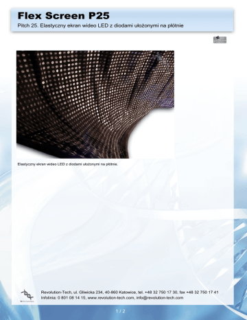 Flex Screen P25 Pitch 25. Elastyczny ekran wideo LED z diodami ułożonymi na płótnie Elastyczny ekran wideo LED z diodami ułożonymi na płótnie. Revolution-Tech, ul. Gliwicka 234, 40-860 Katowice, tel. +48 32 750 17 30, fax +48 32 750 17 41 Infolinia: 0 801 08 14 15, www.revolution-tech.com, [email protected] 1/2 Specyfikacje Napięcie 230 V Prąd AC Pitch 25 mm Gwarancja 12 m-cy Revolution-Tech, ul. Gliwicka 234, 40-860 Katowice, tel. +48 32 750 17 30, fax +48 32 750 17 41 Infolinia: 0 801 08 14 15, www.revolution-tech.com, [email protected] 2/2