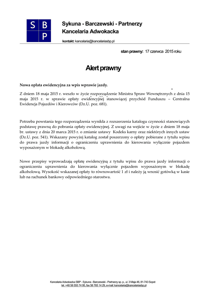 Sykuna - Barczewski - Partnerzy Kancelaria Adwokacka kontakt: [email protected] stan prawny: 17 czerwca 2015 roku Alert prawny Nowa opłata ewidencyjna za wpis wprawie jazdy. Z dniem 18 maja 2015 r. weszło w życie rozporządzenie Ministra Spraw Wewnętrznych z dnia 15 maja 2015 r. w sprawie opłaty ewidencyjnej stanowiącej przychód Funduszu – Centralna Ewidencja Pojazdów i Kierowców (Dz.U. poz. 681). Potrzeba powstania tego rozporządzenia wynikła z rozszerzenia katalogu czynności stanowiących podstawę prawną do pobrania opłaty ewidencyjnej. Z uwagi na wejście w życie z dniem 18 maja br. ustawy z dnia 20 marca 2015 r. o zmianie ustawy Kodeks karny oraz niektórych innych ustaw (Dz.U. poz. 541). Wskazany powyżej katalog został poszerzony o opłaty pobierane z tytułu wpisu do prawa jazdy informacji o ograniczeniu uprawnienia do kierowania wyłącznie pojazdem wyposażonym w blokadę alkoholową. Nowe przepisy wprowadzają opłatę ewidencyjną z tytułu wpisu do prawa jazdy informacji o ograniczeniu uprawnienia do kierowania wyłącznie pojazdem wyposażonym w blokadę alkoholową. Wysokość wskazanej opłaty to równowartość 1 zł i należy ją wnosić gotówką w kasie lub na rachunek bankowy odpowiedniego starostwa. Kancelaria Adwokacka SBP - Sykuna - Barczewski - Partnerzy sp. p., ul. 3 Maja 46, 81-743 Sopot tel. +48 58 555 74 95, fax 58 765 14 29, e-mail: [email protected] Sykuna - Barczewski - Partnerzy Kancelaria Adwokacka kontakt: [email protected] Newsletter prawo samorządowe 1. Najważniejsze zmiany Nowe warunki techniczne dla kanałów technologicznych lokalizowanych w pasie drogowym dróg publicznych. Z dniem 16 sierpnia 2015 r. wejdzie w życie rozporządzenie Ministra Administracji i Cyfryzacji z dnia 21 kwietnia 2015 r. w sprawie warunków technicznych, jakim powinny odpowiadać kanały technologiczne (Dz.U. poz. 680). Wydanie nowego rozporządzenia było uwarunkowane wprowadzeniem zmiany ustawy z dnia 21 marca 1985 r. o drogach publicznych (t.j. Dz.U. z 2015 r. poz. 460), ustanowionej ustawą z dnia 7 maja 2010 r. o wspieraniu rozwoju usług i sieci telekomunikacyjnych (Dz.U. Nr 106, poz. 675, ze zm.). Nowe przepisy wskazują warunki techniczne, którym powinny odpowiadać kanały technologiczne umieszczane przez zarządców dróg publicznych. Nowelizacja zobowiązuje zarządców dróg do umieszczania w pasie drogowym kanału technologicznego w czasie budowy albo przebudowy drogi. Odstąpienie od realizacji wskazanego obowiązku istnieje tylko i wyłącznie w sytuacji, gdy nie zostało zgłoszone zainteresowanie udostępnienia kanału technologicznego w pasie drogi wojewódzkiej, powiatowej czy gminnej. W myśl omawianych przepisów zarządca drogi publicznej nie będącej drogą krajową, zobowiązany jest do informowania na swojej stronie internetowej o planowanym rozpoczęciu budowy czy też przebudowy drogi oraz o opcji zgłaszania zainteresowania udostępnieniem kanału technologicznego. Dodatkowo, w tym samym czasie zarządca powinien zawiadomić o swoich planach Prezesa Urzędu Komunikacji Elektronicznej. Na wypadek gdyby w terminie 60 dni od dnia ogłoszenia wskazanej powyżej informacji nie zgłosi się nikt zainteresowany udostępnieniem kanału technologicznego, wówczas zarządca drogi jest zwolniony z obowiązku lokalizowania kanału technologicznego. W sytuacji gdy jednak pojawi się zainteresowany, kanał technologiczny winien zostać udostępniony na podstawie umowy dzierżawy lub najmu. Opłata powinna zostać określona w umowie i ustalona na poziomie kosztów budowy i utrzymania kanału. Nowe przepisy skierowane zostały przede wszystkim do zarządców dróg publicznych: - Generalnego Dyrektora Dróg Krajowych i Autostrad, - zarządy województw oraz powiatów, - wójtów, burmistrzów i prezydentów miasta. Oczywiście zmiany te wpłyną również na przedsiębiorców projektujących i budujących linie kablowe, producentów wyrobów stosowanych przy budowie kanałów technologicznych jak również przedsiębiorców telekomunikacyjnych. Kancelaria Adwokacka SBP - Sykuna - Barczewski - Partnerzy sp. p., ul. 3 Maja 46, 81-743 Sopot tel. +48 58 555 74 95, fax 58 765 14 29, e-mail: [email protected] Sykuna - Barczewski - Partnerzy Kancelaria Adwokacka kontakt: [email protected] 2. Inne zmiany - Rozporządzenie Ministra Sprawiedliwości z dnia 20 maja 2015 r. w sprawie określenia wzoru pouczenia o uprawnieniach zatrzymanego w sprawie o wykroczenie (Dz. U. 2015 poz. 762), - Ustawa z dnia 9 kwietnia 2015 r. o ratyfikacji decyzji Rady z dnia 26 maja 2014 r. w sprawie systemu zasobów własnych Unii Europejskiej (2014/335/UE, Euratom) (Dz. U. 2015 poz. 764), - Rozporządzenie Ministra Rolnictwa i Rozwoju Wsi z dnia 29 maja 2015 r. zmieniające rozporządzenie w sprawie szczegółowych warunków i trybu przyznawania pomocy finansowej w ramach działania „Działanie rolno-środowiskowo-klimatyczne” objętego Programem Rozwoju Obszarów Wiejskich na lata 2014–2020 (Dz. U. 2015 poz. 795), -Rozporządzenie Ministra Finansów z dnia 22 maja 2015 r. w sprawie zaniechania poboru podatku dochodowego od osób fizycznych oraz podatku dochodowego od osób prawnych od niektórych dochodów (przychodów) podatników podatku dochodowego od osób fizycznych oraz podatników podatku dochodowego od osób prawnych (Dz. U. 2015 poz. 766), - Rozporządzenie Ministra Sprawiedliwości z dnia 20 maja 2015 r. w sprawie określenia wzoru pouczenia o uprawnieniach i obowiązkach obwinionego w postępowaniu w sprawie o wykroczenie (Dz. U. 2015 poz. 769), - Rozporządzenie Ministra Nauki i Szkolnictwa Wyższego z dnia 28 maja 2015 r. w sprawie wysokości wynagrodzenia członków Komitetu Ewaluacji Jednostek Naukowych, Komitetu Polityki Naukowej, zespołów ewaluacji i zespołów powoływanych przez ministra właściwego do spraw nauki oraz recenzentów i ekspertów (Dz. U. 2015 poz. 770), - Rozporządzenie Ministra Rolnictwa i Rozwoju Wsi z dnia 21 maja 2015 r. 