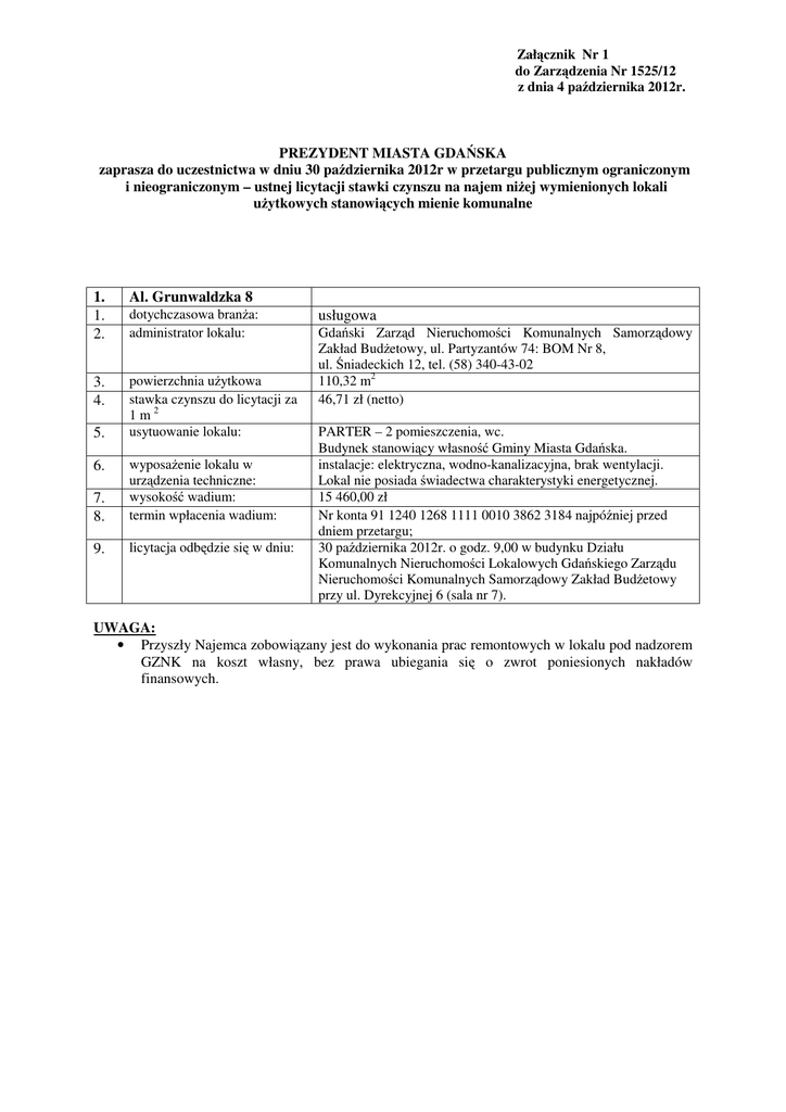 Załącznik Nr 1 do Zarządzenia Nr 1525/12 z dnia 4 października 2012r. PREZYDENT MIASTA GDAŃSKA zaprasza do uczestnictwa w dniu 30 października 2012r w przetargu publicznym ograniczonym i nieograniczonym – ustnej licytacji stawki czynszu na najem niżej wymienionych lokali użytkowych stanowiących mienie komunalne 1. 1. 2. 3. 4. 5. Al. Grunwaldzka 8 dotychczasowa branża: administrator lokalu: powierzchnia użytkowa stawka czynszu do licytacji za 1m2 usytuowanie lokalu: 7. 8. wyposażenie lokalu w urządzenia techniczne: wysokość wadium: termin wpłacenia wadium: 9. licytacja odbędzie się w dniu: 6. usługowa Gdański Zarząd Nieruchomości Komunalnych Samorządowy Zakład Budżetowy, ul. Partyzantów 74: BOM Nr 8, ul. Śniadeckich 12, tel. (58) 340-43-02 110,32 m2 46,71 zł (netto) PARTER – 2 pomieszczenia, wc. Budynek stanowiący własność Gminy Miasta Gdańska. instalacje: elektryczna, wodno-kanalizacyjna, brak wentylacji. Lokal nie posiada świadectwa charakterystyki energetycznej. 15 460,00 zł Nr konta 91 1240 1268 1111 0010 3862 3184 najpóźniej przed dniem przetargu; 30 października 2012r. o godz. 9,00 w budynku Działu Komunalnych Nieruchomości Lokalowych Gdańskiego Zarządu Nieruchomości Komunalnych Samorządowy Zakład Budżetowy przy ul. Dyrekcyjnej 6 (sala nr 7). UWAGA: • Przyszły Najemca zobowiązany jest do wykonania prac remontowych w lokalu pod nadzorem GZNK na koszt własny, bez prawa ubiegania się o zwrot poniesionych nakładów finansowych. 2. 1. 2. 3. 4. 5. Al. Grunwaldzka 126 i 128 dotychczasowa branża: administrator lokalu: powierzchnia użytkowa stawka czynszu do licytacji za 1m2 usytuowanie lokalu: 7. 8. wyposażenie lokalu w urządzenia techniczne: wysokość wadium: termin wpłacenia wadium: 9. licytacja odbędzie się w dniu: 10. zarządca budynku: 6. handlowa Gdański Zarząd Nieruchomości Komunalnych Samorządowy Zakład Budżetowy, ul. Partyzantów 74: BOM Nr 6, ul. Batorego 12, tel. (58) 522-00-52 130,92 m2 46,71 zł (netto) PARTER – 4 pomieszczenia, przedsionek, wc. PIWNICA – 1 pomieszczenie o powierzchni 29,97m². Lokal położony na dwóch odrębnych działkach – dwie Wspólnoty Mieszkaniowe tj.: Grunwaldzka 126 – 45,14m², Grunwaldzka 128 – 85,78m². Budynek stanowiący współwłasność osób fizycznych i Gminy Miasta Gdańska (wspólnota mieszkaniowa)*. instalacje: elektryczna, wodno-kanalizacyjna, c.o. Lokal nie posiada świadectwa charakterystyki energetycznej. 18 346,00 zł Nr konta 91 1240 1268 1111 0010 3862 3184 najpóźniej przed dniem przetargu; 30 października 2012r. o godz. 9,20 w budynku Działu Komunalnych Nieruchomości Lokalowych Gdańskiego Zarządu Nieruchomości Komunalnych Samorządowy Zakład Budżetowy przy ul. Dyrekcyjnej 6 (sala nr 7). „EUROFORMAT” Sp. z o.o. Zarządzanie Nieruchomościami Mieszkalnymi, ul. Sobótki 1/4, Gdańsk, tel. (58) 344-68-93 UWAGA: • Przyszły Najemca zobowiązany jest do wykonania prac remontowych w lokalu, pod nadzorem GZNK oraz w uzgodnieniu ze Wspólnotami Mieszkaniowymi na koszt własny, bez prawa ubiegania się o zwrot poniesionych nakładów finansowych. • W lokalu znajduje się wyłączony z eksploatacji dźwig towarowy. Uruchomienie dźwigu może nastąpić po uzgodnieniu warunków technicznych wydanych przez Dział Energetyczny GZNK SZB. • Do czasu rozstrzygnięcia postępowania przetargowego w lokalu pozostają ruchomości, które nie są przedmiotem przetargu. • Lokal zostanie opróżniony przez dotychczasowego użytkownika, po wyłonieniu przyszłego Najemcy. • W przypadku nie opróżnienia lokalu, przez dotychczasowego użytkownika w terminie 1 miesiąca od daty rozstrzygnięcia przetargu oferentowi, który wygrał przetarg nie służy prawo zawarcia umowy, a zwrot wadium, wraz z odsetkami wynikającymi z umowy rachunku bankowego, na którym było ono przechowywane, pomniejszone o koszty prowadzenia rachunku bankowego oraz prowizji bankowej za przelew pieniędzy na rachunek bankowy wskazany przez oferenta, następuje w terminie 3 dni roboczych od daty złożenia wniosku o zwrot. 3. 1. 2. 3. 4. 5. Biskupia 31 dotychczasowa branża: administrator lokalu: powierzchnia użytkowa stawka czynszu do licytacji za 1m2 usytuowanie lokalu: 7. 8. wyposażenie lokalu w urządzenia techniczne: wysokość wadium: termin wpłacenia wadium: 9. licytacja odbędzie się w dniu: 6. usługowa Gdański Zarząd Nieruchomości Komunalnych Samorządowy Zakład Budżetowy, ul. Partyzantów 74: BOM Nr 2, ul. Zielona 8/9, tel. (58) 301-19-53 98,52 m2 10,00 zł (netto) PARTER – 4 pomieszczenia, wc. PIWNICA – 1 pomieszczenie o powierzchni 35,00m². Budynek stanowiący własność Gminy Miasta Gdańska. instalacje: elektryczna, wodno-kanalizacyjna. Lokal nie posiada świadectwa charakterystyki energetycznej. 2 956,00 zł Nr konta 91 1240 1268 1111 0010 3862 3184 najpóźniej przed dniem przetargu; 30 października 2012r. o godz. 9,40 w budynku Działu Komunalnych Nieruchomości Lokalowych Gdańskiego Zarządu Nieruchomości Komunalnych Samorządowy Zakład Budżetowy przy ul. Dyrekcyjnej 6 (sala nr 7). UWAGA: • Przyszły Najemca zobowiązany jest do wykonania prac remontowych w lokalu pod nadzorem GZNK na koszt własny, bez prawa ubiegania się o zwrot poniesionych nakładów finansowych. 4. 1. 2. 3. 4. 5. Do Studzienki 16 dotychczasowa branża: administrator lokalu: powierzchnia użytkowa stawka czynszu do licytacji za 1m2 usytuowanie lokalu: 6. wyposażenie lokalu w urządzenia techniczne: 7. 8. wysokość wadium: termin wpłacenia wadium: 9. licytacja odbędzie się w dniu: biurowa Gdański Zarząd Nieruchomości Komunalnych Samorządowy Zakład Budżetowy, ul. Partyzantów 74: BOM Nr 8, ul. Śniadeckich 12, tel. (58) 520-43-32 212,76 m2 10,00 zł (netto) PARTER – 10 pomieszczeń, 3 korytarze, 2 wc. Dzierżawa przynależnego terenu 71m², w tym rampa 21,00m². Budynek stanowiący własność Gminy Miasta Gdańska. instalacje: elektryczna, wodociągowa, kanal