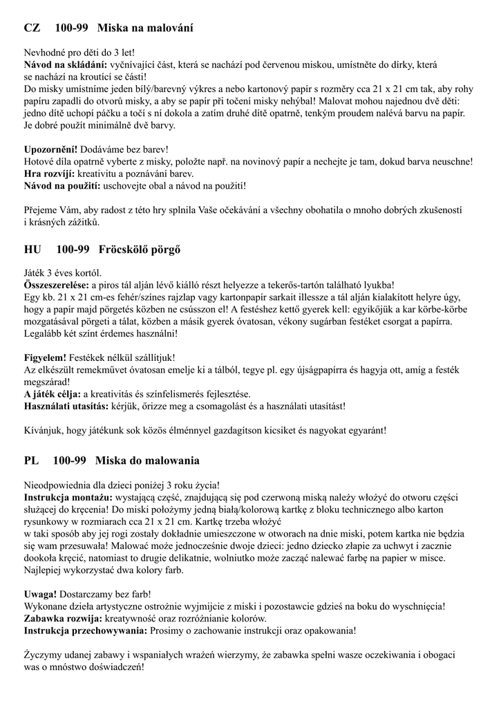 CZ 100-99 Miska na malování Nevhodné pro děti do 3 let! Návod na skládání: vyčnívající část, která se nachází pod červenou miskou, umístněte do dírky, která se nachází na kroutící se části! Do misky umístníme jeden bílý/barevný výkres a nebo kartonový papír s rozměry cca 21 x 21 cm tak, aby rohy papíru zapadli do otvorů misky, a aby se papír při točení misky nehýbal! Malovat mohou najednou dvě děti: jedno dítě uchopí páčku a točí s ní dokola a zatím druhé dítě opatrně, tenkým proudem nalévá barvu na papír. Je dobré použít minimálně dvě barvy. Upozornění! Dodáváme bez barev! Hotové díla opatrně vyberte z misky, položte např. na novinový papír a nechejte je tam, dokud barva neuschne! Hra rozvíjí: kreativitu a poznávání barev. Návod na použití: uschovejte obal a návod na použití! Přejeme Vám, aby radost z této hry splnila Vaše očekávání a všechny obohatila o mnoho dobrých zkušeností i krásných zážitků. HU 100-99 Fröcskölő pörgő Játék 3 éves kortól. Összeszerelése: a piros tál alján lévő kiálló részt helyezze a tekerős-tartón található lyukba! Egy kb. 21 x 21 cm-es fehér/színes rajzlap vagy kartonpapír sarkait illessze a tál alján kialakított helyre úgy, hogy a papír majd pörgetés közben ne csússzon el! A festéshez kettő gyerek kell: egyikőjük a kar körbe-körbe mozgatásával pörgeti a tálat, közben a másik gyerek óvatosan, vékony sugárban festéket csorgat a papírra. Legalább két színt érdemes használni! Figyelem! Festékek nélkül szállítjuk! Az elkészült remekművet óvatosan emelje ki a tálból, tegye pl. egy újságpapírra és hagyja ott, amíg a festék megszárad! A játék célja: a kreativitás és színfelismerés fejlesztése. Használati utasítás: kérjük, őrizze meg a csomagolást és a használati utasítást! Kívánjuk, hogy játékunk sok közös élménnyel gazdagítson kicsiket és nagyokat egyaránt! PL 100-99 Miska do malowania Nieodpowiednia dla dzieci poniżej 3 roku życia! Instrukcja montażu: wystającą część, znajdującą się pod czerwoną miską należy włożyć do otworu części służącej do kręcenia! Do miski położymy jedną białą/kolorową kartkę z bloku technicznego albo karton rysunkowy w rozmiarach cca 21 x 21 cm. Kartkę trzeba włożyć w taki sposób aby jej rogi zostały dokładnie umieszczone w otworach na dnie miski, potem kartka nie będzia się wam przesuwała! Malować może jednocześnie dwoje dzieci: jedno dziecko złapie za uchwyt i zacznie dookoła kręcić, natomiast to drugie delikatnie, wolniutko może zacząć nalewać farbę na papier w misce. Najlepiej wykorzystać dwa kolory farb. Uwaga! Dostarczamy bez farb! Wykonane dzieła artystyczne ostrożnie wyjmijcie z miski i pozostawcie gdzieś na boku do wyschnięcia! Zabawka rozwija: kreatywność oraz rozróżnianie kolorów. Instrukcja przechowywania: Prosimy o zachowanie instrukcji oraz opakowania! Życzymy udanej zabawy i wspaniałych wrażeń wierzymy, że zabawka spełni wasze oczekiwania i obogaci was o mnóstwo doświadczeń! RO 100-99 Picasso rotativ Recomandat copiilor peste 3 ani. Asamblare: introduceţi mânerul castronului roşu în orificiul rotativ! Fixaţi colţurile unei foaie de desen sau foaie de carton de mărimea cca. 21 x 21 cm în locul indicat în castron, astfel încât în timpul rotaţiei să nu alunece! Pentru a picta aveți nevoie de doi copii: unul învârte castronul de mâner, iar celălalt scurge încet vopseaua pe foaie. Este indicat să folosiţi cel puţin două culori! Atenţie! Livrăm fără vopsea! Capodopera scoateți cu grijă din tavă, puneți-o de ex. pe un ziar şi lăsați să se usuce! Scopul jocului: dezvoltă creativitatea şi recunoaşterea culorilor. Instrucţiuni de utilizare: Vă rugăm păstraţi ambalajul şi instrucţiunile de utilizare! Distracţie plăcută! SK 100-99 Miska na maľovanie Nevhodné pre deti do 3 rokov! Návod na skladanie: vyčnievajúcu časť, ktorá sa nachádza pod červenou miskou, umiestnite do dierky, ktorá sa nachádza na krútiacej sa časti! Do misky umiestnime jeden biely/farebný výkres alebo kartónový papier s rozmermi cca 21 x 21 cm tak, aby rohy papiera zapadli do otvorov misky a aby sa papier pri točení misky nehýbal! Maľovať môžu naraz dve deti: jedno dieťa uchopí páčku a točí ňou dookola, zatiaľ čo druhé dieťa opatrne, tenkým prúdom nalieva farbu na papier. Je dobré použiť minimálne dve farby. Upozornenie! Dodávame bez farieb! Hotové diela opatrne vyberte z misky, položte napr. na novinový papier a nechajte ich tam, kým farba neuschne! Hra rozvíja: kreativitu a rozoznávanie farieb. Návod na použitie: uchovajte obal a návod na použitie! Prajeme Vám, aby radosť z tejto hry splnila Vaše očakávania a obohatila všetkých o veľa dobrých skúseností ako i krásnych zážitkov. SLO 100-99 Posoda za barve Ni primerno za otroke pod 3 leta! Uporaba: Na dno rdeče poosde postvaite podlago na kateri želite ustvarjati. Velikost podlage za risanje je lahko velika pribl. 21 x 21 cm. Podlaga je lahko papir ali karton. Podlago zataknite, da se vam ne izmuzne med vrtenjem. Ustvarjanje z barvnim vrtiljakom je timsko delo dveh oseb. Ena oseba posodo vrti, medtem ko druga nanaša barvo. Lahko ustvarite večplastno sliko! Opozorilo! Izdelek je na voljo brez barv! Končano mojstrovino previdno odstranite iz posode, odložite npr na časopisni papir in pustite da se posuši! Cilj igre: razvija ustvarjalnost in prepoznavanje barv. Navodila za uporabo: Prosimo obdržite originalna embalažo in navodila za morebitno korespondenco. Upamo, da bo igra v veselje za male velike!