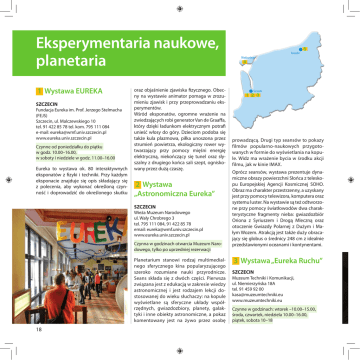 Eksperymentaria naukowe, planetaria 1 Wystawa EUREKA SZCZECIN Fundacja Eureka im. Prof. Jerzego Stelmacha (FEJS) Szczecin, ul. Malczewskiego 10 tel. 91 422 85 78 tel. kom. 795 111 084 e-mail: [email protected] www.eureka.univ.szczecin.pl Czynne od poniedziałku do piątku w godz. 10.00–16.00, w soboty i niedziele w godz. 11.00–16.00 Eureka to wystawa ok. 80 interaktywnych eksponatów z fizyki i techniki. Przy każdym eksponacie znajduje się opis składający się z polecenia, aby wykonać określoną czynność i doprowadzić do określonego skutku oraz objaśnienie zjawiska fizycznego. Obecny na wystawie animator pomaga w zrozumieniu zjawisk i przy przeprowadzaniu eksperymentów. Wśród eksponatów, ogromne wrażenie na zwiedzających robi generator Van de Graaffa, który dzięki ładunkom elektrycznym potrafi unieść włosy do góry. Dzieciom podoba się także kula plazmowa, piłka unoszona przez strumień powietrza, ekologiczny rower wytwarzający przy pomocy mięśni energię elektryczną, niekończący się tunel oraz słyszalny z drugiego końca sali szept, ogniskowany przez dużą czaszę. 2 Wystawa „Astronomiczna Eureka” SZCZECIN Wieża Muzeum Narodowego ul. Wały Chrobrego 3 tel. 795 111 084, 91 422 85 78 email: [email protected] www.eureka.univ.szczecin.pl Czynna w godzinach otwarcia Muzeum Narodowego, tylko po uprzedniej rezerwacji Planetarium stanowi rodzaj multimedialnego sferycznego kina popularyzującego szeroko rozumiane nauki przyrodnicze. Seans składa się z dwóch części. Pierwsza związana jest z edukacją w zakresie wiedzy astronomicznej i jest rodzajem lekcji dostosowanej do wieku słuchaczy: na kopule wyświetlane są sferyczne układy współrzędnych, gwiazdozbiory, planety, galaktyki i inne obiekty astronomiczne, a pokaz komentowany jest na żywo przez osobę 18 Koszalin 5 Międzyzdroje 4 Szczecin 1 2 3 prowadzącą. Drugi typ seansów to pokazy filmów popularno-naukowych przygotowanych w formie do wyświetlania na kopule. Widz ma wrażenie bycia w środku akcji filmu, jak w kinie IMAX. Oprócz seansów, wystawa prezentuje dynamiczne obrazy powierzchni Słońca z teleskopu Europejskiej Agencji Kosmicznej SOHO. Obraz ma charakter przestrzenny, a uzyskany jest przy pomocy telewizora, komputera oraz systemu luster. Na wystawie są też odtworzone przy pomocy światłowodów dwa charakterystyczne fragmenty nieba: gwiazdozbiór Oriona z Syriuszem i Drogą Mleczną oraz otoczenie Gwiazdy Polarnej z Dużym i Małym Wozem. Atrakcją jest także duży obracający się globus o średnicy 248 cm z idealnie przedstawionymi oceanami i kontynentami. 3 Wystawa „Eureka Ruchu” SZCZECIN Muzeum Techniki i Komunikacji, ul. Niemierzyńska 18A tel. 91 459 92 00 [email protected] www.muzeumtechniki.eu Czynne w godzinach: wtorek –10.00–15.00, środa, czwartek, niedziela 10.00–16.00, piątek, sobota 10–18