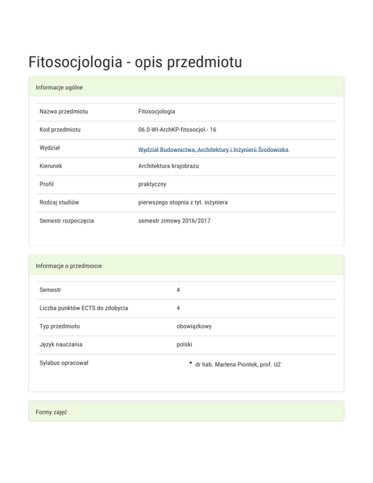 Fitosocjologia - opis przedmiotu Informacje ogólne Nazwa przedmiotu Fitosocjologia Kod przedmiotu 06.0-WI-ArchKP-fitosocjol.- 16 Wydział Wydział Budownictwa, Architektury i Inżynierii Środowiska Kierunek Architektura krajobrazu Profil praktyczny Rodzaj studiów pierwszego stopnia z tyt. inżyniera Semestr rozpoczęcia semestr zimowy 2016/2017 Informacje o przedmiocie Semestr 4 Liczba punktów ECTS do zdobycia 4 Typ przedmiotu obowiązkowy Język nauczania polski Sylabus opracował Formy zajęć dr hab. Marlena Piontek, prof. UZ Forma zajęć Liczba godzin Liczba godzin Liczba godzin w Liczba godzin w Forma w semestrze w tygodniu semestrze tygodniu zaliczenia (stacjonarne) (stacjonarne) (niestacjonarne) (niestacjonarne) Wykład 30 2 18 1,2 Egzamin Laboratorium 30 2 18 1,2 Zaliczenie na ocenę Cel przedmiotu Celem przedmiotu jest przedstawienie możliwości badania inwentaryzacji szaty roślinnej Polski na potrzeby architektury krajobrazu. Przedstawienie możliwości oceny szaty roślinne na potrzeby projektowania i planowania przestrzennego. Wymagania wstępne Formalne: zaliczenie przedmiotów: Ekologia, Gleboznawstwo, Biologia roślin Nieformalne: brak Zakres tematyczny Program wykładów: Wartość informacyjna roślinności jako składnika krajobrazu. Charakterystyka statystyczna i elementy flory polskiej. Czynniki naturalne wpływające na rozmieszczenie geograficzne roślin w Polsce. Wpływ człowieka na szatę roślinną – flora synantropijna. Zasady systematyki fitosocjologicznej i identyfikacji zbiorowisk roślinnych. Przegląd wybranych zbiorowisk roślinnych. Wykorzystanie fitosocjologii w architekturze krajobrazu. Ocena przydatności zbiorowisk roślinnych do różnych funkcji. Szata roślinna jako wskaźnik warunków środowiska przyrodniczego, wskaźnik antropogenicznych przekształceń środowiska, wskaźnik przydatności terenu do zagospodarowania. Program ćwiczeń laboratoryjnych: Praca z kluczem do oznaczania roślin i kluczem do oznaczania zbiorowisk roślinnych. Poznanie składu i budowy zbiorowisk roślinnych (zbiorowiska, zespoły, formacje roślinne, płat zespołu, ilościowość, towarzyskość, zdjęcie fitosocjologiczne, tabela zespołu). Metodyka badań w terenie. Samodzielne wykonanie zdjęć fitosocjologicznych. Rozpoznanie warunków siedliskowych na podstawie roślinności. Umiejętność oceny stanu roślinności na wybranych przykładach. Klasyczna analiza danych fitosocjologicznych. Cyfrowa analiza danych o roślinności - fitosocjologia numeryczna. Metody kształcenia Metody podające: wykład konwencjonalny, wykład problemowy, wykład z prezentacją multimedialną. Metody poszukujące ćwiczeniowo – praktyczne: zajęcia laboratoryjne Efekty kształcenia i metody weryfikacji osiągania efektów kształcenia Opis efektu Symbole Metody weryfikacji Forma zajęć efektów student zna metody K_W04 egzamin pisemny Wykład K_W04 egzamin pisemny Wykład K_W09 egzamin pisemny Wykład fitosocjologiczne i cechy głównych typów zbiorowisk student opisuje i wyjaśnia zasady funkcjonowania środowiska przyrodniczego jako całości i wskazuje rolę poszczególnych elementów ekosystemów student przedstawia cechy rodzajowe, gatunkowe i odmianowe roślin Opis efektu Symbole Metody weryfikacji Forma zajęć efektów student charakteryzuje zasady K_W11 egzamin pisemny Wykład K_U07 ocena raportów z zajęć Laboratorium K_U08 ocena raportów z zajęć; Laboratorium funkcjonowania naturalnych, półnaturalnych oraz sztucznych układów ekologicznych student przygotowuje w języku polskim i języku obcym opracowania i prezentacje ilustrujące problemy z zakresu fitosocjologii stosowanej (zdjęcie fitosocjologiczne i mapę roślinności rzeczywistej) student wykonuje badania terenowe oraz proste analizy z sprawdzian praktyczny wykorzystaniem technik polowych i laboratoryjnych, prawidłowo interpretuje rezultaty i wyciąga wnioski student potrafi kształtować dobory K_U09 roślinności dostosowane do ocena raportów z zajęć; Laboratorium sprawdzian praktyczny warunków naturalnych student stale pogłębia swoją wiedzę K_K01 konwersacja w trakcie Wykład w zakresie fitosocjologii stosowanej wykładów i ćwiczeń Laboratorium posługując się różnymi nośnikami inicjowana przez informacji prowadzącego; ocena aktywności na zajęciach Warunki zaliczenia Zaliczenie ćwiczeń: podstawą do zaliczenia ćwiczeń laboratoryjnych są oceny z kolokwiów praktycznych i teoretycznych (pisemnych) ze zrealizowanych bloków programowych. Zaliczenie wykładu – warunkiem przystąpienia do egzaminu jest uzyskanie pozytywnej oceny z zajęć laboratoryjnych. Egzamin będzie pisemny, zawierający 8 pytań ocenianych na 0-1 pkt; do zaliczenia na ocenę dostateczną konieczne jest uzyskanie 5 punktów. Ocena końcowa jest średnią ważoną ocen wszystkich elementów składowych kształcenia (uwzględniającą jako wagę liczbę godzin w poszczególnych elementach). Obciążenie pracą Obciążenie pracą Studia Studia niestacjonarne stacjonarne (w godz.) (w godz.) Godziny kontaktowe (udział w zajęciach; konsultacjach; egzaminie, itp.) 65 50 Samodzielna praca studenta (przygotowanie do: zajęć, kolokwium, 45 60 Łącznie 110 110 Punkty ECTS Studia Studia niestacjonarne egzaminu; studiowanie literatury przygotowanie: pracy pisemnej, projektu, prezentacji, raportu, wystąpienia; itp.) stacjonarne Zajęcia z udziałem nauczyciela akademickiego 2 2 Zajęcia bez udziału nauczyciela akademickiego 2 2 Łącznie 4 4 Literatura podstawowa 1. Dzwonko Z., 2007. Przewodnik do badań fitosocjologicznych. Sorus - Instytut Botaniki Uniwersytetu Jagiellońskiego. 2. Matuszkiewicz W. 2012: Przewodnik do oznaczania zbiorowisk roślinnych Polski. PWN. Warszawa. 3. Matuszkiewicz J.M. 2007. Zespoły leśne Polski, PWN Warszawa. 4. Szafer W. , Kulczyński S., Pawłowski B.,1988. Rośliny Polskie, PWN Warszawa. 5. Szafer W., Zarzycki K. 1977. Opracowanie zbiorowe [red.], Szata roślinna Polski