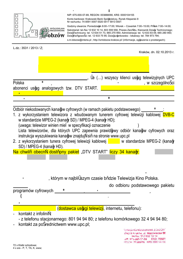 Spół dzielnia Mieszkaniowa „Ł OBZÓW”, 30-019 Kraków, ul. Mazowiecka 66 NIP: 675-000-57-89, REGON: 003888090, KRS: 0000104155 Konto bankowe: Krakowski Bank Spółdzielczy, Rynek Kleparski 8 Nr rachunku: 74 8591 0007 0020 0017 5913 0001 Godziny otwarcia: Poniedziałek 8:00÷17:00; Wtorek ÷ Czwartek 7:00÷15:00; Piątek 7:00÷14:00; Sekretariat: tel./fax 12 632 10 14, 603 559 558, Prezes Zarządu, Kierownik Działu Technicznego; Dział Techniczny: tel. 12 634 51 73, 665 270 950; Administracja: tel. 12 633 83 09, 665 280 950; Dział Księgowości: tel. 12 633 75 95; Dział członkowsko - lokalowy: tel. 784 973 794; [email protected] ; http://smlobzow-krakow.pl/ (informacje, ogłoszenia o przetargach); L.dz.: 3531 / 2013 / Z; Kraków, dn. 02.10.2013 r. Informacja UPC Polska Sp. z o.o. ws. dost pu do telewizji cyfrowej UPC Polska Sp. z o.o. informuje, że (…) wszyscy klienci usług telewizyjnych UPC Polska maj mo*liwoć dost pu do niekodowanych kanałów cyfrowych, w szczególności abonenci usług analogowych tzw. DTV START. Klienci pakietów podstawowych opł acanych w czynszu uzyskali dost p do szerokiego wachlarza nowych kanał ów, w znacznie szerszej ofercie ni* dost pne s w naziemnej telewizji cyfrowej Odbiór niekodowanych kanałów cyfrowych (w ramach pakietu podstawowego) jest mo*liwy: 1. z wykorzystaniem telewizora z wbudowanym tunerem cyfrowej telewizji kablowej DVB-C w standardzie MPEG-2 (kanały SD) / MPEG-4 (kanały HD); (uwaga: telewizor winien mieć w specyfikacji oznaczenie DVB-T / DVB-C) Lista telewizorów, dla których UPC zapewnia prawidłowy odbiór kanałów cyfrowych oraz instrukcja wyszukiwania kanałów znajdują się na stronie www.upc.pl 2. z wykorzystaniem tunera cyfrowej telewizji kablowej DVB-C w standardzie MPEG-2 (kanały SD) / MPEG-4 (kanały HD). Na chwilę obecną dostępny pakiet „DTV START” liczy 34 kanały: TVP1, TVP1 HD, TVP2, TVP2 HD, TVP Info, Polsat, TVN, TVN HD, TVN7, TV 4, TV Puls, TVP Rozrywka, TVP Kultura, TVP Historia, TVP Polonia, PULS2, TV6, ATM Rozrywka, TTV, Polsat Sport News, ESKA TV, POLO TV, Polsat2, Superstacja, TVS, TV Trwam, Tele5, religia.tv, 4fun.tv, Mango24, iTV, Galeria UPC, kanałlokalny* oraz kanałpromocyjny, którym w najbliższym czasie będzie Telewizja Kino Polska. Uwaga: Ustawienia odbiorników telewizyjnych do odbioru podstawowego pakietu programów cyfrowych nale*y dokonać we wł asnych zakresie (lub zlecić firmie UPC b d( innej wyspecjalizowanej firmie lub osobie). Zgł aszanie zapyta , problemów technicznych i usterek: UPC Polska Sp. z o.o. (dostawca usługi telewizji, internetu, telefonu): - kontakt z infolinią: - z telefonu stacjonarnego: 801 94 94 80; z telefonu komórkowego 32 4 94 94 80; - kontakt za pośrednictwem www.upc.pl; Rozdzielnik: 72 x Klatki schodowe; 4 x a/a - P, T, TA, K, www; Pakiet podstawowy telewizji UPC (opł acany przy ”czynszu”) Pakiet podstawowy telewizji UPC (opł acany przy ”czynszu”) Odbiornik telewizyjny z ( DVB-T / DVB-C) (obecnie standard) lub tv +dekoder DVB-C; Przykł ad dostrojenia odbiornika oraz parametry dla „r ustawienia 34 programów kablowej cznego szukania” – telewizji cyfrowej: 02.10.2013 r. Zbigniew Radosz