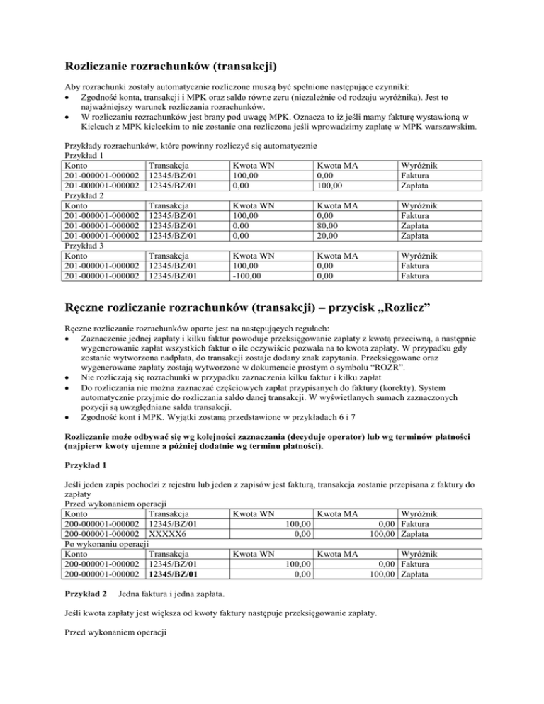 Rozliczanie rozrachunków (transakcji) Aby rozrachunki zostały automatycznie rozliczone muszą być spełnione następujące czynniki: Zgodność konta, transakcji i MPK oraz saldo równe zeru (niezależnie od rodzaju wyróżnika). Jest to najważniejszy warunek rozliczania rozrachunków. W rozliczaniu rozrachunków jest brany pod uwagę MPK. Oznacza to iż jeśli mamy fakturę wystawioną w Kielcach z MPK kieleckim to nie zostanie ona rozliczona jeśli wprowadzimy zapłatę w MPK warszawskim. Przykłady rozrachunków, które powinny rozliczyć się automatycznie Przykład 1 Konto Transakcja Kwota WN Kwota MA 201-000001-000002 12345/BZ/01 100,00 0,00 201-000001-000002 12345/BZ/01 0,00 100,00 Przykład 2 Konto Transakcja Kwota WN Kwota MA 201-000001-000002 12345/BZ/01 100,00 0,00 201-000001-000002 12345/BZ/01 0,00 80,00 201-000001-000002 12345/BZ/01 0,00 20,00 Przykład 3 Konto Transakcja Kwota WN Kwota MA 201-000001-000002 12345/BZ/01 100,00 0,00 201-000001-000002 12345/BZ/01 -100,00 0,00 Wyróżnik Faktura Zapłata Wyróżnik Faktura Zapłata Zapłata Wyróżnik Faktura Faktura Ręczne rozliczanie rozrachunków (transakcji) – przycisk „Rozlicz” Ręczne rozliczanie rozrachunków oparte jest na następujących regułach: Zaznaczenie jednej zapłaty i kilku faktur powoduje przeksięgowanie zapłaty z kwotą przeciwną, a następnie wygenerowanie zapłat wszystkich faktur o ile oczywiście pozwala na to kwota zapłaty. W przypadku gdy zostanie wytworzona nadpłata, do transakcji zostaje dodany znak zapytania. Przeksięgowane oraz wygenerowane zapłaty zostają wytworzone w dokumencie prostym o symbolu “ROZR”. Nie rozliczają się rozrachunki w przypadku zaznaczenia kilku faktur i kilku zapłat Do rozliczania nie można zaznaczać częściowych zapłat przypisanych do faktury (korekty). System automatycznie przyjmie do rozliczania saldo danej transakcji. W wyświetlanych sumach zaznaczonych pozycji są uwzględniane salda transakcji. Zgodność kont i MPK. Wyjątki zostaną przedstawione w przykładach 6 i 7 Rozliczanie może odbywać się wg kolejności zaznaczania (decyduje operator) lub wg terminów płatności (najpierw kwoty ujemne a później dodatnie wg terminu płatności). Przykład 1 Jeśli jeden zapis pochodzi z rejestru lub jeden z zapisów jest fakturą, transakcja zostanie przepisana z faktury do zapłaty Przed wykonaniem operacji Konto Transakcja Kwota WN Kwota MA Wyróżnik 200-000001-000002 12345/BZ/01 100,00 0,00 Faktura 200-000001-000002 XXXXX6 0,00 100,00 Zapłata Po wykonaniu operacji Konto Transakcja Kwota WN Kwota MA Wyróżnik 200-000001-000002 12345/BZ/01 100,00 0,00 Faktura 200-000001-000002 12345/BZ/01 0,00 100,00 Zapłata Przykład 2 Jedna faktura i jedna zapłata. Jeśli kwota zapłaty jest większa od kwoty faktury następuje przeksięgowanie zapłaty. Przed wykonaniem operacji Konto 200-000001-000002 200-000001-000002 Transakcja 12345/BZ/01 ZAPLATAXXX Po wykonaniu operacji Konto Transakcja 200-000001-000002 12345/BZ/01 200-000001-000002 12345/BZ/01 200-000001-000002 ZAPLATAXXX? Kwota WN Kwota MA Wyróżnik 0,00 Faktura 120,00 Zapłata Kwota MA Wyróżnik 0,00 Faktura 100,00 Zapłata 20,00 Zapłata Kwota MA Wyróżnik -120,00 Zapłata 100,00 Zapłata 20,00 Zapłata 100,00 0,00 Kwota WN 100,00 0,00 Wygenerowane zapisy w dokumencie ROZR Konto Transakcja Kwota WN 200-000001-000002 ZAPLATAXXX 200-000001-000002 12345/BZ/01 200-000001-000002 ZAPLATAXXX? 0,00 0,00 0,00 Jeśli kwota zapłaty jest mniejsza lub równa kwocie faktury następuje przepisanie transakcji z faktury do zapłaty. Przed wykonaniem operacji Konto Transakcja 200-000001-000002 12345/BZ/01 200-000001-000002 ZAPLATAXXX Po wykonaniu operacji Konto Transakcja 200-000001-000002 12345/BZ/01 200-000001-000002 12345/BZ/01 Przykład 3 Kwota WN Kwota MA Wyróżnik 0,00 Faktura 100,00 Zapłata Kwota MA Wyróżnik 0,00 Zapłata 100,00 Zapłata 100,00 0,00 Kwota WN 100,00 0,00 Jedna faktura i kilka zapłat. Jeśli suma zapłat jest mniejsza lub równa kwocie faktur następuje przepisanie transakcji z faktury do zapłaty Przed wykonaniu operacji Konto Transakcja 200-000001-000002 12345/BZ/01 200-000001-000002 ZAPLATA1 200-000001-000002 ZAPLATA2 201-000001-000002 ZAPLATA3 Po wykonaniu operacji Konto Transakcja 200-000001-000002 12345/BZ/01 200-000001-000002 12345/BZ/01 200-000001-000002 12345/BZ/01 200-000001-000002 12345/BZ/01 Kwota WN 0,00 20,00 120,00 -20,00 Wyróżnik Faktura Zapłata Zapłata Zapłata 0,00 20,00 120,00 -20,00 Wyróżnik Faktura Zapłata Zapłata Zapłata Kwota MA 120,00 0,00 0,00 0,00 Kwota WN Kwota MA 120,00 0,00 0,00 0,00 Jeśli suma zapłat jest większa od kwoty faktury następuje przeksięgowanie zapłaty, która spowoduje przekroczenie kwoty faktury (zapłaty pobierane są wg. daty zapłaty) Przed wykonaniu operacji Konto Transakcja 200-000001-000002 12345/BZ/01 200-000001-000002 ZAPLATA1 200-000001-000002 ZAPLATA2 200-000001-000002 ZAPLATA3 Po wykonaniu operacji Konto Transakcja Kwota WN Kwota MA 120,00 0,00 0,00 0,00 Kwota WN 0,00 20,00 200,00 30,00 Kwota MA Wyróżnik Faktura Zapłata Zapłata Zapłata Wyróżnik 200-000001-000002 200-000001-000002 200-000001-000002 200-000001-000002 200-000001-000002 12345/BZ/01 12345/BZ/01 12345/BZ/01 ZAPLATA2? ZAPLATA3 120,00 0,00 0,00 0,00 Wygenerowane zapisy w dokumencie ROZR Konto Transakcja Kwota WN 200-000001-000002 ZAPLATA2 200-000001-000002 12345/BZ/01 200-000001-000002 ZAPLATA2? Przykład 4 0,00 20,00 100,00 100,00 30,00 Kwota MA 0,00 0,00 0,00 Faktura Zapłata Zapłata Zapłata Zapłata Wyróżnik -200,00 Zapłata 100,00 Zapłata 100,00 Zapłata Kilka faktur i jedna zapłata Jeśli suma zapłat jest równa kwocie faktur następuje przeksięgowanie zapłaty Przed wykonaniu operacji Konto Transakcja 200-000001-000002 12345/BZ/01 200-000001-000002 54321/BZ/01 200-000001-000002 66666/BZ/01 200-000001-000002 ZAPLATA1 Po wykonaniu operacji Konto Transakcja 200-000001-000002 12345/BZ/01 200-000001-000002 12345/BZ/01 200-000001-000002 5
