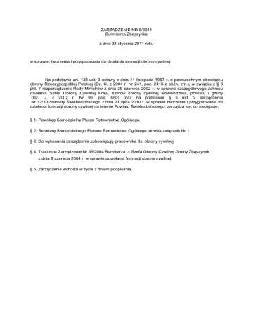 ZARZĄDZENIE NR 6/2011 Burmistrza Zbąszynka z dnia 31 stycznia 2011 roku w sprawie: tworzenia i przygotowania do działania formacji obrony cywilnej. Na podstawie art. 138 ust. 3 ustawy z dnia 11 listopada 1967 r. o powszechnym obowiązku obrony Rzeczypospolitej Polskiej (Dz. U. z 2004 r. Nr 241, poz. 2416 z późn. zm.), w związku z § 3 pkt. 7 rozporządzenia Rady Ministrów z dnia 25 czerwca 2002 r. w sprawie szczegółowego zakresu działania Szefa Obrony Cywilnej Kraju, szefów obrony cywilnej województwa, powiatu i gminy (Dz. U. z 2002 r. Nr 96, poz. 850) oraz na podstawie § 5 ust. 2 zarządzenia Nr 12/10 Starosty Świebodzińskiego z dnia 21 lipca 2010 r. w sprawie tworzenia i przygotowania do działania formacji obrony cywilnej na terenie Powiatu Świebodzińskiego. zarządza się, co następuje: § 1. Powołuję Samodzielny Pluton Ratownictwa Ogólnego. § 2. Strukturę Samodzielnego Plutonu Ratownictwa Ogólnego określa załącznik Nr 1. § 3. Do wykonania zarządzenia zobowiązuję pracownika ds. obrony cywilnej. § 4. Traci moc Zarządzenie Nr 35/2004 Burmistrza – Szefa Obrony Cywilnej Gminy Zbąszynek z dnia 9 czerwca 2004 r. w sprawie powołania formacji obrony cywilnej. § 5. Zarządzenie wchodzi w Ŝycie z dniem podpisania. Załącznik Nr 1 do zarządzenia Nr 6/2011 Burmistrza Zbąszynka z dnia 31 stycznia 2011 roku STRUKTURA SAMODZIELNEGO PLUTONU RATOWNICTWA OGÓLNEGO (stan osobowy 46 osób) Z-ca Komendanta 1 Komendant 1 DruŜyna Ratownictwa Ogólnego DruŜyna Sanitarna Obsługująca Zastępcze Miejsce Szpitalne Komendant 1 Komendant 1 Kierowca 1 Ratownicy 6 Razem: 8 osób Z – ca Komendanta (lekarz medycyny) 1 Grupa medyczna: - lekarz medycyny 1 - lekarz stomatolog 1 - pielęgniarki 6 Grupa obsługi: - kucharki 4 - salowe 4 - kierowca-zaopatrzeniowiec 1 - konserwator 1 Razem: 20 osób DruŜyna PoŜarnicza DruŜyna Porządkowo – Ochronna Komendant 1 Komendant 1 Kierowca 1 Kierowca 1 Ratownicy 6 Wartownik 6 Razem: 8 osób Razem: 8 osób