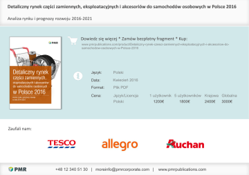 Detaliczny rynek części zamiennych, eksploatacyjnych i akcesoriów do samochodów osobowych w Polsce 2016 Analiza rynku i prognozy rozwoju 2016-2021 Dowiedz się więcej * Zamów bezpłatny fragment * Kup: www.pmrpublications.com/product/Detaliczny-rynek-czesci-zamiennych-eksploatacyjnych-i-akcesoriow-dosamochodow-osobowych-w-Polsce-2016 Język: Polski Data: Kwiecień 2016 Format: Plik PDF Cena: Język/Licencja Polski 1 użytkownik 5 użytkowników Krajowa Globalna 1200€ 1800€ 2400€ Zaufali nam: +48 12 340 51 30 | [email protected] | www.pmrpublications.com 3000€ Detaliczny rynek części zamiennych, eksploatacyjnych i akcesoriów do samochodów osobowych w Polsce 2016 Analiza rynku i prognozy rozwoju 2016-2021 Jakie informacje zawiera ten raport? Kto skorzysta z tej analizy? Kadra kierownicza, managerska, działy marketingu firm obecnych na rynku lub planujących wejść na ten rynek Wartość i analiza rynku detalicznego części zamiennych, eksploatacyjnych i akcesoriów do samochodów osobowych w latach 2012-2015 Producenci i dystrybutorzy produktów i sprzętu dla rynku części zamiennych, eksploatacyjnych i akcesoriów Wartość i analiza segmentów: części zamiennych oraz części eksploatacyjnych i akcesoriów Firmy konsultingowe, badawcze i analityczne Prognozy wartości rynku na lata 2016-2021 Instytucje rządowe, izby handlowe, organizacje branżowe, instytucje finansowe Opis najważniejszych trendów rynkowych, w tym zmiany preferencji konsumentów, zmiany prawne, wpływ sytuacji makroekonomicznej na rynek Producenci i dystrybutorzy nowych opon do aut osobowych Analiza rozwoju najważniejszych kanałów dystrybucji Wartość i analiza detalicznej sprzedaży internetowej części zamiennych, eksploatacyjnych i akcesoriów do samochodów osobowych w latach 2012-2015, wraz z prognozą na lata 2016-2018 Sklepy i platformy internetowe Dlaczego warto kupić ten raport? Pomoże stworzyć strategię rozwoju biznesu Urealni dane w biznesplanach i budżetach Analiza segmentu nowych opon do aut osobowych, w tym wartość segmentu w latach 2012-2015, wraz z prognozą na lata 2016-2018 oraz wartość sprzedaży nowych opon przez Internet w tym samym okresie Umożliwi monitoring rynku i jego potencjału rozwojowego Informacje o ponad 50 firmach aktywnych na tym rynku Zmniejszy ryzyko inwestycyjne np. w czasie wchodzenia na nowy rynek, fuzji lub przejęcia +48 12 340 51 30 | [email protected] | Usprawni przeprowadzanie analiz otoczenia konkurencyjnego www.pmrpublications.com