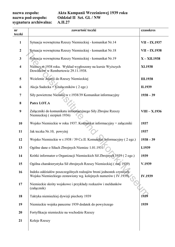 nazwa zespołu: nazwa pod-zespołu: sygnatura archiwalna: Akta Kampanii Wrześniowej 1939 roku Oddział II Szt. Gł. / NW A.II.27 zawartość teczki nr teczki czasokres 1 Sytuacja wewnętrzna Rzeszy Niemieckiej - komunikat Nr.14 VII – IX.1937 2 Sytuacja wewnętrzna Rzeszy Niemieckiej - komunikat Nr.18 VII – IX.1938 e Th Sytuacja wewnętrzna Rzeszy Niemieckiej - komunikat Nr.19 X – XII.1938 4 Niemcy w 1938 roku. Wykład wygłoszony na kursie Wyższych Dowódców w Rembertowie 29.11.1938. XI.1938 5 Wcielenie Austrii do Rzeszy Niemieckiej III.1938 6 Akcja Sudecka + 8 załączników ( 2 egz.) II.1939 7 Siły powietrzne Niemiec w r.1938/39 Komunikat informacyjny 8 Patrz LOT.A 9 Załączniki do komunikatu informacyjnego Siły Zbrojne Rzeszy Niemieckiej ( sierpień 1936) VIII – X.1936 10 Wojsko Niemieckie w roku 1937. Komunikat informacyjny + załączniki 1937 11 Jak teczka Nr.10, powyżej 1937 12 Wojsko Niemieckie w r.1938 / 39 Cz.II. Komunikat Informacyjny ( 2 egz.) 13 Ogólne dane o Siłach Zbrojnych Niemiec 1.01.1931 14 Krótki informator o Organizacji Niemieckich Sił Zbrojnych 1939 ( 2 egz.) 1939 15 Ogólna charakterystyka Sił zbrojnych Rzeszy Niemieckiej ( maj 1939) V.1939 16 Indeks oddziałów poszczególnych rodzajów broni jednostek czynnych Wojska Niemieckiego zestawiony wg. kolejnych numerów ( IV.1939) IV.1939 h lis Po 3 In 1938 – 39 t itu st e d an ko Si I.1939 Niemieckie skróty wojskowe i przykłady rozkazów i meldunków (załącznik) 18 Taktyka niemieckiej dywizji piechoty 1939 19 Niemieckie wojska pancerne 1939 dodatek do powyższego 20 Fortyfikacje niemieckie na wschodzie Rzeszy 21 Koleje Rzeszy m eu us M ki rs 17 1938 – 39 1939 1939 nazwa zespołu: nazwa pod-zespołu: sygnatura archiwalna: Akta Kampanii Wrześniowej 1939 roku Oddział II Szt. Gł. / NW A.II.27 zawartość teczki nr teczki czasokres Organizacja polityczna, przemysłowa, przemysłu wojennego, Niemców w Słowacji i Gwardii Hlinki w Słowacji 23 Konferencja międzysztabowa z Francuzami 24 Konferencja międzysztabowa z Francuzami 25 Konferencja lotnicza polsko - francuska XII.1938 26 Raport Roczny attaché wojskowego w Berlinie 1938 – 39 27 Raport Roczny attaché wojskowego w Berlinie 1937 28 Raporty attaché wojskowego w Berlinie 29 Depesze ruchu zagranicznego III – VII.1939 30 Możliwości mobilizacyjne, koncentracyjne, transportowe morzem z Rzeszy do Prus Wschodnich wojsk niemieckich IX.1939 31 Możliwości zaskoczenia ( 3 redakcje ) 1939 32 Zadania dla wywiadu - 1.06 – 25.08.1939 V – VI. 1939 33 Luźne sprawozdania informacyjne z placówki Le comte. VI – VIII.1939 34 Syntezy położenia 23.08.1939 - 31.08.1939 35 Codzienne sprawozdania informacyjne nr.117-17B – (06 – 31.08.1939) VIII.1939 36 Wiadomości z odcinka niemieckiego (źródło placówka Le comte) VIII.1939 37 Dziennik wydarzeń sierpień 1939. VIII.1939 38 Sprawozdania Tygodniowe Sam.Ref. "N" oraz ogólne i syntetyczne zestawienia wiadomości z odcinka niemieckiego. IV – VIII.1939 39 Komplet materiałów placówki 0.II w Paryżu (. Le comte )1938. VIII – X.1939 40 Akta Oddziału II:- 31.08.1939 - 17.09.1939 VIII – IX.1939 41 Sprawozdania Informacyjne 1 – 32 - - (1 – 17.IX.1939) Komunikaty Informacyjne 1 - 9 - - (1 – 13.IX.1939) Komunikaty Sytuacyjne 1, 3 - 6 - - (1 – 9.IX.1939) IX.1939 42 Duplikaty z A.II.27/41 e Th 22 IV.1939 VI – VII.1938 h lis Po In 1938 t itu st e d an ko Si VII – VIII.1939 m eu us M ki rs nazwa zespołu: nazwa pod-zespołu: sygnatura archiwalna: Akta Kampanii Wrześniowej 1939 roku Oddział II Szt. Gł. / NW A.II.27 nr teczki zawartość teczki 43 Sytuacja npla. wg. wiadomości Oddz.II Szt.Gł. 1 – 17.IX.1939 44 Niemieckie odezwy do ludności polskiej IX.1939 czasokres e Th Niemiecka tajna instrukcja dla oddziałów działających w Polsce (współpraca z V kolumną) 46 Narastanie koncentracji niemieckiej przeciwko Polsce w okresie kwiecień sierpień 1939. Zestawił mjr.dypl. Jan Sochacki na podstawie dokumentów Oddziału II Szt. NW przechowanych Londynie. 47 Różne. 48 Mapy sytuacyjne 49 Uzupełnienia (wrzesień 1984) Sam. Referat ‘N’:- niemieckie instrukcje, notatki dla Szefa SG z odcinka niemieckiego 1936 – 1939 50 Materiały dotyczące rozwoju Niemieckich Sił Zbrojnych do 1939 r. 51 Komunikaty niemieckiego Naczelnego Dowództwa 1 - 17.IX 1939. i komunikaty prasowe agencji Havas i D.N.B. z 1 i 2.IX.1939. 52 Odezwy sowieckie z 17.IX.1939 53 Inwentarz dokumentów Sam.Ref ‘N’ i przewiezienie dokumentów do Francji. 54 Płk. J. Leśniak. Sprawozdanie z prac Sam Ref N i przewiezienie dokumentów do Francji 55 Duplikaty 56 Raport mjr. S. Orłowskiego do Szefa Wydz.Wyw. 0ddziału II z pobytu na Bliskim Wschodzie 1935 57 Kopie dokumentów niemieckich: 1) 22.IX.1939 – ‘H. Gruppe Nord’ 2) 5 X.1939 – Protokoll, także po rosyjsku 3) 13.VIII.1941 - Sprawy medyczne w Dywizji Piechoty ( niemieckiej ) IV – VIII.1939 h lis Po 45 t itu st In 1936 - 39 e 1939 d an IX.1939 m eu us M ki rs ko Si 1935 1939 1939 1941 nazwa zespołu: nazwa pod-zespołu: sygnatura archiwalna: Akta Kampanii Wrześniowej 1939 roku Oddział II Szt. Gł. / NW A.II.27 zawartość teczki nr teczki czasokres e Th h lis Po t itu st In e d an m eu us M ki rs ko Si