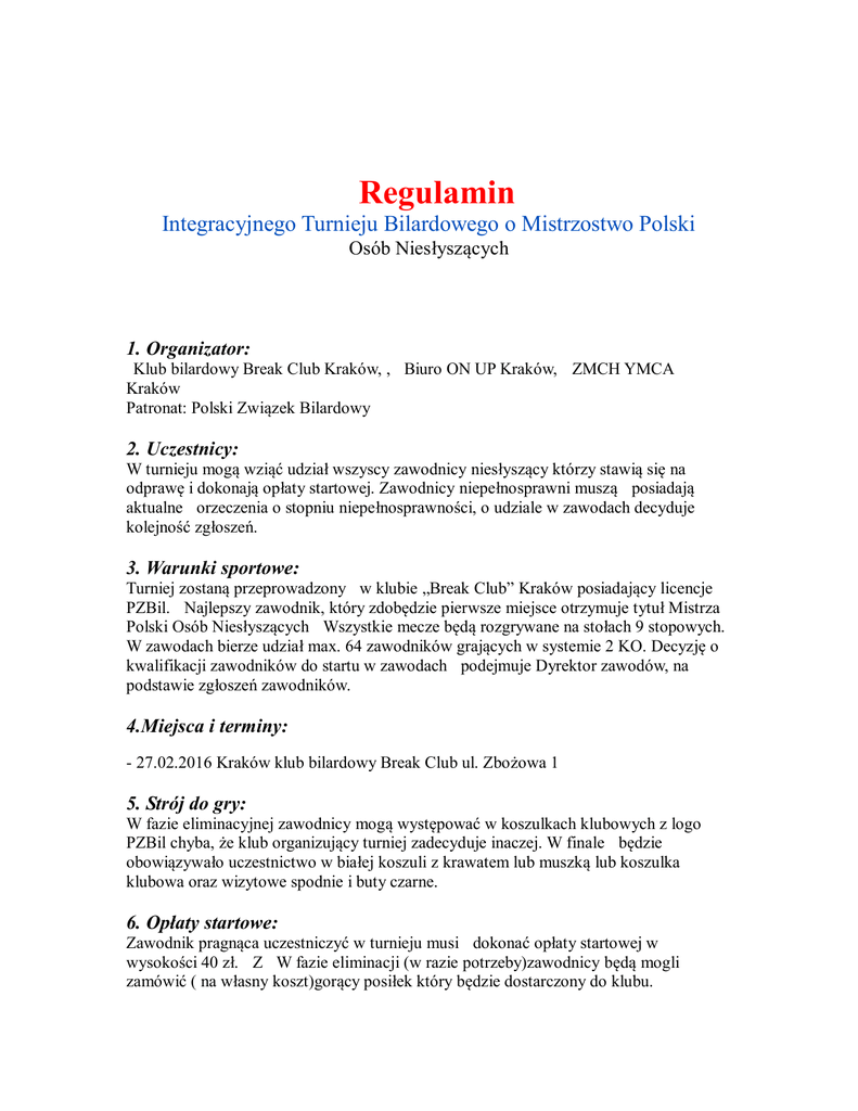 Regulamin Integracyjnego Turnieju Bilardowego o Mistrzostwo Polski Osób Niesłyszących 1. Organizator: Klub bilardowy Break Club Kraków, , Biuro ON UP Kraków, ZMCH YMCA Kraków Patronat: Polski Związek Bilardowy 2. Uczestnicy: W turnieju mogą wziąć udział wszyscy zawodnicy niesłyszący którzy stawią się na odprawę i dokonają opłaty startowej. Zawodnicy niepełnosprawni muszą posiadają aktualne orzeczenia o stopniu niepełnosprawności, o udziale w zawodach decyduje kolejność zgłoszeń. 3. Warunki sportowe: Turniej zostaną przeprowadzony w klubie „Break Club” Kraków posiadający licencje PZBil. Najlepszy zawodnik, który zdobędzie pierwsze miejsce otrzymuje tytuł Mistrza Polski Osób Niesłyszących Wszystkie mecze będą rozgrywane na stołach 9 stopowych. W zawodach bierze udział max. 64 zawodników grających w systemie 2 KO. Decyzję o kwalifikacji zawodników do startu w zawodach podejmuje Dyrektor zawodów, na podstawie zgłoszeń zawodników. 4.Miejsca i terminy: - 27.02.2016 Kraków klub bilardowy Break Club ul. Zbożowa 1 5. Strój do gry: W fazie eliminacyjnej zawodnicy mogą występować w koszulkach klubowych z logo PZBil chyba, że klub organizujący turniej zadecyduje inaczej. W finale będzie obowiązywało uczestnictwo w białej koszuli z krawatem lub muszką lub koszulka klubowa oraz wizytowe spodnie i buty czarne. 6. Opłaty startowe: Zawodnik pragnąca uczestniczyć w turnieju musi dokonać opłaty startowej w wysokości 40 zł. Z W fazie eliminacji (w razie potrzeby)zawodnicy będą mogli zamówić ( na własny koszt)gorący posiłek który będzie dostarczony do klubu. 7. Nagrody W finale Integracyjnego Turnieju o Mistrzostwo Polski dla zwycięzców przewidziano nagrody rzeczowe oraz puchary i medale. 8. Osoby odpowiedzialne za: - zgłoszenia do turnieju: Filip Gałązka Izabella Kaczmarzyk Dyrektorem Turnieju: Sędzia Główny Turnieju: mail: [email protected] mail: [email protected] Andrzej Siejko Sławomir Wolański 9. Marketing i reklama: W trakcie zawodów wyłącznie organizator nadaje prawa do prowadzenia działalności marketingowo-handlowej, prezentacji reklamowej itp. Wszelkie działania podjęte w tym obszarze bez zezwolenia przez firmy lub osoby będą objęte sankcjami. W przypadku zawodników doprowadzi to do wyproszenia z sal gier i dyskwalifikacji, a w przypadku działaczy, trenerów, sędziów do usunięcia z terenu zawodów i skierowaniu sprawy do komisji dyscyplinarnej PZBil. Organizator i PZBil ma prawo wykorzystania zdjęć zawodników zrobionych podczas turnieju dla działalności marketingowej. 10. W sprawach nie uregulowanych niniejszym regulaminem obowiązują przepisy i zarządzenia organizatora, PZBil oraz Dyrektora Turnieju. 11. Zgłoszenia do Integracyjnego Turnieju o Mistrzostwo Polski : Zgłoszenia i wpłatę przesyłać do dnia 10.02.2016 (ostateczny termin): - Filip Gałązka mail: [email protected] - Izabella Kaczmarzyk mail: [email protected]