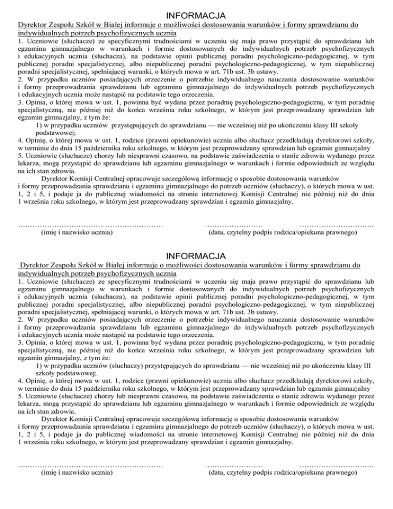 INFORMACJA Dyrektor Zespołu Szkół w Białej informuje o możliwości dostosowania warunków i formy sprawdzianu do indywidualnych potrzeb psychofizycznych ucznia 1. Uczniowie (słuchacze) ze specyficznymi trudnościami w uczeniu się maja prawo przystąpić do sprawdzianu lub egzaminu gimnazjalnego w warunkach i formie dostosowanych do indywidualnych potrzeb psychofizycznych i edukacyjnych ucznia (słuchacza), na podstawie opinii publicznej poradni psychologiczno-pedagogicznej, w tym publicznej poradni specjalistycznej, albo niepublicznej poradni psychologiczno-pedagogicznej, w tym niepublicznej poradni specjalistycznej, spełniającej warunki, o których mowa w art. 71b ust. 3b ustawy. 2. W przypadku uczniów posiadających orzeczenie o potrzebie indywidualnego nauczania dostosowanie warunków i formy przeprowadzania sprawdzianu lub egzaminu gimnazjalnego do indywidualnych potrzeb psychofizycznych i edukacyjnych ucznia może nastąpić na podstawie tego orzeczenia. 3. Opinia, o której mowa w ust. 1, powinna być wydana przez poradnię psychologiczno-pedagogiczną, w tym poradnię specjalistyczną, nie później niż do końca września roku szkolnego, w którym jest przeprowadzany sprawdzian lub egzamin gimnazjalny, z tym że: 1) w przypadku uczniów przystępujących do sprawdzianu — nie wcześniej niż po ukończeniu klasy III szkoły podstawowej; 4. Opinię, o której mowa w ust. 1, rodzice (prawni opiekunowie) ucznia albo słuchacz przedkładają dyrektorowi szkoły, w terminie do dnia 15 października roku szkolnego, w którym jest przeprowadzany sprawdzian lub egzamin gimnazjalny 5. Uczniowie (słuchacze) chorzy lub niesprawni czasowo, na podstawie zaświadczenia o stanie zdrowia wydanego przez lekarza, mogą przystąpić do sprawdzianu lub egzaminu gimnazjalnego w warunkach i formie odpowiednich ze względu na ich stan zdrowia. Dyrektor Komisji Centralnej opracowuje szczegółową informację o sposobie dostosowania warunków i formy przeprowadzania sprawdzianu i egzaminu gimnazjalnego do potrzeb uczniów (słuchaczy), o których mowa w ust. 1, 2 i 5, i podaje ja do publicznej wiadomości na stronie internetowej Komisji Centralnej nie później niż do dnia 1 września roku szkolnego, w którym jest przeprowadzany sprawdzian i egzamin gimnazjalny. …………………………………………………… (imię i nazwisko ucznia) …………………… …………………………. (data, czytelny podpis rodzica/opiekuna prawnego) INFORMACJA Dyrektor Zespołu Szkół w Białej informuje o możliwości dostosowania warunków i formy sprawdzianu do indywidualnych potrzeb psychofizycznych ucznia 1. Uczniowie (słuchacze) ze specyficznymi trudnościami w uczeniu się maja prawo przystąpić do sprawdzianu lub egzaminu gimnazjalnego w warunkach i formie dostosowanych do indywidualnych potrzeb psychofizycznych i edukacyjnych ucznia (słuchacza), na podstawie opinii publicznej poradni psychologiczno-pedagogicznej, w tym publicznej poradni specjalistycznej, albo niepublicznej poradni psychologiczno-pedagogicznej, w tym niepublicznej poradni specjalistycznej, spełniającej warunki, o których mowa w art. 71b ust. 3b ustawy. 2. W przypadku uczniów posiadających orzeczenie o potrzebie indywidualnego nauczania dostosowanie warunków i formy przeprowadzania sprawdzianu lub egzaminu gimnazjalnego do indywidualnych potrzeb psychofizycznych i edukacyjnych ucznia może nastąpić na podstawie tego orzeczenia. 3. Opinia, o której mowa w ust. 1, powinna być wydana przez poradnię psychologiczno-pedagogiczną, w tym poradnię specjalistyczną, nie później niż do końca września roku szkolnego, w którym jest przeprowadzany sprawdzian lub egzamin gimnazjalny, z tym że: 1) w przypadku uczniów (słuchaczy) przystępujących do sprawdzianu — nie wcześniej niż po ukończeniu klasy III szkoły podstawowej; 4. Opinię, o której mowa w ust. 1, rodzice (prawni opiekunowie) ucznia albo słuchacz przedkładają dyrektorowi szkoły, w terminie do dnia 15 października roku szkolnego, w którym jest przeprowadzany sprawdzian lub egzamin gimnazjalny 5. Uczniowie (słuchacze) chorzy lub niesprawni czasowo, na podstawie zaświadczenia o stanie zdrowia wydanego przez lekarza, mogą przystąpić do sprawdzianu lub egzaminu gimnazjalnego w warunkach i formie odpowiednich ze względu na ich stan zdrowia. Dyrektor Komisji Centralnej opracowuje szczegółową informację o sposobie dostosowania warunków i formy przeprowadzania sprawdzianu i egzaminu gimnazjalnego do potrzeb uczniów (słuchaczy), o których mowa w ust. 1, 2 i 5, i podaje ja do publicznej wiadomości na stronie internetowej Komisji Centralnej nie później niż do dnia 1 września roku szkolnego, w którym jest przeprowadzany sprawdzian i egzamin gimnazjalny. …………………………………………………… (imię i nazwisko ucznia) …………………… …………………………. (data, czytelny podpis rodzica/opiekuna prawnego)