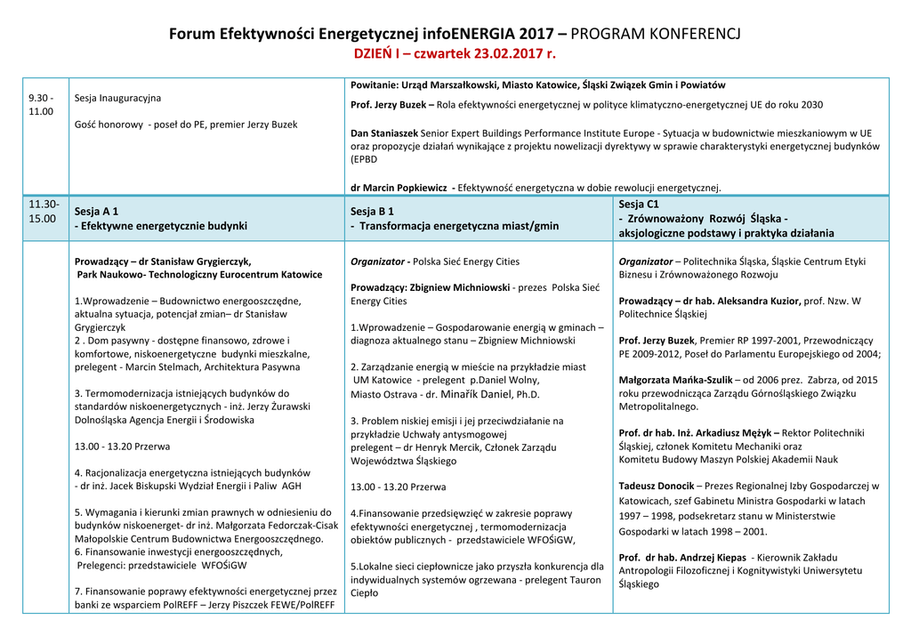 Forum Efektywności Energetycznej infoENERGIA 2017 – PROGRAM KONFERENCJ DZIEŃ I – czwartek 23.02.2017 r. Powitanie: Urząd Marszałkowski, Miasto Katowice, Śląski Związek Gmin i Powiatów 9.30 11.00 Sesja Inauguracyjna Gość honorowy - poseł do PE, premier Jerzy Buzek Prof. Jerzy Buzek – Rola efektywności energetycznej w polityce klimatyczno-energetycznej UE do roku 2030 Dan Staniaszek Senior Expert Buildings Performance Institute Europe - Sytuacja w budownictwie mieszkaniowym w UE oraz propozycje działań wynikające z projektu nowelizacji dyrektywy w sprawie charakterystyki energetycznej budynków (EPBD dr Marcin Popkiewicz - Efektywność energetyczna w dobie rewolucji energetycznej. 11.3015.00 Sesja A 1 - Efektywne energetycznie budynki Sesja B 1 - Transformacja energetyczna miast/gmin Prowadzący – dr Stanisław Grygierczyk, Park Naukowo- Technologiczny Eurocentrum Katowice Organizator - Polska Sieć Energy Cities 1.Wprowadzenie – Budownictwo energooszczędne, aktualna sytuacja, potencjał zmian– dr Stanisław Grygierczyk 2 . Dom pasywny - dostępne finansowo, zdrowe i komfortowe, niskoenergetyczne budynki mieszkalne, prelegent - Marcin Stelmach, Architektura Pasywna 3. Termomodernizacja istniejących budynków do standardów niskoenergetycznych - inż. Jerzy Żurawski Dolnośląska Agencja Energii i Środowiska 13.00 - 13.20 Przerwa 4. Racjonalizacja energetyczna istniejących budynków - dr inż. Jacek Biskupski Wydział Energii i Paliw AGH 5. Wymagania i kierunki zmian prawnych w odniesieniu do budynków niskoenerget- dr inż. Małgorzata Fedorczak-Cisak Małopolskie Centrum Budownictwa Energooszczędnego. 6. Finansowanie inwestycji energooszczędnych, Prelegenci: przedstawiciele WFOŚiGW 7. Finansowanie poprawy efektywności energetycznej przez banki ze wsparciem PolREFF – Jerzy Piszczek FEWE/PolREFF Prowadzący: Zbigniew Michniowski - prezes Polska Sieć Energy Cities 1.Wprowadzenie – Gospodarowanie energią w gminach – diagnoza aktualnego stanu – Zbigniew Michniowski 2. Zarządzanie energią w mieście na przykładzie miast UM Katowice - prelegent p.Daniel Wolny, Miasto Ostrava - dr. Minařík Daniel, Ph.D. 3. Problem niskiej emisji i jej przeciwdziałanie na przykładzie Uchwały antysmogowej prelegent – dr Henryk Mercik, Członek Zarządu Województwa Śląskiego 13.00 - 13.20 Przerwa 4.Finansowanie przedsięwzięć w zakresie poprawy efektywności energetycznej , termomodernizacja obiektów publicznych - przedstawiciele WFOŚiGW, 5.Lokalne sieci ciepłownicze jako przyszła konkurencja dla indywidualnych systemów ogrzewana - prelegent Tauron Ciepło Sesja C1 - Zrównoważony Rozwój Śląska aksjologiczne podstawy i praktyka działania Organizator – Politechnika Śląska, Śląskie Centrum Etyki Biznesu i Zrównoważonego Rozwoju Prowadzący – dr hab. Aleksandra Kuzior, prof. Nzw. W Politechnice Śląskiej Prof. Jerzy Buzek, Premier RP 1997-2001, Przewodniczący PE 2009-2012, Poseł do Parlamentu Europejskiego od 2004; Małgorzata Mańka-Szulik – od 2006 prez. Zabrza, od 2015 roku przewodnicząca Zarządu Górnośląskiego Związku Metropolitalnego. Prof. dr hab. Inż. Arkadiusz Mężyk – Rektor Politechniki Śląskiej, członek Komitetu Mechaniki oraz Komitetu Budowy Maszyn Polskiej Akademii Nauk Tadeusz Donocik – Prezes Regionalnej Izby Gospodarczej w Katowicach, szef Gabinetu Ministra Gospodarki w latach 1997 – 1998, podsekretarz stanu w Ministerstwie Gospodarki w latach 1998 – 2001. Prof. dr hab. Andrzej Kiepas - Kierownik Zakładu Antropologii Filozoficznej i Kognitywistyki Uniwersytetu Śląskiego 8. Prezentacja rozwiązań systemowych w zakresie dostawy technologii dla poprawy efektywności enenergenerget. 14.0016.30 6.Sprawny, niskoemisyjny transport miejski - prelegent Ryszard Wróbel, Miejski Zarząd Komunikacji Kraków 7. Finansowanie w formule Partnerstwa Publiczno – Prywatnego w obszarze efektywności Energetycznej prelegent – Jan Twardowski Fundacja Efektywnego Wykorzystania Energii. Sesja D1 Szkolenie dla firm obciążonych nadmiernymi kosztami zakupu energii elektrycznej Temat - Kiedy opłaca się stosować odnawialne źródła energii w małej firmie. Prowadzący szkolenie- Instytut Energetyki Odnawialnej DZIEŃ II – piątek 24.02.2017 r. zagadnienia techniczno-ekonomiczne 9.30 12.30 Sesja A2 Efektywność energetyczna budynków - aspekty techniczne, najnowsze rozwiązania Prowadzący: dr inż. Jacek Biskupski, Politech. Krakowska Sesja B2 Perspektywy dla wykorzystania OZE przez prosumentów prywatnych i biznesowych – w świetle Ustawy OZE i uwarunkowań rynku Prowadzący : Grzegorz Wiśniewski – prezes Instytutu Energii Odnawialnych Sesja C2 Transformacja energetyczna miast/gmin Otwarte posiedzenie wyjazdowe Komisji d/s Lokalnej Polityki Energetycznej Organizator :Śląski Związek Gmin i Powiatów 1.Nakłady finansowe i korzyści wynikające z budowy różnych typów budynków energooszczędnych, Prelegent - dr inż. Arkadiusz Węglarz, KAPE 1.Perspektywy rozwoju OZE w Polsce - wpływ ustawy o odnawialnych źródłach energii - G. Wiśniewski IEO. 2.Systemy zarządzania energią w budynkach dla zwiększenia efektywności energetycznej – dr inż. Jacek Biskupski, Politechnika Krakowska 2.Jak rozsądnie inwestować w mikroinstalacje prosumenckie i efektywnie z nich korzystać? prelegent- dr Marcin Fice, Politechnika Śląska 3..Sprawdzone techniki w zakresie zaopatrzenia w ciepło – nowoczesne systemy grzewcze, pompy ciepła - Grzegorz Ojczyk, specjalista d/s systemów grzewczych i OZE 3.Szanse i ryzyka dla prosumenckiego modelu OZE prelegent Kamil Pluskwa-Dabrowa, prezes Rady Krajowej Federacji Konsumentów 11.00 - 11.20 Przerwa 4.Zintegrowane systemy do wytwarzania ciepła i energii elektrycznej z magazynowaniem energii. 2. Inwestowanie w poprawę efektywności energetycznej i systemy energetyczne – oferta doradców WFOŚiGW – p. Łukasz Balion, Doradca energetyczny WFOŚiGW Katowice 5. Przyk