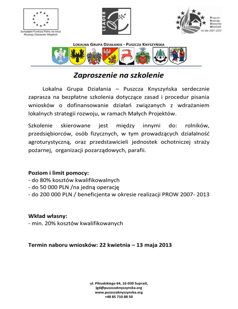 LOKALNA G RUPA DZIAŁANIA - PUSZCZA KNYSZYŃSKA Zaproszenie na szkolenie Lokalna Grupa Działania – Puszcza Knyszyńska serdecznie zaprasza na bezpłatne szkolenia dotyczące zasad i procedur pisania wniosków o dofinansowanie działań związanych z wdrażaniem lokalnych strategii rozwoju, w ramach Małych Projektów. Szkolenie skierowane jest między innymi do: rolników, przedsiębiorców, osób fizycznych, w tym prowadzących działalność agroturystyczną, oraz przedstawicieli jednostek ochotniczej straży pożarnej, organizacji pozarządowych, parafii. Poziom i limit pomocy: - do 80% kosztów kwalifikowalnych - do 50 000 PLN /na jedną operację - do 200 000 PLN / beneficjenta w okresie realizacji PROW 2007- 2013 Wkład własny: - min. 20% kosztów kwalifikowanych Termin naboru wniosków: 22 kwietnia – 13 maja 2013 ul. Piłsudskiego 64, 16-030 Supraśl, [email protected] www.puszczaknyszynska.org +48 85 710 88 50 LOKALNA G RUPA DZIAŁANIA - PUSZCZA KNYSZYŃSKA Terminy szkoleń Lp. Data 1 19.03.2013 r. 2 21.03.2013 r. 3 04.04.2013 r. 4 09.04.2013 r. 5 15.04.2013 r. Miejsce Ośrodek Kultury w Gminie Juchnowiec Kościelny Plac Królowej Rodzin 1 16-061 Juchnowiec Kościelny Urząd Miejski w Michałowie Ul. Białostocka 11 16-050 Michałowo Urząd Miejski w Wasilkowie ul. Białostocka 7 16-010 Wasilków Starostwo Powiatowe w Białymstoku ul. Borsucza 2 15-569 Białystok Centrum Edukacji w Supraśl ul. Piłsudskiego 64 sala 115 ul. Piłsudskiego 64, 16-030 Supraśl, [email protected] www.puszczaknyszynska.org +48 85 710 88 50 Godzina 10:00 10:00 10:00 10:00 10:00
