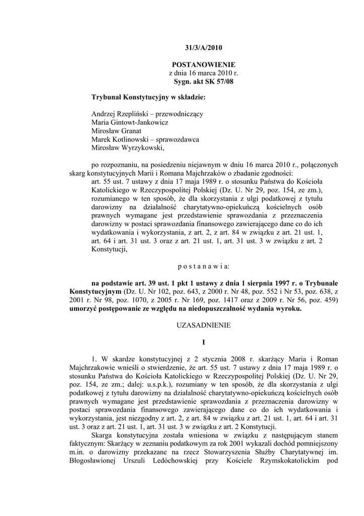 31/3/A/2010 POSTANOWIENIE z dnia 16 marca 2010 r. Sygn. akt SK 57/08 Trybunał Konstytucyjny w składzie: Andrzej Rzepliński – przewodniczący Maria Gintowt-Jankowicz Mirosław Granat Marek Kotlinowski – sprawozdawca Mirosław Wyrzykowski, po rozpoznaniu, na posiedzeniu niejawnym w dniu 16 marca 2010 r., połączonych skarg konstytucyjnych Marii i Romana Majchrzaków o zbadanie zgodności: art. 55 ust. 7 ustawy z dnia 17 maja 1989 r. o stosunku Państwa do Kościoła Katolickiego w Rzeczypospolitej Polskiej (Dz. U. Nr 29, poz. 154, ze zm.), rozumianego w ten sposób, że dla skorzystania z ulgi podatkowej z tytułu darowizny na działalność charytatywno-opiekuńczą kościelnych osób prawnych wymagane jest przedstawienie sprawozdania z przeznaczenia darowizny w postaci sprawozdania finansowego zawierającego dane co do ich wydatkowania i wykorzystania, z art. 2, z art. 84 w związku z art. 21 ust. 1, art. 64 i art. 31 ust. 3 oraz z art. 21 ust. 1, art. 31 ust. 3 w związku z art. 2 Konstytucji, p o s t a n a w i a: na podstawie art. 39 ust. 1 pkt 1 ustawy z dnia 1 sierpnia 1997 r. o Trybunale Konstytucyjnym (Dz. U. Nr 102, poz. 643, z 2000 r. Nr 48, poz. 552 i Nr 53, poz. 638, z 2001 r. Nr 98, poz. 1070, z 2005 r. Nr 169, poz. 1417 oraz z 2009 r. Nr 56, poz. 459) umorzyć postępowanie ze względu na niedopuszczalność wydania wyroku. UZASADNIENIE I 1. W skardze konstytucyjnej z 2 stycznia 2008 r. skarżący Maria i Roman Majchrzakowie wnieśli o stwierdzenie, że art. 55 ust. 7 ustawy z dnia 17 maja 1989 r. o stosunku Państwa do Kościoła Katolickiego w Rzeczypospolitej Polskiej (Dz. U. Nr 29, poz. 154, ze zm.; dalej: u.s.p.k.), rozumiany w ten sposób, że dla skorzystania z ulgi podatkowej z tytułu darowizny na działalność charytatywno-opiekuńczą kościelnych osób prawnych wymagane jest przedstawienie sprawozdania z przeznaczenia darowizny w postaci sprawozdania finansowego zawierającego dane co do ich wydatkowania i wykorzystania, jest niezgodny z art. 2, z art. 84 w związku z art. 21 ust. 1, art. 64 i art. 31 ust. 3 oraz z art. 21 ust. 1, art. 31 ust. 3 w związku z art. 2 Konstytucji. Skarga konstytucyjna została wniesiona w związku z następującym stanem faktycznym: Skarżący w zeznaniu podatkowym za rok 2001 wykazali dochód pomniejszony m.in. o darowizny przekazane na rzecz Stowarzyszenia Służby Charytatywnej im. Błogosławionej Urszuli Ledóchowskiej przy Kościele Rzymskokatolickim pod 2 wezwaniem Matki Boskiej Królowej Męczenników w Bydgoszczy oraz Sanktuarium Maryjnego w Gietrzwałdzie – Zakonu Księży Kanoników Regularnych Laterańskich. W 2004 r. organ podatkowy wszczął postępowanie podatkowe w sprawie określenia zobowiązania skarżących w podatku dochodowym od osób fizycznych za 2001 r. W toku tego postępowania zweryfikowano dokumenty potwierdzające fakt przekazania darowizn. Decyzją z 28 lutego 2005 r. (znak: DG II-4110-25/04/05) Naczelnik Drugiego Urzędu Skarbowego w Bydgoszczy określił skarżącym wysokość zobowiązania podatkowego w podatku dochodowym od osób fizycznych za 2001 r. W uzasadnieniu decyzji wskazano, że darowizny na kościelną działalność charytatywno-opiekuńczą są wyłączone z podstawy opodatkowania darczyńców podatkiem dochodowym, jeżeli kościelna osoba prawna przedstawi darczyńcy pokwitowanie odbioru oraz – w ciągu dwóch lat od dnia przekazania darowizny – sprawozdanie o przeznaczeniu jej na tę działalność. W innych wypadkach darowizny takie podlegają odliczeniu od dochodu do wysokości nieprzekraczającej 10% dochodu darczyńcy. Organ podatkowy ustalił, że z dwóch powodów skarżący nie mogli dokonać odliczenia darowizny na podstawie art. 55 ust. 7 u.s.p.k. Po pierwsze, Stowarzyszenie Służby Charytatywnej, na rzecz którego skarżący dokonali darowizny, nie ma statusu kościelnej osoby prawnej, co jest niezbędne dla skorzystania z bezlimitowego odliczenia. Po drugie, skarżący nie przedłożyli organowi podatkowemu sprawozdań co do sposobu wydatkowania przez obdarowanych przedmiotowych darowizn, a jedynie krótką informację co do działalności tych podmiotów. Tym samym nie spełnili jednego z warunków odliczenia darowizny, o którym mowa w art. 55 ust. 7 u.s.p.k. Powołując się na wyrok NSA, Ośrodka Zamiejscowego we Wrocławiu, z 24 czerwca 1997 r., sygn. akt SA/Wr 914/96, organ podatkowy wskazał, że sprawozdanie ze sposobu wydatkowania darowizny powinno mieć postać dokumentu zdatnego do uzasadnienia prawa do odliczenia. Sprawozdanie to powinno wskazywać cel spożytkowania konkretnej kwoty, datę tej czynności, osoby, którym przekazano część darowizny, oraz inne dane umożliwiające sprawdzenie, czy darowizna została wykorzystana na cel charytatywno-opiekuńczy. Przedstawiona przez skarżących dokumentacja wymagań tych nie spełnia i choć pozwala na dokonanie od dochodu odliczenia obu darowizn, to jednak tylko w granicach limitu wskazanego w art. 26 ust. 1 pkt 9 lit. b ustawy o podatku dochodowym od osób fizycznych, tj. 10% uzyskanego dochodu. Decyzja organu podatkowego pierwszej instancji została utrzymana w mocy decyzją Dyrektora Izby Skarbowej w Bydgoszczy z 8 sierpnia 2005 r. (znak: PB 3/4117-59/05). W uzasadnieniu tej decyzji organ drugiej instancji podzielił pogląd, zgodnie z którym sprawozdanie uprawniające do bezlimitowego odliczenia darowizny powinno mieć takie cechy, które pozwalają organom podatkowym jednoznacznie ocenić, czy darowizna została wykorzystana na cele charytatywno-opiekuńcze. WSA w Bydgoszczy wyrokiem z 11 stycznia 2006 r. (sygn. akt I SA/Bd 600/05) oddalił skargę skarżących na decyzję organu drugiej instancji, uznając, że decyzja ta nie narusza prawa. Sąd wskazał, że organ podatkowy ma nie tylko prawo, ale i obowiązek sprawdzenia, czy darowizny dokonane przez skarżących rzeczywiście zostały przeznaczone na cele charytatywno-opiekuńcze, a w konsekwencji czy zasadnie zostały one odliczone od p