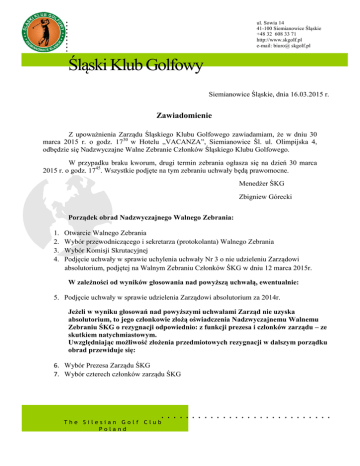 .. .. .. .. . ul. Sowia 14 41-100 Siemianowice Śląskie +48 32 608 33 71 http://www.skgolf.pl e-mail: biuro@ skgolf.pl Śląski Klub Golfowy Siemianowice Śląskie, dnia 16.03.2015 r. Zawiadomienie Z upoważnienia Zarządu Śląskiego Klubu Golfowego zawiadamiam, że w dniu 30 marca 2015 r. o godz. 1730 w Hotelu „VACANZA”, Siemianowice Śl. ul. Olimpijska 4, odbędzie się Nadzwyczajne Walne Zebranie Członków Śląskiego Klubu Golfowego. W przypadku braku kworum, drugi termin zebrania ogłasza się na dzień 30 marca 2015 r. o godz. 1745. Wszystkie podjęte na tym zebraniu uchwały będą prawomocne. Menedżer ŚKG Zbigniew Górecki Porządek obrad Nadzwyczajnego Walnego Zebrania: 1. 2. 3. 4. Otwarcie Walnego Zebrania Wybór przewodniczącego i sekretarza (protokolanta) Walnego Zebrania Wybór Komisji Skrutacyjnej Podjęcie uchwały w sprawie uchylenia uchwały Nr 3 o nie udzieleniu Zarządowi absolutorium, podjętej na Walnym Zebraniu Członków ŚKG w dniu 12 marca 2015r. W zależności od wyników głosowania nad powyższą uchwałą, ewentualnie: 5. Podjęcie uchwały w sprawie udzielenia Zarządowi absolutorium za 2014r. Jeżeli w wyniku głosowań nad powyższymi uchwałami Zarząd nie uzyska absolutorium, to jego członkowie złożą oświadczenia Nadzwyczajnemu Walnemu Zebraniu ŚKG o rezygnacji odpowiednio: z funkcji prezesa i członków zarządu – ze skutkiem natychmiastowym. Uwzględniając możliwość złożenia przedmiotowych rezygnacji w dalszym porządku obrad przewiduje się: 6. Wybór Prezesa Zarządu ŚKG 7. Wybór czterech członków zarządu ŚKG ............................ The Silesian Golf Club Poland