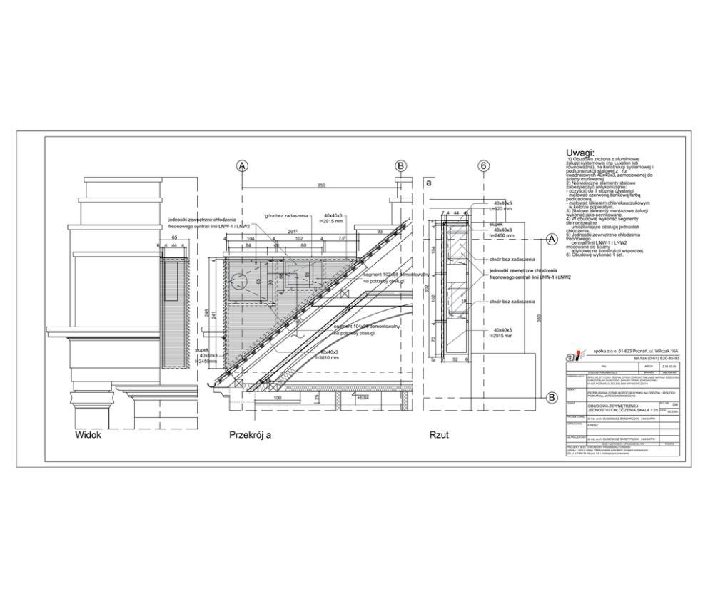 A B 4 73 A 4 7 otwór bez zadaszenia 68 żaluzji systemowej (np Luxalon lub równoważna), na konstrukcji systemowej i podkonstrukcji stalowej z rur kwadratowych 40x40x3, zamocowanej do ściany murowanej 2) Niewidoczne elementy stalowe zabezpieczyć antykorozyjnie: - oczyścić do II stopnia czystości - malować czerwoną tlenkową farbą podkładową - malować lakierem chlorokauczukowym w kolorze popielatym. 3) Stalowe elementy montażowe żaluzji wykonać jako ocynkowane. 4) W obudowie wykonać segmenty demontowalne umożliwiające obsługę jednostek chłodzenia. 5) Jednostki zewnętrzne chłodzenia freonowego centrali linii LNW-1 i LNW2 mocowane do ściany attykowej na konstrukcji wsporczej. 6) Obudowę wykonać 1 szt. jednostki zewnętrzne chłodzenia freonowego centrali linii LNW-1 i LNW2 102 4 302 4 segment 102x68 demontowalny na potrzeby obsługi 98 85 93 5 104 4 40 2915 102 80 40x40x3 L=520 mm słupek 40x40x3 h=2450 mm 4 4 44 4 104 84 4 6 4 4 65 7 4 44 46 40x40x3 l=2915 mm 55 jednostki zewnętrzne chłodzenia freonowego centrali linii LNW-1 i LNW2 6 a 350 góra bez zadaszenia Uwagi: 1) Obudowa złożona z aluminiowej otwór bez zadaszenia 350 1 38 40x40x3 l=2915 mm 70 segment 104x98 demontowalny na potrzeby obsługi 4 241 245 4 10 słupek 40x40x3 l=2450mm 40x40x3 l=3810 mm 6 5 ra 7 52 ktu ite ch ar acje z ali re tycje es inw 6 spółka z o.o. 61-623 Poznań, ul. Wilczak 16A tel./fax (0-61) 820-85-93 PW STADIUM DOKUMENTACJI ZAMAWIAJĄCY: ARCH. Z 08.05.09 BRANŻA UMOWA NR SPECJALISTYCZNY ZESPÓŁ OPIEKI ZDROWOTNEJ NAD MATKĄ I DZIECKIEM SAMODZIELNY PUBLICZNY ZAKŁAD OPIEKI ZDROWOTNEJ 61-825 POZNAŃ,UL.BOLESŁAWA KRYSIEWICZA 7/8 100 25 OBIEKT: B +6.84 PRZEBUDOWA ISTNIEJĄCEGO BUDYNKU NA ODDZIAŁ UROLOGII POZNAŃ UL.JAROCHOWSKIEGO 18 TEMAT: PROJEKTOWAŁ: OPRACOWAŁ: Widok Przekrój a Rzut GŁ.PROJEKTANT: OBUDOWA ZEWNĘTRZNEJ JEDNOSTKI CHŁODZENIA.SKALA 1:25 RYS NR: DATA: D8 06.2009 dr inż. arch. EUGENIUSZ SKRZYPCZAK 244/84/PW K.RENZ dr inż. arch. EUGENIUSZ SKRZYPCZAK 244/84/PW IMIĘ I NAZWISKO - UPRAWNIENIA NR PROJEKT JEST CHRONIONY PRAWEM AUTORSKIM Ustawa z dnia 4 lutego 1994 o prawie autorskim i prawach pokrewnych (Dz.U. z 1994 Nr 24 poz. 83 z późniejszymi zmianami) PODPIS