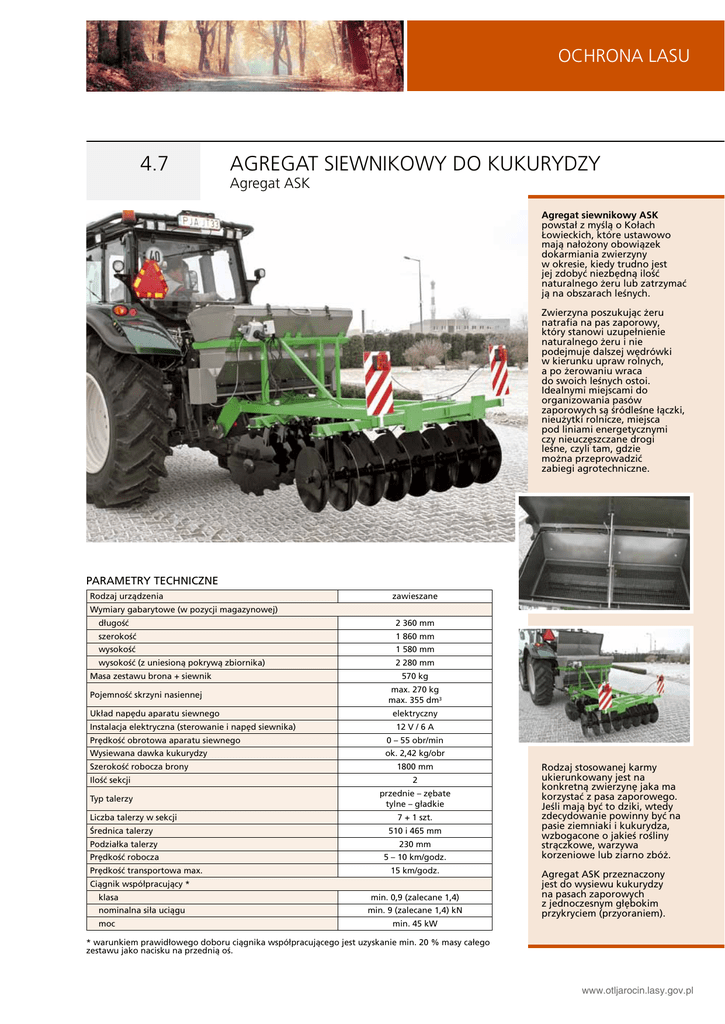 Untergrund OCHRONA vorbereiten LASU 4.7 Agregat siewnikowy do kukurydzy Agregat ASK Agregat siewnikowy ASK powstał z myślą o Kołach Łowieckich, które ustawowo mają nałożony obowiązek dokarmiania zwierzyny w okresie, kiedy trudno jest jej zdobyć niezbędną ilość naturalnego żeru lub zatrzymać ją na obszarach leśnych. Zwierzyna poszukując żeru natrafia na pas zaporowy, który stanowi uzupełnienie naturalnego żeru i nie podejmuje dalszej wędrówki w kierunku upraw rolnych, a po żerowaniu wraca do swoich leśnych ostoi. Idealnymi miejscami do organizowania pasów zaporowych są śródleśne łączki, nieużytki rolnicze, miejsca pod liniami energetycznymi czy nieuczęszczane drogi leśne, czyli tam, gdzie można przeprowadzić zabiegi agrotechniczne. PARAMETRY TECHNICZNE Rodzaj urządzenia zawieszane Wymiary gabarytowe (w pozycji magazynowej) długość 2 360 mm szerokość 1 860 mm wysokość 1 580 mm wysokość (z uniesioną pokrywą zbiornika) 2 280 mm Masa zestawu brona + siewnik Pojemność skrzyni nasiennej Układ napędu aparatu siewnego Instalacja elektryczna (sterowanie i napęd siewnika) 570 kg max. 270 kg max. 355 dm3 elektryczny 12 V / 6 A Prędkość obrotowa aparatu siewnego 0 – 55 obr/min Wysiewana dawka kukurydzy ok. 2,42 kg/obr Szerokość robocza brony 1800 mm Ilość sekcji 2 Typ talerzy przednie – zębate tylne – gładkie Liczba talerzy w sekcji Średnica talerzy 7 + 1 szt. 510 i 465 mm Podziałka talerzy 230 mm Prędkość robocza 5 – 10 km/godz. Prędkość transportowa max. 15 km/godz. Ciągnik współpracujący * klasa nominalna siła uciągu moc min. 0,9 (zalecane 1,4) min. 9 (zalecane 1,4) kN min. 45 kW Rodzaj stosowanej karmy ukierunkowany jest na konkretną zwierzynę jaka ma korzystać z pasa zaporowego. Jeśli mają być to dziki, wtedy zdecydowanie powinny być na pasie ziemniaki i kukurydza, wzbogacone o jakieś rośliny strączkowe, warzywa korzeniowe lub ziarno zbóż. Agregat ASK przeznaczony jest do wysiewu kukurydzy na pasach zaporowych z jednoczesnym głębokim przykryciem (przyoraniem). * warunkiem prawidłowego doboru ciągnika współpracującego jest uzyskanie min. 20 % masy całego zestawu jako nacisku na przednią oś. www.otljarocin.lasy.gov.pl n OeCHRONA tierebroLASU v dnurgretnU Agregat siewnikowy do kukurydzy Agregat ASK 4.7 Na potrzeby tak prowadzonej technologii siewnik właściwy zagregatowany został z broną talerzową zawieszaną, 2-sekcyjną (w wersji podstawowej przeznaczoną do prac rolniczych) stąd – z założenia – praca agregatem powinna odbywać się na powierzchni leśnej wielokrotnie uprawianej. Występujące sporadycznie niewielkie kamienie lub korzenie nie powinny stanowić przeszkody dla pracy takiego zespołu urządzeń. Może on być również wykorzystywany do wysiewu innych nasion, których wielkość pozwala na podawanie aparatem siewnym (duże nasiona), a jednocześnie nie dochodzi do swobodnego przesypywania nasion przy tym aparacie lub w innych elementach konstrukcyjnych (małe nasiona). W szczególnych przypadkach – gdy przykrycie nasion jest dla użytkownika czynnością niepożądaną – można prowadzić wysiew nasion z broną minimalnie uniesioną nad powierzchnię gruntu, jednakże z uwagi na nietypową pozycję narzędzi roboczych operator powinien zachować odpowiednio zwiększoną uwagę w trakcie pracy. Agregat ASK zapewnia: a)wysiew i przykrycie nasion kukurydzy jako karmy dla zwierzyny, b)równomierne podawanie nasion pod elementy przykrywające, c)płynną regulację wysiewanej dawki nasion, d)niezależność wysiewanej dawki od prędkości przejazdu, e)łatwe pokonywanie przeszkód terenowych, f)przestrzenność konstrukcji umożliwiająca łatwe oczyszczenie urządzenia po pracy. www.otljarocin.lasy.gov.pl W indywiualnie uzgodnionych warunkach istnieje możliwość opcjonalnego wykonania agregatu z wykorzystaniem innych zespołów roboczych. Regulacja ilości wysiewanych nasion – poprzez ustawienia sterownika. Ponieważ urządzenie nie pracuje z kołem kopiującym, wysiewana dawka jest zależna od chwilowej prędkości przejazdu. Regulacja dawki wysiewanych nasion odbywa się poprzez regulację prędkości obrotowej wałka wysiewającego; (manewrując zadaną predkością obrotową wałka i predkością przejazdu dawkę tę można proporcjonalnie zwiększyć w miarę możliwości predkości obrotowej aparatu siewnego). Regulacja głębokości przykrycia nasion zależna jest od: 1.regulacji zawieszenia i nastaw brony, 2.masy maszyny (przy pełnym zbiorniku kukurydzy głębokość większa), 3.zwięzłości (rodzaju) gleby.