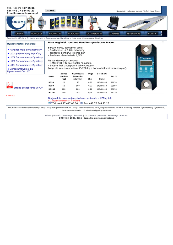 Tel. +48 77 417 05 06 Fax +48 77 544 93 23 E-mail: [email protected] Najczęściej zadawane pytania F.A.Q. | Mapa Strony Orome.pl > Oferta > Systemy ważące > Dynamometry, Dynafory > Małe wagi elektroniczne Handifor Dynamometry, Dynafory: Handifor małe dynamometry LLZ Dynamometry Dynafory LLX1 Dynamometry Dynafory LLX2 Dynamometry Dynafory LLXh Dynamometry Dynafory Oprogramowanie dla Dynamometrów LLX Małe wagi elektroniczne Handifor - producent Tractel Bardzo lekkie, poręczne i tanie! - Dokładność: ± 0,8% od normy - Jednostki pomiaru: kg oraz daN - Zasilanie: dwie baterie 1,5 V Wyposażenie podstawowe: - HANDIFOR w torbie z pętlą na pasek, - Baterie, hak zaczepowi i uchwyt ręczny (wagi dla zakresu pomiaru 50/200 kg z dwoma hakami zaczepowymi). Model Strona do pobrania w PDF Zakres Najmniejsza Waga D x SZ x G pomiaru [kg] jednostka miary [g] [kg] [mm] Art. nr HD20 20 50 0,22 140x80x40 29878 HD50 50 100 0,22 140x80x40 29888 HD100 100 200 0,22 140x80x40 29898 HD200 200 1000 0,34 140x80x40 75729 < wstecz Opcjonalnie proponujemy tańsze zamienniki - KERN, link > Zapytanie ofertowe - formularz Tel. +48 77 417 05 06 | Fax +48 77 544 93 23 OROME Handel Hurtowy i Detaliczny oferuje: Wagi małogabarytowe MCWL, Wagi ze stali nierdzewnej MCW, Wagi ciężkie seria MCWHU, Małe wagi Handifor, Dynamometry Dynafor LLZ, Dynamometry Dynafor LLX, Miernik naciągu liny Dynarope. Oferta | Nowości | Promocje | Poradnik | Do pobrania | O firmie | Referencje | Kontakt OROME © 2007/2016 - Wszelkie prawa zastrzeżone