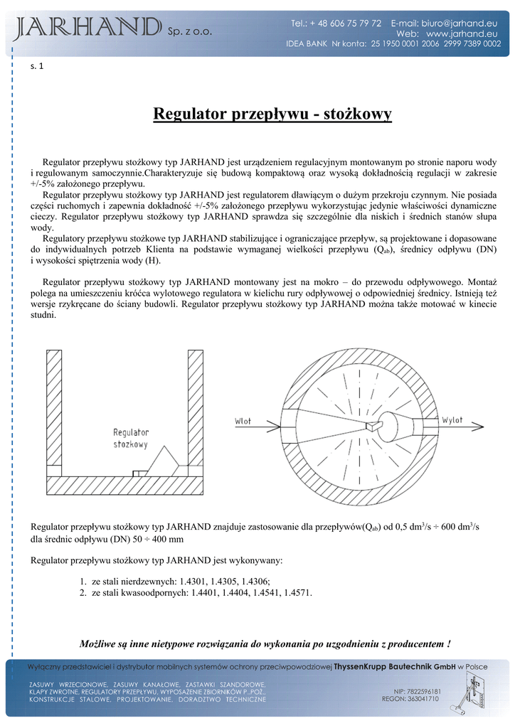 s. 1 Regulator przepływu - stożkowy Regulator przepływu stożkowy typ JARHAND jest urządzeniem regulacyjnym montowanym po stronie naporu wody i regulowanym samoczynnie.Charakteryzuje się budową kompaktową oraz wysoką dokładnością regulacji w zakresie +/-5% założonego przepływu. Regulator przepływu stożkowy typ JARHAND jest regulatorem dławiącym o dużym przekroju czynnym. Nie posiada części ruchomych i zapewnia dokładność +/-5% założonego przepływu wykorzystując jedynie właściwości dynamiczne cieczy. Regulator przepływu stożkowy typ JARHAND sprawdza się szczególnie dla niskich i średnich stanów słupa wody. Regulatory przepływu stożkowe typ JARHAND stabilizujące i ograniczające przepływ, są projektowane i dopasowane do indywidualnych potrzeb Klienta na podstawie wymaganej wielkości przepływu (Qab), średnicy odpływu (DN) i wysokości spiętrzenia wody (H). Regulator przepływu stożkowy typ JARHAND montowany jest na mokro – do przewodu odpływowego. Montaż polega na umieszczeniu króćca wylotowego regulatora w kielichu rury odpływowej o odpowiedniej średnicy. Istnieją też wersje rzykręcane do ściany budowli. Regulator przepływu stożkowy typ JARHAND można także motować w kinecie studni. Regulator przepływu stożkowy typ JARHAND znajduje zastosowanie dla przepływów(Qab) od 0,5 dm3/s ÷ 600 dm3/s dla średnic odpływu (DN) 50 ÷ 400 mm Regulator przepływu stożkowy typ JARHAND jest wykonywany: 1. ze stali nierdzewnych: 1.4301, 1.4305, 1.4306; 2. ze stali kwasoodpornych: 1.4401, 1.4404, 1.4541, 1.4571. Możliwe są inne nietypowe rozwiązania do wykonania po uzgodnieniu z producentem !