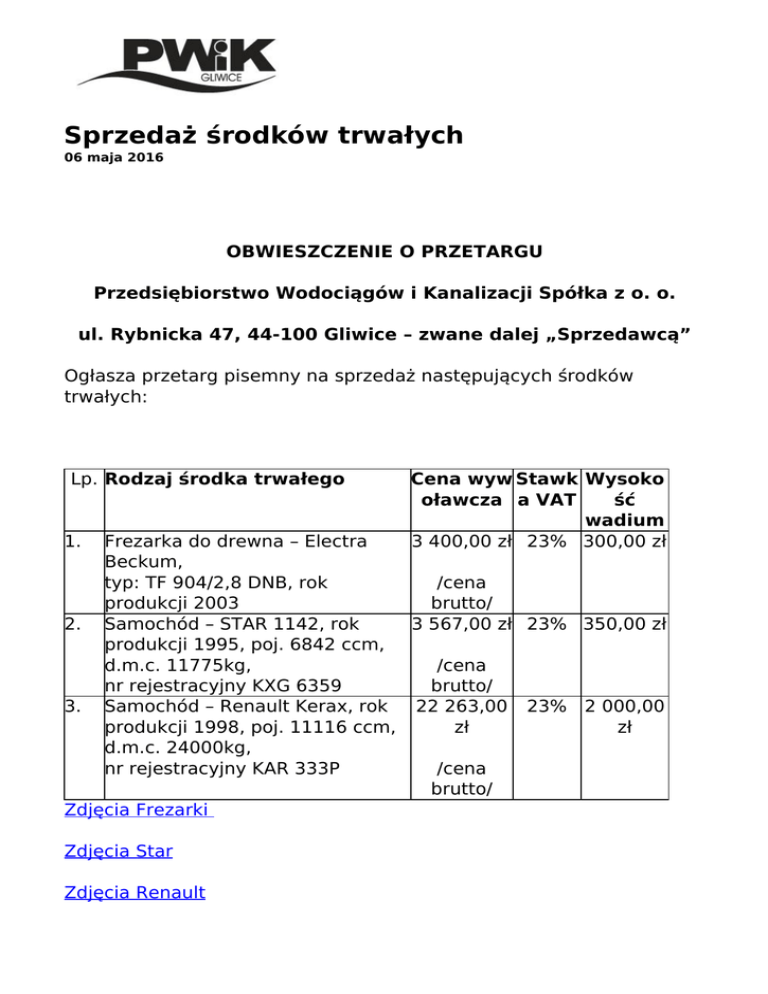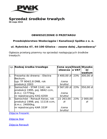 Sprzedaż środków trwałych 06 maja 2016 OBWIESZCZENIE O PRZETARGU Przedsiębiorstwo Wodociągów i Kanalizacji Spółka z o. o. ul. Rybnicka 47, 44-100 Gliwice – zwane dalej „Sprzedawcą” Ogłasza przetarg pisemny na sprzedaż następujących środków trwałych: Lp. Rodzaj środka trwałego 1. Cena wyw Stawk Wysoko oławcza a VAT ść wadium 3 400,00 zł 23% 300,00 zł Frezarka do drewna – Electra Beckum, typ: TF 904/2,8 DNB, rok /cena produkcji 2003 brutto/ 2. Samochód – STAR 1142, rok 3 567,00 zł 23% 350,00 zł produkcji 1995, poj. 6842 ccm, d.m.c. 11775kg, /cena nr rejestracyjny KXG 6359 brutto/ 3. Samochód – Renault Kerax, rok 22 263,00 23% 2 000,00 produkcji 1998, poj. 11116 ccm, zł zł d.m.c. 24000kg, nr rejestracyjny KAR 333P /cena brutto/ Zdjęcia Frezarki Zdjęcia Star Zdjęcia Renault Oględzin oraz badań wystawionych w przetargu środków trwałych można dokonać w Gliwicach, przy ul. Rybnickiej 47 w dniu 17-05-2016r. i 18-05-2016r. w godzinach 900-1300. Informacje na temat sprzedawanego środka trwałego można uzyskać od Pana Adama Domin pod nr tel. 338-71-59 od poniedziałku do piątku w godz. 700-1500. Oferty należy składać w siedzibie Sprzedawcy w pokoju 308 do dnia 20-05-2016r. do godziny 900. Wadium należy wpłacić w siedzibie Sprzedawcy w kasie lub na konto Sprzedawcy w Bank Handlowy w Warszawie S.A. o nr 30 1030 1508 0000 0008 0434 7003 z adnotacją: Wadium – przetarg na sprzedaż (podać nazwę środka trwałego). Wadium musi zostać zaksięgowane na koncie Sprzedawcy w dniu otwarcia ofert do godziny 900. Wadium przepada na rzecz Sprzedawcy jeżeli żaden z uczestników licytacji nie zaoferuje ceny nabycia równej co najmniej cenie wywoławczej. Oferentom, których oferty nie zostaną przyjęte, wadium zostanie zwrócone bezpośrednio po dokonaniu wyboru oferty, a Oferentowi , którego oferta została przyjęta, zostanie zaliczone na poczet ceny. Jeżeli Oferent, którego oferta została przyjęta uchyli się od zawarcia umowy, wówczas wniesione przez niego wadium przepada na rzecz Sprzedawcy. Oferent zamieści ofertę w kopercie, która będzie zaadresowana na Sprzedawcę (jak w nagłówku) oraz będzie posiadać następujące oznaczenie: Przetarg pisemny na sprzedaż: (wpisać nazwę środka trwałego) nie otwierać do dnia 20-05-2016r. do godziny 930 Poza oznaczeniami podanymi powyżej koperta będzie również posiadać nazwę i adres Oferenta. Otwarcie Ofert nastąpi w dniu 20-05-2016r. o godzinie 930 w siedzibie Sprzedawcy. Sprzedawca informuje, iż przysługuje mu prawo swobodnego wyboru oferty jeżeli uczestnicy przetargu zaoferują tą samą cenę. Powered by TCPDF (www.tcpdf.org)