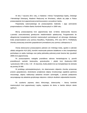 W dniu 7 stycznia 2011 roku, w Katedrze i Klinice Transplantacji Szpiku, Onkologii i Hematologii Dziecięcej, Akademii Medycznej we Wrocławiu, odbyło się piąte w Polsce przeszczepienie krwi pępowinowej przechowywanej w prywatnym banku. Preparatykę wykorzystanego do przeszczepienia materiału i jego zamrożenie przeprowadzono w Polskim Banku Komórek Macierzystych w 2009 roku. Biorcą przeszczepionej krwi pępowinowej była 12-letnia dziewczynka leczona z powodu uwarunkowanej genetycznie niedokrwistości aplastycznej. Przygotowanie do allogenicznej transplantacji komórek macierzystych pochodzących od zdrowego młodszego brata przeprowadzono przy pomocy Busulfanu, Fludarabiny, ATG oraz OKT-3. Profilaktykę choroby przeszczep przeciwko gospodarzowi prowadzono przy pomocy cyklosporyny A. Chorej dziewczynce przeszczepiono pobrane od 2-letniego brata, zgodne w zakresie układu antygenów HLA (6/6), komórki macierzyste pobrane dodatkowo w dniu transplantacji pochodzące ze szpiku kostnego oraz jedną jednostkę pobranej przed dwoma laty (grudzień 2009) krwi pępowinowej. Po przeszczepieniu nastąpiła prawidłowa odnowa hematologiczna tj. powrót prawidłowych wartości leukocytów, granulocytów i płytek krwi (leukocyty>1000 i granulocyty>500 w dniu +18 - 25 stycznia), liczba płytek krwi po transplantacji nie obniżyła się poniżej 20 000. W przebiegu potransplantacyjnym, nie obserwowano objawów choroby przeszczep przeciw gospodarzowi, stwierdzano przejściowe objawy krwotocznego zapalenia pęcherza moczowego, objawy reaktywacji zakażenia wirusem cytomegalii, z powodu podejrzenia zaczynającego się zakażenia grzybiczego włączono z dobrym skutkiem odpowiednie leczenie. Po uzyskaniu poprawy stanu klinicznego, dziewczynkę – biorcę komórek macierzystych krwi pępowinowej i szpiku, wypisano do domu w bardzo dobrym stanie ogólnym.