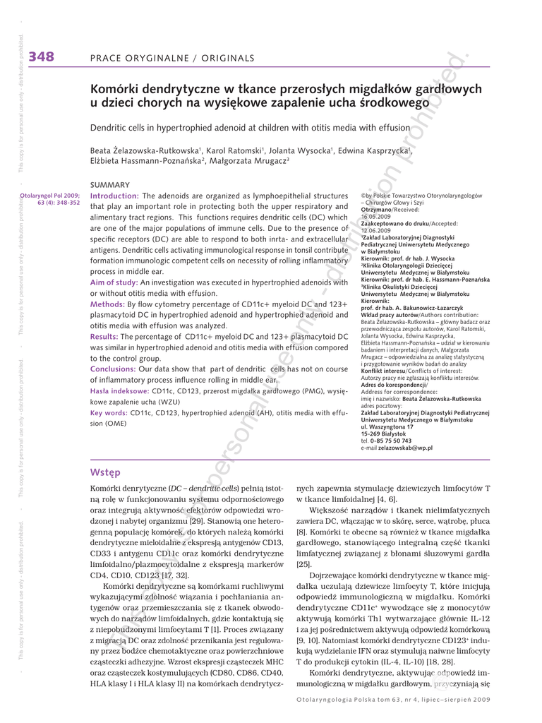 - PRACE ORYGINALNE / ORIGINALS ibu tio np roh ibit Komórki dendrytyczne w tkance przerosłych migdałków gardłowych u dzieci chorych na wysiękowe zapalenie ucha środkowego Dendritic cells in hypertrophied adenoid at children with otitis media with effusion Beata Żelazowska-Rutkowska1, Karol Ratomski1, Jolanta Wysocka1, Edwina Kasprzycka1, Elżbieta Hassmann-Poznańska 2, Małgorzata Mrugacz3 ©by Polskie Towarzystwo Otorynolaryngologów – Chirurgów Głowy i Szyi Otrzymano/Received: 16.05.2009 Zaakceptowano do druku/Accepted: 12.06.2009 1 Zakład Laboratoryjnej Diagnostyki Pediatrycznej Uniwersytetu Medycznego w Białymstoku Kierownik: prof. dr hab. J. Wysocka 2 Klinika Otolaryngologii Dziecięcej Uniwersytetu Medycznej w Białymstoku Kierownik: prof. dr hab. E. Hassmann-Poznańska 3 Klinika Okulistyki Dziecięcej Uniwersytetu Medycznej w Białymstoku Kierownik: prof. dr hab. A. Bakunowicz-Łazarczyk Wkład pracy autorów/Authors contribution: Beata Żelazowska-Rutkowska – główny badacz oraz przewodnicząca zespołu autorów, Karol Ratomski, Jolanta Wysocka, Edwina Kasprzycka, Elżbieta Hassmann-Poznańska – udział w kierowaniu badaniem i interpretacji danych, Małgorzata Mrugacz – odpowiedzialna za analizę statystyczną i przygotowanie wyników badań do analizy Konflikt interesu/Conflicts of interest: Autorzy pracy nie zgłaszają konfliktu interesów. Adres do korespondencji/ Address for correspondence: imię i nazwisko: Beata Żelazowska-Rutkowska adres pocztowy: Zakład Laboratoryjnej Diagnostyki Pediatrycznej Uniwersytetu Medycznego w Białymstoku ul. Waszyngtona 17 15-269 Białystok tel. 0-85 75 50 743 e-mail [email protected] us eo nly -d istr SUMMARY Introduction: The adenoids are organized as lymphoepithelial structures that play an important role in protecting both the upper respiratory and alimentary tract regions. This functions requires dendritic cells (DC) which are one of the major populations of immune cells. Due to the presence of specific receptors (DC) are able to respond to both inrta- and extracellular antigens. Dendritic cells activating immunological response in tonsil contribute formation immunologic competent cells on necessity of rolling infl ammatory process in middle ear. Aim of study: An investigation was executed in hypertrophied adenoids with or without otitis media with effusion. Methods: By flow cytometry percentage of CD11c+ myeloid DC and 123+ plasmacytoid DC in hypertrophied adenoid and hypertrophied adenoid and otitis media with effusion was analyzed. Results: The percentage of CD11c+ myeloid DC and 123+ plasmacytoid DC was similar in hypertrophied adenoid and otitis media with effusion compored to the control group. Conclusions: Our data show that part of dendritic cells has not on course of inflammatory process influence rolling in middle ear. Hasła indeksowe: CD11c, CD123, przerost migdałka gardłowego (PMG), wysię- al kowe zapalenie ucha (WZU) on Key words: CD11c, CD123, hypertrophied adenoid (AH), otitis media with effu- pe rs sion (OME) Wstęp is c op y is for Komórki denrytyczne (DC – dendritic cells) pełnią istotną rolę w funkcjonowaniu systemu odpornościowego oraz integrują aktywność efektorów odpowiedzi wrodzonej i nabytej organizmu [29]. Stanowią one heterogenną populację komórek, do których należą komórki dendrytyczne mieloidalne z ekspresją antygenów CD13, CD33 i antygenu CD11c oraz komórki dendrytyczne limfoidalno/plazmocytoidalne z ekspresją markerów CD4, CD10, CD123 [17, 32]. Komórki dendrytyczne są komórkami ruchliwymi wykazującymi zdolność wiązania i pochłaniania antygenów oraz przemieszczania się z tkanek obwodowych do narządów limfoidalnych, gdzie kontaktują się z niepobudzonymi limfocytami T [1]. Proces związany z migracją DC oraz zdolność przenikania jest regulowany przez bodźce chemotaktyczne oraz powierzchniowe cząsteczki adhezyjne. Wzrost ekspresji cząsteczek MHC oraz cząsteczek kostymulujących (CD80, CD86, CD40, HLA klasy I i HLA klasy II) na komórkach dendrytycz- Th This copy is for personal use only - distribution prohibited. - This copy is for personal use only - distribution prohibited. - This copy is for personal use only - distribution prohibited. Otolaryngol Pol 2009; 63 (4): 348-352 ed . This copy is for personal use only - distribution prohibited. - 348 nych zapewnia stymulację dziewiczych limfocytów T w tkance limfoidalnej [4, 6]. Większość narządów i tkanek nielimfatycznych zawiera DC, włączając w to skórę, serce, wątrobę, płuca [8]. Komórki te obecne są również w tkance migdałka gardłowego, stanowiącego integralną część tkanki limfatycznej związanej z błonami śluzowymi gardła [25]. Dojrzewające komórki dendrytyczne w tkance migdałka uczulają dziewicze limfocyty T, które inicjują odpowiedź immunologiczną w migdałku. Komórki dendrytyczne CD11c+ wywodzące się z monocytów aktywują komórki Th1 wytwarzające głównie IL-12 i za jej pośrednictwem aktywują odpowiedź komórkową [9, 10]. Natomiast komórki dendrytyczne CD123+ indukują wydzielanie IFN oraz stymulują naiwne limfocyty T do produkcji cytokin (IL-4, IL-10) [18, 28]. Komórki dendrytyczne, aktywując odpowiedź immunologiczną w migdałku gardłowym, przyczyniają się Otolar yngologia Polska tom 63, nr 4, lipiec– sierpień 20 0 9 ed . - powstawania komórek immunologicznie kompetentnych na potrzeby toczącego się procesu zapalnego w uchu środkowym. Celem badań było określenie odsetka komórek dendrytycznych mieloidalnych (CD11c+) i plazmocytoidalnych (CD123+) w tkance przerosłych migdałków gardłowych u dzieci z wysiękowym zapaleniem ucha środkowego. Tabela I. Odsetek komórek dendrytycznych z ekspresją CD11c+ i CD123+ w tkance przerosłych migdałków gardłowych u dzieci chorych na wysiekowe zapalenie ucha środkowego (WZU) i w grupie porównawczej bez stanu zapalnego ucha środkowego (PMG) Komórki dendrytyczne (% ± SD) CD11