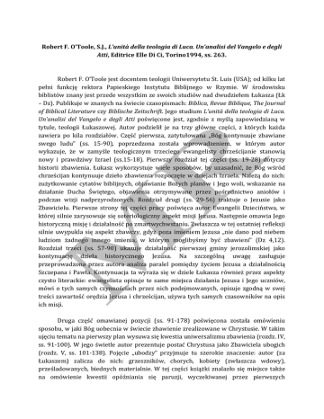 Robert F. O’Toole, S.J., L’unità della teologia di Luca. Un’analisi del Vangelo e degli Atti, Editrice Elle Di Ci, Torino1994, ss. 263. Robert F. O’Toole jest docentem teologii Uniwersytetu St. Luis (USA); od kilku lat pełni funkcję rektora Papieskiego Instytutu Biblijnego w Rzymie. W środowisku biblistów znany jest przede wszystkim ze swoich studiów nad dwudziełem Łukasza (Łk – Dz). Publikuje w znanych na świecie czasopismach: Biblica, Revue Biblique, The Journal of Biblical Literature czy Biblische Zeitschrift. Jego studium L’unità della teologia di Luca. Un’analisi del Vangelo e degli Atti poświęcone jest, zgodnie z myślą zapowiedzianą w tytule, teologii Łukaszowej. Autor podzielił je na trzy główne części, z których każda zawiera po kila rozdziałów. Część pierwsza, zatytułowana „Bóg kontynuuje zbawiane swego ludu” (ss. 15-‐90), poprzedzona została wprowadzeniem, w którym autor wykazuje, że w zamyśle teologicznym trzeciego ewangelisty chrześcijanie stanowią nowy i prawdziwy Izrael (ss.15-‐18). Pierwszy rozdział tej części (ss. 19-‐28) dotyczy historii zbawienia. Łukasz wykorzystuje wiele sposobów, by uzasadnić, że Bóg wśród chrześcijan kontynuuje dzieło zbawienia rozpoczęte w dziejach Izraela. Należą do nich: zużytkowanie cytatów biblijnych, objawianie Bożych planów i Jego woli, wskazanie na działanie Ducha Świętego, objawienia otrzymywane przez pośrednictwo aniołów i podczas wizji nadprzyrodzonych. Rozdział drugi (ss. 29-‐56) traktuje o Jezusie jako Zbawicielu. Pierwsze strony tej części pracy poświęca autor Ewangelii Dzieciństwa, w której silnie zarysowuje się soteriologiczny aspekt misji Jezusa. Następnie omawia Jego historyczną misję i działalność po zmartwychwstaniu. Zwłaszcza w tej ostatniej refleksji silnie uwypukla się aspekt zbawczy, gdyż poza imieniem Jezusa „nie dano pod niebem ludziom żadnego innego imienia, w którym moglibyśmy być zbawieni” (Dz 4,12). Rozdział trzeci (ss. 57-‐90) ukazuje działalność pierwszej gminy jerozolimskiej jako kontynuację dzieła historycznego Jezusa. Na szczególną uwagę zasługuje przeprowadzona przez autora analiza paralel pomiędzy życiem Jezusa a działalnością Szczepana i Pawła. Kontynuacja ta wyraża się w dziele Łukasza również przez aspekty czysto literackie: ewangelista opisuje te same miejsca działania Jezusa i Jego uczniów, mówi o tych samych czynnościach przez nich podejmowanych, opisuje zgodną w swej treści zawartość orędzia Jezusa i chrześcijan, używa tych samych czasowników na opis ich misji. Druga część omawianej pozycji (ss. 91-‐178) poświęcona została omówieniu sposobu, w jaki Bóg uobecnia w świecie zbawienie zrealizowane w Chrystusie. W takim ujęciu tematu na pierwszy plan wysuwa się kwestia uniwersalizmu zbawienia (rozdz. IV, ss. 91-‐100). W jego świetle autor prezentuje postać Chrystusa jako Zbawiciela ubogich (rozdz. V, ss. 101-‐138). Pojęcie „ubodzy” przyjmuje tu szerokie znaczenie: autor (za Łukaszem) zalicza do nich: grzeszników, chorych, kobiety (zwłaszcza wdowy), prześladowanych, biednych materialnie. W tej części książki znalazło się miejsce także na omówienie kwestii opóźniania się paruzji, wyczekiwanej przez pierwszych chrześcijan (rozdz. VI, ss. 139-‐148). Ciekawą ideą teologii Łukasza (odróżniającą trzecią ewangelię od pozostałych synoptyków) jest ukazanie członków pierwszych gmin jako ludzi żyjących w pokojowych relacjach z rzymskim okupantem (rozdz. VII, ss. 149-‐156). Ważnym rysem teologii Łk – Dz jest podkreślenie osobowego aspektu zbawienia (rozdz. VIII, ss.157-‐178). Łukasz z upodobaniem prezentuje osobowościowe cechy swych bohaterów, często przywołuje ich imiona, podaje konkretne szczegóły z ich życia (choć czasem niewiele wnoszą one w tok narracji). Ostatnia część pracy R.F. O’Toole’a (ss. 179-‐250) poświęcona jest uczniom Jezusa, widzianym przez pryzmat zbawczego działania Bożego. Pierwszym zadaniem ucznia jest pozytywna odpowiedź na zbawczą inicjatywę Boga (rozdz. IX, ss.179-‐210). Inicjatywa ta powoduje reakcje, które ewangelista wyraża za pomocą typowych dla niego motywów: radości, podziwu, błogosławieństwa i chwały (rozdz. X, 211-‐242). Ostatni rozdział książki dotyczy tematu zwanego w teologii jako sequela Christi, która jest obowiązkiem wiernego ucznia Chrystusa. W bibliografii zamieszczono jedynie najważniejsze pozycje traktujące o teologii ewangelii św. Łukasza i Dziejów Apostolskich. W aneksie autor przedstawia indeks analityczny postaci i głównych pojęć teologicznych, które pojawiają się na kartach publikacji. Coraz częściej w literaturze biblijnej pojawiają się pozycje, które podejmując zagadnienia teologiczne, traktują łącznie oba tomy dzieła Łukaszowego (Łk – Dz). Takie zresztą było zamierzenie samego ewangelisty (por. Dz 1,1), który w Dziejach podejmuje idee i tematy prezentowane wcześniej w ewangelii. Bez wątpienia walorem książki o. O’Toole’a jest syntetyczne ujęcie teologii obu tych dzieł. Ze swej natury wiele zagadnień poruszonych na kartach publikacji potraktowanych zostało jedynie ogólnie, bez sięgnięcia po szczegółowe wyniki analiz egzegetycznych, gdyż nie pozwalają na to rozmiary książki. Autor posługuje się określoną metodologią, wyznaczoną przez granice krytyki redakcyjnej, którą można by określić jako metodę analizy kompozycji (Kompositionsgeschichte). Wydaje się, że wszystkie zagadnienia teologiczne Łk – Dz autor skupił wokół jednej idei, a mianowicie, że Bóg Starego Przymierza kontynuuje dzieło zbawienia wśród chrześcijan, którzy konstytuują prawdziwy Izrael, a dzieło Jezusa jest kontynuowane przez Jego uczniów. Wydobycie tej właśnie idei jako centrum przesłania Łukaszowego stanowi o nowości książki o. R.F. O’Toole’a. ks. Mariusz Rosik