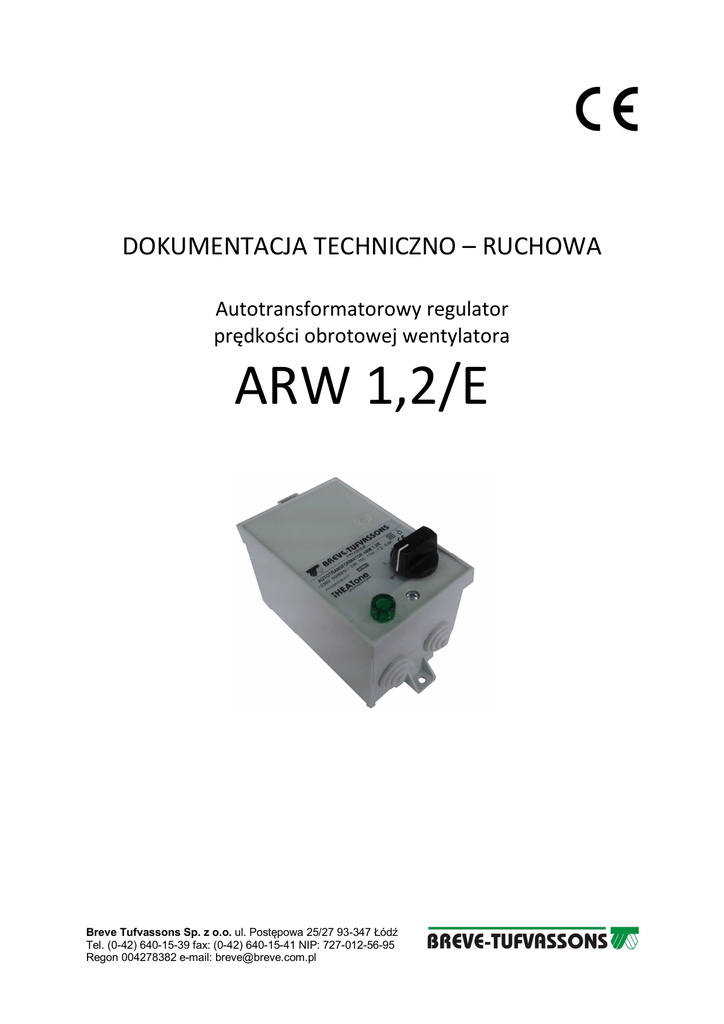 DOKUMENTACJA TECHNICZNO – RUCHOWA Autotransformatorowy regulator prędkości obrotowej wentylatora ARW 1,2/E Breve Tufvassons Sp. z o.o. ul. Postępowa 25/27 93-347 Łódź Tel. (0-42) 640-15-39 fax: (0-42) 640-15-41 NIP: 727-012-56-95 Regon 004278382 e-mail: [email protected] 1. Dane ogólne. 2. Przeznaczenie. 3. Wymiary. 4. Opis urządzenia oraz schemat podłączenia 5. Instalacja. 6. Zasady bezpieczeństwa. 7. Transport i składowanie. 8. Warunki gwarancji. Breve Tufvassons Sp. z o.o. ul. Postępowa 25/27 93-347 Łódź Tel. (0-42) 640-15-39 fax: (0-42) 640-15-41 NIP: 727-012-56-95 Regon 004278382 e-mail: [email protected] 1. Dane ogólne. Parametry elektryczne: Typ UPRI [V] ARW 1,2 E 230 Stopnie regulacji UR[V] / IR[A] 1 2 3 115/0,9 155/1,2 230/1,2 Pozostałe dane techniczne. Stopień ochrony Temperatura otoczenia Zabezpieczenie Zgodność z normą Klasa izolacji IP54 Dopuszczalna 40°C Odporne na dorywcze przeciążenia – wyłącznik termiczny samoczynny (zalecane zabezpieczenie w obwodzie zewnętrznym) PN-EN 61558-2-13 II + środki zapewniające ciągłość obwodów PE Tabliczka znamionowa: 2. Przeznaczenie. Regulatory typu ARW są przeznaczone do regulacji prędkości obrotowej jednofazowych silników wentylatorowych. Mogą być również wykorzystywane w regulacji temperatury elementów grzejnych. Breve Tufvassons Sp. z o.o. ul. Postępowa 25/27 93-347 Łódź Tel. (0-42) 640-15-39 fax: (0-42) 640-15-41 NIP: 727-012-56-95 Regon 004278382 e-mail: [email protected] 3. Wymiary. 4. Opis urządzenia oraz schemat podłączenia. Tabliczka znamionowa Pokrętło regulacyjne Lampka sygnalizująca podłączenie urządzenia do zasilania Śruba mocująca pokrywy Schemat podłączenia: Breve Tufvassons Sp. z o.o. ul. Postępowa 25/27 93-347 Łódź Tel. (0-42) 640-15-39 fax: (0-42) 640-15-41 NIP: 727-012-56-95 Regon 004278382 e-mail: [email protected] 5. Instalacja. a. Zwrócić uwagę na dopuszczalną temperaturę otocznia regulatora. Podczas pracy obudowa może być gorąca W celu zapewnienia prawidłowego chłodzenia i przepływu powietrza montować tylko w położeniu pionowym. b. Regulator przykręcić do powierzchni płaskiej (ściana itp.) za pomocą wkrętów. c. Otworzyć obudowę regulatora przez odkręcenie śruby pokrywy. d. Wprowadzić przewody przez przelotki (max. przekrój przewodu 1,5mm2). e. Przyłączenia dokonać zgodnie z odpowiednim diagramem. f. Zabezpieczenia przed zwarciami umieścić w obwodzie zasilającym. Breve Tufvassons Sp. z o.o. ul. Postępowa 25/27 93-347 Łódź Tel. (0-42) 640-15-39 fax: (0-42) 640-15-41 NIP: 727-012-56-95 Regon 004278382 e-mail: [email protected] 6. Zasady bezpieczeństwa. a. Instalacji regulatora powinien dokonywać wykwalifikowany elektryk. b. Instalacja regulatora pod napięciem grozi porażeniem. c. Maksymalny prąd ciągły odbiornika nie może przekraczać prądu na jaki został zaprojektowany regulator dla poszczególnych stopni regulacji. 7. Transport i składowanie. a. Oryginalne opakowanie zastosowane przez producenta zapewnia bezpieczny dla regulatora transport oraz bezpieczne składowanie. b. Podczas składowania należy używać wyłącznie oryginalnego opakowania. c. Składować w temperaturze od -5°C do +50°C. Jeżeli autotransformator nie jest instalowany natychmiast po dostawie, powinien zostać umieszczony w pomieszczeniu chroniącym go przed działaniem wody, kurzu i wilgoci. Temperatura w miejscu przechowywania nie powinna być niższa niż -25ºC. 8. Warunki gwarancji. -Firma Breve-Tufvassons Sp. z o.o. udziela gwarancji na sprawne działanie zakupionego sprzętu. -Okres gwarancji, liczony od daty sprzedaży, wynosi 24 miesiące. -Gwarancja ulega przedłużeniu o czas naprawy. -Gwarancja obejmuje naprawę lub wymianę autotransformatora. -Gwarancja nie obejmuje zniszczenia lub uszkodzenia autotransformatora na skutek niewłaściwego użytkowania. -W przypadku nieuzasadnionych zgłoszeń reklamacyjnych Klient ponosi koszty związane z podjętymi przez Breve-Tufvassons Sp. z o.o. czynnościami. Breve Tufvassons Sp. z o.o. ul. Postępowa 25/27 93-347 Łódź Tel. (0-42) 640-15-39 fax: (0-42) 640-15-41 NIP: 727-012-56-95 Regon 004278382 e-mail: [email protected]