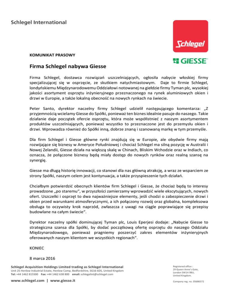 KOMUNIKAT PRASOWY Firma Schlegel nabywa Giesse Firma Schlegel, dostawca rozwiązań uszczelniających, ogłosiła nabycie włoskiej firmy specjalizującej się w osprzęcie, ze skutkiem natychmiastowym. Daje to firmie Schlegel, londyńskiemu Międzynarodowemu Oddziałowi notowanej na giełdzie firmy Tyman plc, wysokiej jakości asortyment osprzętu inżynieryjnego przeznaczonego na rynek aluminiowych okien i drzwi w Europie, a także lokalną obecność na nowych rynkach na świecie. Peter Santo, dyrektor naczelny firmy Schlegel udzielił następującego komentarza: „Z przyjemnością wcielamy Giesse do Spółki, ponieważ ten biznes idealnie pasuje do naszego. Takie działanie daje początek ofercie osprzętu, która może współistnieć z naszym asortymentem produktów uszczelniających, ponieważ wszystko to przeznaczone jest do przemysłu okien i drzwi. Wprowadza również do Spółki inną, dobrze znaną i szanowaną markę w tym przemyśle. Dla firm Schlegel i Giesse główne rynki znajdują się w Europie, ale obydwie firmy mają rozwijające się biznesy w Ameryce Południowej i chociaż Schlegel ma silną pozycję w Australii i Nowej Zelandii, Giesse działa na większą skalę w Chinach, Bliskim Wchodzie oraz w Indiach, co oznacza, że połączone biznesy będą miały dostęp do nowych rynków oraz realną szansę na synergię. Giesse ma długą historię innowacji, co stanowi dla nas główną atrakcję, a wraz ze wsparciem ze strony Spółki, naszym celem jest kontynuacja, a także przyspieszenie tych działań. Chciałbym potwierdzić obecnych klientów firm Schlegel i Giesse, że chociaż będą to interesy prowadzone „po staremu“, w przyszłości zamierzamy wprowadzić wiele ekscytujących, nowych ofert. Uszczelki i osprzęt to dwa najważniejsze elementy, jeśli chodzi o zabezpieczenie drzwi i okien przed warunkami atmosferycznymi, a ich połączony rozwój oraz globalna, kompleksowa obsługa to oczywisty krok naprzód, zwłaszcza z uwagi na ciągle poprawiające się przepisy budowlane na całym świecie“. Dyrektor naczelny spółki dominującej Tyman plc, Louis Eperjesi dodaje: „Nabycie Giesse to strategiczna szansa dla Spółki, by dodać początkową ofertę osprzętu do naszego Oddziału Międzynarodowego, ponieważ pragniemy poszerzyć zakres elementów inżynieryjnych oferowanych naszym klientom we wszystkich regionach“. KONIEC 8 marca 2016 Unit 25 Henlow Industrial Estate, Henlow Camp, Bedfordshire, SG16 6DS, United Kingdom Tel: +44 1462 815500 Fax: +44 1462 638 800 email: [email protected] Registered office : 29 Queen Anne’s Gate, London SW1H 9BU, United Kingdom. www.schlegel.com | www.giesse.it Company reg. no. 05686572 Schlegel Acquisition Holdings Limited trading as Schlegel International