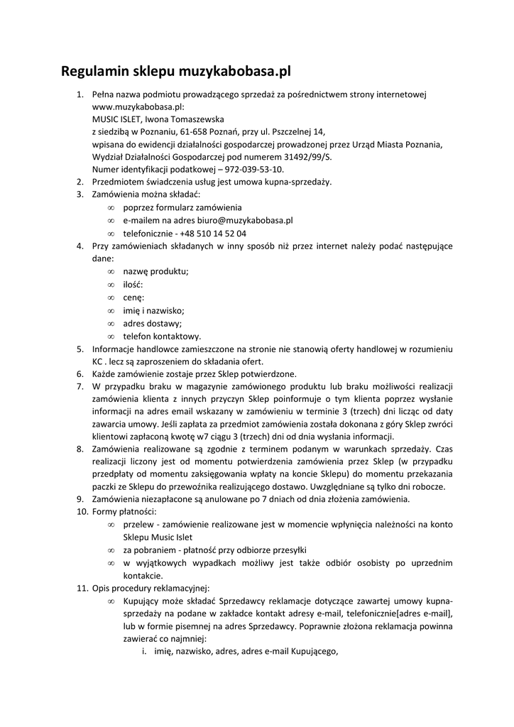 Regulamin sklepu muzykabobasa.pl 1. Pełna nazwa podmiotu prowadzącego sprzedaż za pośrednictwem strony internetowej www.muzykabobasa.pl: MUSIC ISLET, Iwona Tomaszewska z siedzibą w Poznaniu, 61-658 Poznań, przy ul. Pszczelnej 14, wpisana do ewidencji działalności gospodarczej prowadzonej przez Urząd Miasta Poznania, Wydział Działalności Gospodarczej pod numerem 31492/99/S. Numer identyfikacji podatkowej – 972-039-53-10. 2. Przedmiotem świadczenia usług jest umowa kupna-sprzedaży. 3. Zamówienia można składać: • poprzez formularz zamówienia • e-mailem na adres [email protected] • telefonicznie - +48 510 14 52 04 4. Przy zamówieniach składanych w inny sposób niż przez internet należy podać następujące dane: • nazwę produktu; • ilość: • cenę: • imię i nazwisko; • adres dostawy; • telefon kontaktowy. 5. Informacje handlowce zamieszczone na stronie nie stanowią oferty handlowej w rozumieniu KC . lecz są zaproszeniem do składania ofert. 6. Każde zamówienie zostaje przez Sklep potwierdzone. 7. W przypadku braku w magazynie zamówionego produktu lub braku możliwości realizacji zamówienia klienta z innych przyczyn Sklep poinformuje o tym klienta poprzez wysłanie informacji na adres email wskazany w zamówieniu w terminie 3 (trzech) dni licząc od daty zawarcia umowy. Jeśli zapłata za przedmiot zamówienia została dokonana z góry Sklep zwróci klientowi zapłaconą kwotę w7 ciągu 3 (trzech) dni od dnia wysłania informacji. 8. Zamówienia realizowane są zgodnie z terminem podanym w warunkach sprzedaży. Czas realizacji liczony jest od momentu potwierdzenia zamówienia przez Sklep (w przypadku przedpłaty od momentu zaksięgowania wpłaty na koncie Sklepu) do momentu przekazania paczki ze Sklepu do przewoźnika realizującego dostawo. Uwzględniane są tylko dni robocze. 9. Zamówienia niezapłacone są anulowane po 7 dniach od dnia złożenia zamówienia. 10. Formy płatności: • przelew - zamówienie realizowane jest w momencie wpłynięcia należności na konto Sklepu Music Islet • za pobraniem - płatność przy odbiorze przesyłki • w wyjątkowych wypadkach możliwy jest także odbiór osobisty po uprzednim kontakcie. 11. Opis procedury reklamacyjnej: • Kupujący może składać Sprzedawcy reklamacje dotyczące zawartej umowy kupnasprzedaży na podane w zakładce kontakt adresy e-mail, telefonicznie[adres e-mail], lub w formie pisemnej na adres Sprzedawcy. Poprawnie złożona reklamacja powinna zawierać co najmniej: i. imię, nazwisko, adres, adres e-mail Kupującego, ii. datę zawarcia Umowy stanowiącej podstawę reklamacji, iii. przedmiot reklamacji, ze wskazaniem żądania Kupującego, iv. wszelkie okoliczności uzasadniające reklamację. • Sprzedający rozpoznaje reklamację w terminie 14 dni od daty jej otrzymania w prawidłowej postaci. • Odpowiedź na reklamację wysyłana jest na podany przez Kupującego adres e-mail bądź na adres poczty tradycyjnej. • Kupujący będący konsumentem ma możliwość skorzystania z pozasądowego sposobu rozpatrywania reklamacji i dochodzenia roszczeń przed Stałym Polubownym Sądem Konsumenckim przy Wojewódzkim Inspektorze Inspekcji Handlowej w Poznaniu. Informacje o sposobie dostępu do ww. trybu i procedur rozstrzygania sporów, znajdują się pod następującym adresem: http://www.uokik.gov.pl, w zakładce „Rozstrzyganie sporów konsumenckich”. 12. W ciągu 14 dni od otrzymania nabytej rzeczy Kupujący (konsument) może odstąpić od umowy bez podawania jakiejkolwiek przyczyny. W takim przypadku Sprzedający zwróci wszystkie otrzymane od Kupującego płatności. Aby odstąpić od umowy, należy złożyć Sprzedającemu stosowne oświadczenie woli, pisząc na jeden z dwóch podanych w zakładce Kontakt adresów e-mail. Kupujący może skorzystać ze wzoru odstąpienia od umowy, podanego poniżej. Przesyłkę należy nadać na adres siedziby firmy podany w zakładce Kontakt. Wzór oświadczenia o odstąpieniu od umowy (oświadczenie to należy wypełnić i odesłać tylko w przypadku chęci odstąpienia od umowy): [adres sprzedającego] Ja [imię, nazwisko kupującego] niniejszym informuję o moim odstąpieniu od umowy sprzedaży następujących rzeczy: [nazwy kupionych przedmiotów]. Data zawarcia umowy to [data], data odbioru przedmiotów [data] . Imię i nazwisko: [imię i nazwisko kupującego] Adres: [adres kupującego] Data: [data odstąpienia od umowy] Podpis: [tylko jeżeli formularz jest wysyłany w wersji papierowej] W przypadku odstąpienia od Umowy Sprzedawca nie ponosi kosztu odesłania Towaru. Prawo odstąpienia od umowy nie przysługuje Kupującemu (konsumentowi) w odniesieniu do umów: …w których przedmiotem świadczenia są nagrania dźwiękowe lub wizualne albo programy komputerowe dostarczane w zapieczętowanym opakowaniu, jeżeli opakowanie zostało otwarte po dostarczeniu. 13. Zwrot pieniędzy dokonywany jest w terminie 7 dni od daty otrzymania przez Sklep prawidłowego numeru rachunku Konsumenta na który ma być dokonany zwrot. Zwrot obejmuje kwotę uiszczona przez Konsumenta za zakupiony towar oraz koszty przesyłki towaru ze Sklepu do Konsumenta. 14. Nie gwarantujemy realizacji dodatkowych usług. jak: przesyłka wartościowa, przesyłka za potwierdzeniem odbioru, itp. 15. Złożenie zamówienia w sklepie jest równoznaczne z wyrażeniem zgody na przekazanie swojego adresu e-mail do Music Islet w celu potwierdzenia złożenia zamówienia. 16. Dane osobowe są chronione i przetwarzane w celu i w zakresie określonym w Ustawie z dnia 29.08.1997 r. „O ochronie danych osobowych” (Dz.U. Nr 133 poz. 883). 17. W razie wątpliwości i jakichkolwiek pytań prosimy o kontakt pod numerem telefonu - +48 510 145204 bądź poprzez stronę internetową. 18. Złożenie zamówienia w sklepie oznacza zaakceptowane przez Klienta postanowień niniejszego Regulaminu. 19. W sprawach nieuregulowanych w niniejszym regulaminie stosuje się przepisy KC i i
