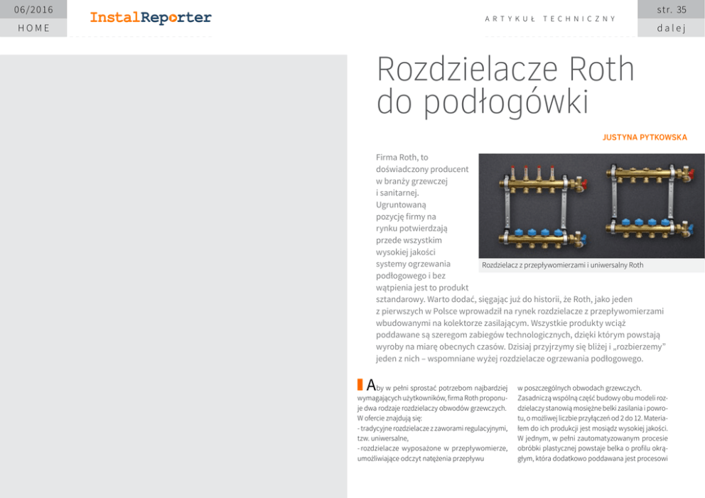 06/2016 HOME a r t y k u ł t e c h n i c z n y s tr. 35 dalej Rozdzielacze Roth do podłogówki Justyna Pytkowska Firma Roth, to doświadczony producent w branży grzewczej i sanitarnej. Ugruntowaną pozycję firmy na rynku potwierdzają przede wszystkim wysokiej jakości systemy ogrzewania Rozdzielacz z przepływomierzami i uniwersalny Roth podłogowego i bez wątpienia jest to produkt sztandarowy. Warto dodać, sięgając już do historii, że Roth, jako jeden z pierwszych w Polsce wprowadził na rynek rozdzielacze z przepływomierzami wbudowanymi na kolektorze zasilającym. Wszystkie produkty wciąż poddawane są szeregom zabiegów technologicznych, dzięki którym powstają wyroby na miarę obecnych czasów. Dzisiaj przyjrzymy się bliżej i „rozbierzemy” jeden z nich – wspomniane wyżej rozdzielacze ogrzewania podłogowego. Aby w pełni sprostać potrzebom najbardziej wymagających użytkowników, firma Roth proponuje dwa rodzaje rozdzielaczy obwodów grzewczych. W ofercie znajdują się: -tradycyjne rozdzielacze z zaworami regulacyjnymi, tzw. uniwersalne, -rozdzielacze wyposażone w przepływomierze, umożliwiające odczyt natężenia przepływu w poszczególnych obwodach grzewczych. Zasadniczą wspólną część budowy obu modeli rozdzielaczy stanowią mosiężne belki zasilania i powrotu, o możliwej liczbie przyłączeń od 2 do 12. Materiałem do ich produkcji jest mosiądz wysokiej jakości. W jednym, w pełni zautomatyzowanym procesie obróbki plastycznej powstaje belka o profilu okrągłym, która dodatkowo poddawana jest procesowi a r t y k u ł HOME Mosiężne belki rozdzielacza Roth Sposób regulacji wielkości przepływu 1. Przepływomierze lub zawory z otwartego/na zamknięte otworzyć max przy użyciu załączonego kluczyka przeciwnie do kierunku wskazówek zegara. 2. Zdjąć kopułkę regulacyjną na 1. obwodzie grzewczym i zamknąć zawór przy użyciu załączonego kluczyka zgodnie z kierunkiem wskazówek zegara = najmniejsza wartość. 3. Nastawić wielkość przepływu poprzez otwarcie trzpienia regulacyjnego na zaworze przy użyciu załączonego kluczyka przeciwnie do kierunku wskazówek zegara. Regulacja na pozostałych obwodach jest analogiczna. 4. Zamontować siłowniki zgodnie z odrębną instrukcją. wypalania piecowego. Dzięki temu następuje lepsze utwardzanie materiału oraz usunięcie tzw. naprężeń resztkowych. Jaki jest celu zabiegu? „W trakcie obróbki metali i stopów, przemian fazowych zachodzących w materiałach i eksploatacji wyrobów, wytwarza się pewien stan naprężeń wewnętrznych. Przyczyną tego faktu są zmiany energetyczne. Pozostałe w ciele naprężenia po ustaniu działania sił zewnętrznych powodują odkształcenie tego ciała. Ze wzrostem odkształcenia plastycznego rośnie energia wewnętrzna ciała, coraz większemu zniekształceniu podlega jego sieć krystaliczna i zmieniają się własności: metal się umacnia, zmniejsza się odporność na korozję, maleje gęstość, wzrasta anizotropia własności związana z teksturą itd.”* W odniesieniu do rozdzielacza ogrzewania podłogowego, naprężenia resztkowe, które przyczyniają się do tworzenia rys naprężeniowych na materiale, może pozostawić np. „woda krytyczna”. Roth wyeliminował ten problem! Wyposażenie rozdzielaczy Właściwe wyposażenie rozdzielacza do instalacji ogrzewania podłogowego zawiera jeszcze kilka nieodzownych elementów. Produkt finalny, jak każdy inny rozdzielacz na rynku, jest przygotowywany do adaptacji pozostałych komponentów. Wykonywane są specjalne nawiercenia belek celem montażu wkładek zaworowych, wkładek termostatycznych oraz nypli z możliwością przyłączenia rur pętli ogrzewania podłogowego za pomocą śrubunka ¾". Pomiędzy kolektory rozdzielacza umieszczane są uchwyty z ocynkowanej blachy stalowej z izolacją akustyczną z elastomera EPDM. Uchwyty te służą do mocowania rozdzielacza w szafce, która w zależności od przyjętego rozwiązania może być montowana natynkowo lub podtynkowo. W celu połączenia rozdzielacza z przewodami pionu instalacji grzewczej, każda jego belka po obu stronach wyposażona jest w wyjścia boczne z gwintem zewnętrznym 1". Króćce znajdujące się na zaworach odcinających belki umoż* Naprężenia własne – pojęcia i klasyfikacja. Politechnika Poznańska. Dominik Senczyk, Sebastian Moryksiewicz t e c h n i c z n y s tr. 36 dalej liwiają montaż siłowników. Odstęp w osiach pomiędzy zaworami wynosi tylko 50 mm, ale nie stanowi to problemu na swobodny montaż siłownika na każdym zaworze. Osie króćców podłączeniowych kolektora zasilającego i powrotnego są bowiem przesunięte względem siebie i nie zachodzą tzw. kolizje tranzytów zasilających i powrotnych do poszczególnych belek rozdzielacza. Jako elementy uzupełniające dostarczane są również komplety do napełniania i opróżniania z odpowietrznikami manualnymi. Regulacja przepływu Obecne modele rozdzielaczy firmy Roth umożliwiają regulację przepływu (w każdym z obwodów grzewczych) na zaworach regulacyjnych, znajdujących się na belce powrotnej. Zawory kolektora zasilającego służą natomiast do zamykania i otwierania poszczególnych obwodów grzewczych. Do doboru wielkości nastaw na pętlach ogrzewania podłogowego służą specjalne diagramy umieszczone w instrukcji montażu, dołączanej do każdego rozdzielacza. Modele z wbudowanymi na kolektorze zasilającym przepływomierzami o skali przepływu w zakresie od 0,1 do 4 l/min pozwalają dokładnie sprawdzić, czy nastawa dołączonym do zestawu kluczem na dolnej belce została wykonana poprawnie. Zatem instalator nie tylko z większą łatwością, ale również i precyzją, dokona regulacji instalacji ogrzewania podłogowego. W przypadku modelu rozdzielacza uniwersalnego regulację przeprowadza się również na dolnej belce, ale za pomocą typowego klucza imbusowego wg nomogramu obrazującego opory przepływu na zaworze, licząc licz