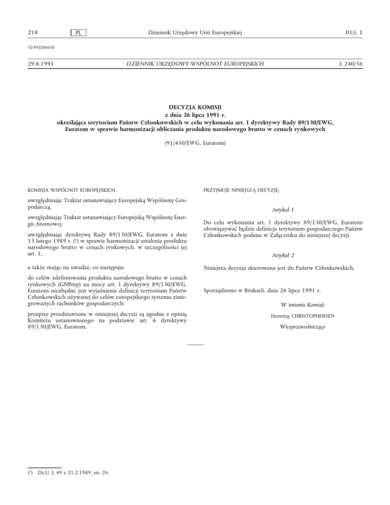 218 PL Dziennik Urzędowy Unii Europejskiej 01/t. 1 31991D0450 29.8.1991 DZIENNIK URZĘDOWY WSPÓLNOT EUROPEJSKICH L 240/36 DECYZJA KOMISJI z dnia 26 lipca 1991 r. określająca terytorium Państw Członkowskich w celu wykonania art. 1 dyrektywy Rady 89/130/EWG, Euratom w sprawie harmonizacji obliczania produktu narodowego brutto w cenach rynkowych (91/450/EWG, Euratom) KOMISJA WSPÓLNOT EUROPEJSKICH, uwzględniając Traktat ustanawiający Europejską Wspólnotę Gospodarczą, uwzględniając Traktat ustanawiający Europejską Wspólnotę Energii Atomowej, uwzględniając dyrektywę Rady 89/130/EWG, Euratom z dnia 13 lutego 1989 r. (1) w sprawie harmonizacji ustalenia produktu narodowego brutto w cenach rynkowych, w szczególności jej art. 1, PRZYJMUJE NINIEJSZĄ DECYZJĘ: Artykuł 1 Do celu wykonania art. 1 dyrektywy 89/130/EWG, Euratom obowiązywać będzie definicja terytorium gospodarczego Państw Członkowskich podana w Załączniku do niniejszej decyzji. Artykuł 2 a także mając na uwadze, co następuje: Niniejsza decyzja skierowana jest do Państw Członkowskich. do celów zdefiniowania produktu narodowego brutto w cenach rynkowych (GNPmp) na mocy art. 1 dyrektywy 89/130/EWG, Euratom niezbędne jest wyjaśnienie definicji terytorium Państw Członkowskich używanej do celów europejskiego systemu zintegrowanych rachunków gospodarczych; Sporządzono w Brukseli, dnia 26 lipca 1991 r. przepisy przedstawione w niniejszej decyzji są zgodne z opinią Komitetu ustanowionego na podstawie art. 6 dyrektywy 89/130/EWG, Euratom, (1) Dz.U. L 49 z 21.2.1989, str. 26. W imieniu Komisji Henning CHRISTOPHERSEN Wiceprzewodniczący 01/t. 1 PL Dziennik Urzędowy Unii Europejskiej ZAŁĄCZNIK Terytorium gospodarcze Królestwa Belgii obejmuje: — terytorium Królestwa Belgii, — krajową przestrzeń powietrzną, wody terytorialne i szelf kontynentalny leżący na wodach międzynarodowych, do którego kraj ma wyłączne prawo, — enklawy terytorialne (tj. terytoria geograficzne usytuowane w innych częściach świata i użytkowane, na mocy traktatów międzynarodowych lub porozumień międzypaństwowych, przez organy władz publicznych tego kraju (ambasady, konsulaty, bazy wojskowe, placówki naukowe itp.)) w odniesieniu do wszystkich transakcji z wyjątkiem transakcji związanych z własnością gruntów stanowiących daną enklawę i budynków stojących na tych gruntach w chwili ich nabycia, — enklawy eksterytorialne (tj. części własnego terytorium geograficznego użytkowane przez organy władz publicznych innych krajów, instytucje Wspólnot Europejskich lub organizacje międzynarodowe na mocy traktatów międzynarodowych lub porozumień międzypaństwowych) wyłącznie w odniesieniu do transakcji, które dotyczą praw własności gruntów stanowiących daną enklawę i budynków stojących na tych gruntach w momencie ich sprzedaży, — złoża ropy naftowej, gazu ziemnego itp. znajdujące się na wodach międzynarodowych poza szelfem kontynentalnym kraju eksploatowane przez jednostki mające siedzibę na terytorium określonym w powyższych akapitach. Terytorium gospodarcze Królestwa Danii obejmuje: — terytorium Królestwa Danii z wyjątkiem Wysp Owczych i Grenlandii, — krajową przestrzeń powietrzną, wody terytorialne i szelf kontynentalny leżący na wodach międzynarodowych, do którego kraj ma wyłączne prawo, — enklawy terytorialne (tj. terytoria geograficzne usytuowane w innych częściach świata i użytkowane, na mocy traktatów międzynarodowych lub porozumień międzypaństwowych, przez organy władz publicznych tego kraju (ambasady, konsulaty, bazy wojskowe, placówki naukowe itp.)) w odniesieniu do wszystkich transakcji z wyjątkiem transakcji związanych z własnością gruntów stanowiących daną enklawę i budynków stojących na tych gruntach w chwili ich nabycia, — enklawy eksterytorialne (tj. części własnego terytorium geograficznego tego kraju użytkowane przez organy władz publicznych innych krajów, instytucje Wspólnot Europejskich lub organizacje międzynarodowe na mocy traktatów międzynarodowych lub porozumień międzypaństwowych) wyłącznie w odniesieniu do transakcji, które dotyczą praw własności gruntów stanowiących daną enklawę i budynków stojących na tych gruntach w momencie ich sprzedaży, — złoża ropy naftowej, gazu ziemnego itp. znajdujące się na wodach międzynarodowych poza szelfem kontynentalnym kraju eksploatowane przez jednostki mające siedzibę na terytorium określonym w powyższych akapitach. Terytorium gospodarcze Republiki Federalnej Niemiec obejmuje: — terytorium Republiki Federalnej Niemiec, — krajową przestrzeń powietrzną, wody terytorialne i szelf kontynentalny leżący na wodach międzynarodowych, do którego kraj ma wyłączne prawo, — enklawy terytorialne (tj. terytoria geograficzne usytuowane w innych częściach świata i użytkowane, na mocy traktatów międzynarodowych lub porozumień międzypaństwowych, przez organy władz publicznych tego kraju (ambasady, konsulaty, bazy wojskowe, placówki naukowe itp.)) w odniesieniu do wszystkich transakcji z wyjątkiem transakcji związanych z własnością gruntów stanowiących daną enklawę i budynków stojących na tych gruntach w chwili ich nabycia, — enklawy eksterytorialne (tj. części własnego terytorium geograficznego tego kraju użytkowane przez organy władz publicznych innych krajów, instytucje Wspólnot Europejskich lub organizacje międzynarodowe na mocy traktatów międzynarodowych lub porozumień międzypaństwowych) wyłącznie w odniesieniu do transakcji, które dotyczą praw własności gruntów stanowiących daną enklawę i budynków stojących na tych gruntach w momencie ich sprzedaży, — złoża ropy naftowej, gazu ziemnego itp. znajdujące się na wodach międzynarodowych poza szelfem kontynentalnym kraju eksploatowane przez jednostki mające siedzibę na terytorium określonym w powyższych akapitach. Terytorium g