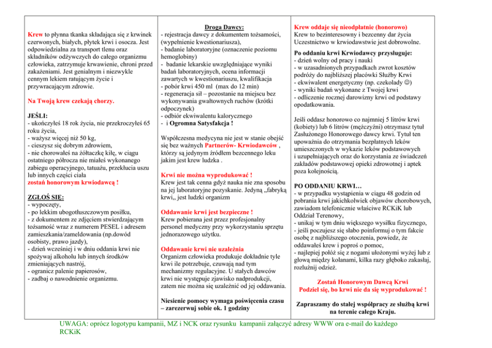 Krew to płynna tkanka składająca się z krwinek czerwonych, białych, płytek krwi i osocza. Jest odpowiedzialna za transport tlenu oraz składników odżywczych do całego organizmu człowieka, zatrzymuje krwawienie, chroni przed zakażeniami. Jest genialnym i niezwykle cennym lekiem ratującym życie i przywracającym zdrowie. Na Twoją krew czekają chorzy. JEŚLI: - ukończyłeś 18 rok życia, nie przekroczyłeś 65 roku życia, - ważysz więcej niż 50 kg, - cieszysz się dobrym zdrowiem, - nie chorowałeś na żółtaczkę kiłę, w ciągu ostatniego półrocza nie miałeś wykonanego zabiegu operacyjnego, tatuażu, przekłucia uszu lub innych części ciała zostań honorowym krwiodawcą ! ZGŁOŚ SIĘ: - wypoczęty, - po lekkim ubogotłuszczowym posiłku, - z dokumentem ze zdjęciem stwierdzającym tożsamość wraz z numerem PESEL i adresem zamieszkania/zameldowania (np.dowód osobisty, prawo jazdy), - dzień wcześniej i w dniu oddania krwi nie spożywaj alkoholu lub innych środków zmieniających nastrój, - ogranicz palenie papierosów, - zadbaj o nawodnienie organizmu. Droga Dawcy: - rejestracja dawcy z dokumentem tożsamości, (wypełnienie kwestionariusza), - badanie laboratoryjne (oznaczenie poziomu hemoglobiny) - badanie lekarskie uwzględniające wyniki badań laboratoryjnych, ocena informacji zawartych w kwestionariuszu, kwalifikacja - pobór krwi 450 ml (max do 12 min) - regeneracja sił – pozostanie na miejscu bez wykonywania gwałtownych ruchów (krótki odpoczynek) - odbiór ekwiwalentu kalorycznego - i Ogromna Satysfakcja ! Współczesna medycyna nie jest w stanie obejść się bez ważnych Partnerów- Krwiodawców , którzy są jedynym źródłem bezcennego leku jakim jest krew ludzka . Krwi nie można wyprodukować ! Krew jest tak cenna gdyż nauka nie zna sposobu na jej laboratoryjne pozyskanie. Jedyną „fabryką krwi,, jest ludzki organizm Oddawanie krwi jest bezpieczne ! Krew pobierana jest przez profesjonalny personel medyczny przy wykorzystaniu sprzętu jednorazowego użytku. Oddawanie krwi nie uzależnia Organizm człowieka produkuje dokładnie tyle krwi ile potrzebuje, czuwają nad tym mechanizmy regulacyjne. U stałych dawców krwi nie występuje zjawisko nadprodukcji, zatem nie można się uzależnić od jej oddawania. Niesienie pomocy wymaga poświęcenia czasu – zarezerwuj sobie ok. 1 godziny Krew oddaje się nieodpłatnie (honorowo) Krew to bezinteresowny i bezcenny dar życia Uczestnictwo w krwiodawstwie jest dobrowolne. Po oddaniu krwi Krwiodawcy przysługuje: - dzień wolny od pracy i nauki - w uzasadnionych przypadkach zwrot kosztów podróży do najbliższej placówki Służby Krwi - ekwiwalent energetyczny (np. czekolady ☺) - wyniki badań wykonane z Twojej krwi - odliczenie rocznej darowizny krwi od podstawy opodatkowania. Jeśli oddasz honorowo co najmniej 5 litrów krwi (kobiety) lub 6 litrów (mężczyźni) otrzymasz tytuł Zasłużonego Honorowego dawcy krwi. Tytuł ten upoważnia do otrzymania bezpłatnych leków umieszczonych w wykazie leków podstawowych i uzupełniających oraz do korzystania ze świadczeń zakładów podstawowej opieki zdrowotnej i aptek poza kolejnością. PO ODDANIU KRWI… - w przypadku wystąpienia w ciągu 48 godzin od pobrania krwi jakichkolwiek objawów chorobowych, zawiadom telefonicznie właściwe RCKiK lub Oddział Terenowy, - unikaj w tym dniu większego wysiłku fizycznego, - jeśli poczujesz się słabo poinformuj o tym fakcie osobę z najbliższego otoczenia, powiedz, że oddawałeś krew i poproś o pomoc, - najlepiej połóż się z nogami ułożonymi wyżej lub z głową między kolanami, kilka razy głęboko zakasłaj, rozluźnij odzież. Zostań Honorowym Dawcą Krwi Podziel się, bo krwi nie da się wyprodukować ! Zapraszamy do stałej współpracy ze służbą krwi na terenie całego Kraju. UWAGA: oprócz logotypu kampanii, MZ i NCK oraz rysunku kampanii załączyć adresy WWW ora e-mail do każdego RCKiK