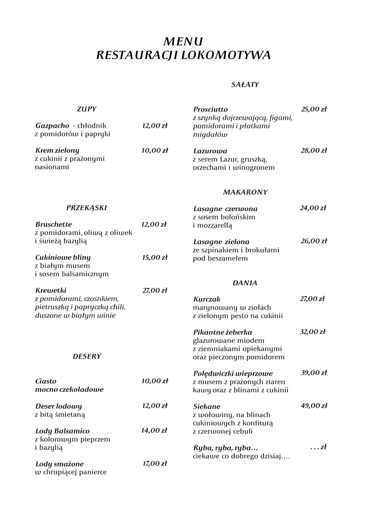 MENU RESTAURACJI LOKOMOTYWA SAŁATY ZUPY Gazpacho - chłodnik z pomidorów i papryki 12,00 zł Krem zielony z cukinii z prażonymi nasionami 10,00 zł Prosciutto z szynką dojrzewającą, figami, pomidorami i płatkami migdałów 25,00 zł Lazurowa z serem Lazur, gruszką, orzechami i winogronem 28,00 zł MAKARONY PRZEKĄSKI Bruschette z pomidorami, oliwą z oliwek i świeżą bazylią 12,00 zł Lasagne czerwona z sosem bolońskim i mozzarellą Cukiniowe bliny z białym musem i sosem balsamicznym 15,00 zł Lasagne zielona ze szpinakiem i brokułami pod beszamelem Krewetki z pomidorami, czosnkiem, pietruszką i papryczką chili, duszone w białym winie 27,00 zł 24,00 zł 26,00 zł DANIA DESERY Ciasto mocno czekoladowe 10,00 zł Deser lodowy z bitą śmietaną 12,00 zł Lody Balsamico z kolorowym pieprzem i bazylią 14,00 zł Lody smażone w chrupiącej panierce 17,00 zł Kurczak marynowany w ziołach z zielonym pesto na cukinii 27,00 zł Pikantne żeberka glazurowane miodem z ziemniakami opiekanymi oraz pieczonym pomidorem 32,00 zł Polędwiczki wieprzowe z musem z prażonych ziaren kawy oraz z blinami z cukinii 39,00 zł Siekane z wołowiny, na blinach cukiniowych z konfiturą z czerwonej cebuli 49,00 zł Ryba, ryba, ryba… ciekawe co dobrego dzisiaj…. . . . zł