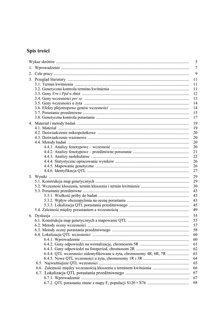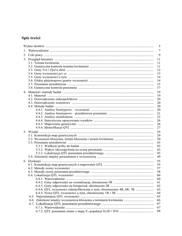 Spis treści Wykaz skrótów .................................................................................................................................. 5 1. Wprowadzenie ................................................................................................................................ 7 2. Cele pracy ....................................................................................................................................... 9 3. Przegląd literatury ..........................................................................................................................11 3.1. Termin kwitnienia ...................................................................................................................11 3.2. Genetyczna kontrola terminu kwitnienia .................................................................................11 3.3. Geny Vrn i Ppd u zbóż ............................................................................................................12 3.4. Geny wczesności per se ..........................................................................................................13 3.5. Geny wczesności u żyta ..........................................................................................................14 3.6. Efekty plejotropowe genów wczesności .................................................................................14 3.7. Porastanie przedżniwne ...........................................................................................................15 3.8. Genetyczna kontrola porastania ..............................................................................................17 4. Materiał i metody badań .................................................................................................................19 4.1. Materiał ................................................................................................................................ 19 4.2. Doświadczenie mikropoletkowe .............................................................................................20 4.3. Doświadczenie wazonowe ......................................................................................................20 4.4. Metody badań ..........................................................................................................................20 4.4.1. Analizy fenotypowe – wczesność ........................................................................................ 20 4.4.2. Analizy fenotypowe – przedżniwne porastanie ................................................................ 21 4.4.3. Analizy molekularne ................................................................................................ 22 4.4.4. Statystyczne opracowanie wyników ..................................................................................... 26 4.4.5. Mapowanie genetyczne ................................................................................................26 4.4.6. Identyfikacja QTL ................................................................................................................ 27 5. Wyniki ............................................................................................................................................29 5.1. Konstrukcja map genetycznych ...............................................................................................29 5.2. Wczesność kłoszenia, termin kłoszenia i termin kwitnienia ...................................................30 5.3. Porastanie przedżniwne ...........................................................................................................43 5.3.1. Wielkość próby do badań ................................................................................................ 43 5.3.2. Wpływ obcozapylenia na ocenę porastania ................................................................43 5.3.3. Lokalizacja QTL porastania przedżniwnego ................................................................45 5.4. Zależność między porastaniem a wczesnością ........................................................................49 6. Dyskusja .........................................................................................................................................55 6.1. Konstrukcja map genetycznych a mapowanie QTL ................................................................55 6.2. Metody oceny wczesności .......................................................................................................57 6.3. Metody oceny porastania przedżniwnego ...............................................................................58 6.4. Lokalizacja QTL wczesności ................................................................................................ 60 6.4.1. Wprowadzenie ...................................................................................................................... 60 6.4.2. Geny odpowiedzi na wernalizację, chromosom 5R ............................................................. 61 6.4.3. Geny odpowiedzi na fotoperiod, chromosom 2R ................................................................ 62 6.4.4. QTL wczesności zidentyfikowane u żyta, chromosomy 4R, 6R, 7R ................................ 63 6.4.5. Nowe QTL wczesności u żyta, chromosomy 1R i 3R .......................................................... 64 6.5. Najważniejsze QTL wczesności .............................................................................................65 6.6. Zależność między wczesnością kłoszenia a terminem kwitnienia .........................................66 6.7. Lokalizacja QTL porastania przedżniwnego ..............................................................67 6.7.1. Wprowadzenie ...................................................................................................................... 67 68 6.7.2. 