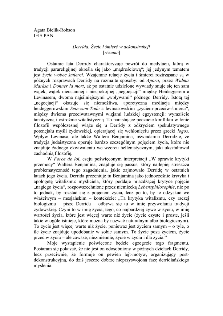 Agata Bielik-Robson IFIS PAN Derrida. Życie i śmierć w dekonstrukcji [résumé] Ostatnie lata Derridy charakteryzuje powrót do medytacji, którą w tradycji parareligijnej określa się jako „mądrościową“; jej jedynym tematem jest życie wobec śmierci. Wzajemne relacje życia i śmierci roztrząsane są w późnych rozprawach Derridy na rozmaite sposoby: od Aporii, przez Widma Marksa i Donner la mort, aż po ostatnie udzielone wywiady snuje się ten sam wątek, wątek nieustannej i niespokojnej „negocjacji“ między Heideggerem a Levinasem, dwoma najsilniejszymi „wpływami“ późnego Derridy. Istotą tej „negocjacji“ okazuje się niemożliwa, aporetyczna mediacja między heideggerowskim Sein-zum-Tode a levinasowskim „życiem-przeciw-śmierci“, między dwiema przeciwstawnymi wizjami ludzkiej egzystencji: wyraziście tanatyczną i ostrożnie witalistyczną. To narastające poczucie konfliktu w łonie filozofii współczesnej wiąże się u Derridy z odkryciem spekulatywnego potencjału myśli żydowskiej, opierającej się wchłonięciu przez grecki logos. Wpływ Levinasa, ale także Waltera Benjamina, uświadamia Derridzie, że tradycja judaistyczna operuje bardzo szczególnym pojęciem życia, które nie znajduje żadnego ekwiwalentu we wzorcu hellenistycznym, jaki ukształtował zachodnią filozofię. W Force de loi, eseju poświęconym interpretacji „W sprawie krytyki przemocy“ Waltera Benjamina, znajduje się passus, który najlepiej streszcza problematyczność tego zagadnienia, jakie zajmowało Derridę w ostatnich latach jego życia. Derrida prezentuje tu Benjamina jako jednocześnie krytyka i apologetę witalizmu: myśliciela, który poddaje miażdżącej krytyce pojęcie „nagiego życia“, rozpowszechnione przez niemiecką Lebensphilosophie, nie po to jednak, by rozstać się z pojęciem życia, lecz po to, by je odzyskać we właściwym – mesjańskim – kontekście: „Ta krytyka witalizmu, czy raczej biologizmu – pisze Derrida – odbywa się tu w imię przywołania tradycji żydowskiej. Czyni to w imię życia, tego, co najbardziej żywe w życiu, w imię wartości życia, które jest więcej warte niż życie (życie czyste i proste, jeśli takie w ogóle istnieje, które można by nazwać naturalnym albo biologicznym). To życie jest więcej warte niż życie, ponieważ jest życiem samym – o tyle, o ile życie znajduje upodobanie w sobie samym. To życie poza życiem, życie przeciw życiu – ale zawsze, niezmiennie, życie w życiu i dla życia.“ Moje wystąpienie poświęcone będzie egzegezie tego fragmentu. Postaram się pokazać, że nie jest on odosobniony w późnych dziełach Derridy, lecz przeciwnie, że formuje on pewien lejt-motyw, organizujący postdekonstrukcyjną, do dziś jeszcze dobrze nieprzyswojoną fazę derridiańskiego myślenia.