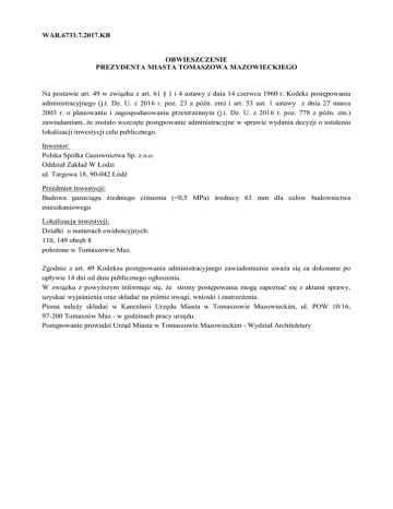 WAR.6733.7.2017.KB OBWIESZCZENIE PREZYDENTA MIASTA TOMASZOWA MAZOWIECKIEGO Na postawie art. 49 w związku z art. 61 § 1 i 4 ustawy z dnia 14 czerwca 1960 r. Kodeks postępowania administracyjnego (j.t. Dz. U. z 2016 r. poz. 23 z późn. zm) i art. 53 ust. 1 ustawy z dnia 27 marca 2003 r. o planowaniu i zagospodarowaniu przestrzennym (j.t. Dz. U. z 2016 r. poz. 778 z późn. zm.) zawiadamiam, że zostało wszczęte postępowanie administracyjne w sprawie wydania decyzji o ustaleniu lokalizacji inwestycji celu publicznego. Inwestor: Polska Spółka Gazownictwa Sp. z o.o. Oddział Zakład W Łodzi ul. Targowa 18, 90-042 Łódź Przedmiot inwestycji: Budowa gazociągu średniego ciśnienia (<0,5 MPa) średnicy 63 mm dla celów budownictwa mieszkaniowego Lokalizacja inwestycji: Działki o numerach ewidencyjnych: 110, 149 obręb 8 położone w Tomaszowie Maz. Zgodnie z art. 49 Kodeksu postępowania administracyjnego zawiadomienie uważa się za dokonane po upływie 14 dni od dnia publicznego ogłoszenia. W związku z powyższym informuje się, że strony postępowania mogą zapoznać się z aktami sprawy, uzyskać wyjaśnienia oraz składać na piśmie uwagi, wnioski i zastrzeżenia. Pisma należy składać w Kancelarii Urzędu Miasta w Tomaszowie Mazowieckim, ul. POW 10/16, 97-200 Tomaszów Maz.- w godzinach pracy urzędu. Postępowanie prowadzi Urząd Miasta w Tomaszowie Mazowieckim - Wydział Architektury