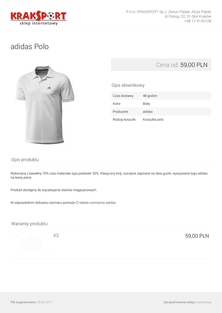 P.H.U. KRAKSPORT Sp.J. Zenon Piętak, Alicja Piętak Al.Pokoju 32, 31-564 Kraków +48 12 4140108 adidas Polo Cena od: 59,00 PLN Opis słownikowy Czas dostawy 48 godzin Kolor Biały Producent adidas Rodzaj koszulki Koszulka polo Opis produktu Wykonana z bawełny 70% oraz materiału typu poliester 30%. Klasyczny krój, rozcięcie zapinane na dwa guziki, wyszywane logo adidas na lewej piersi. Produkt dostępny do wyczerpania stanów magazynowych. W odpowiednim dobraniu rozmiaru pomoże Ci tabela rozmiarów adidas Warianty produktu XS Plik wygenerowano: 09-03-2017 59,00 PLN Oprogramowanie sklepu: AptusShop P.H.U. KRAKSPORT Sp.J. Zenon Piętak, Alicja Piętak Al.Pokoju 32, 31-564 Kraków +48 12 4140108 Plik wygenerowano: 09-03-2017 Powered by TCPDF (www.tcpdf.org) XL 59,00 PLN XXXL 59,00 PLN Oprogramowanie sklepu: AptusShop