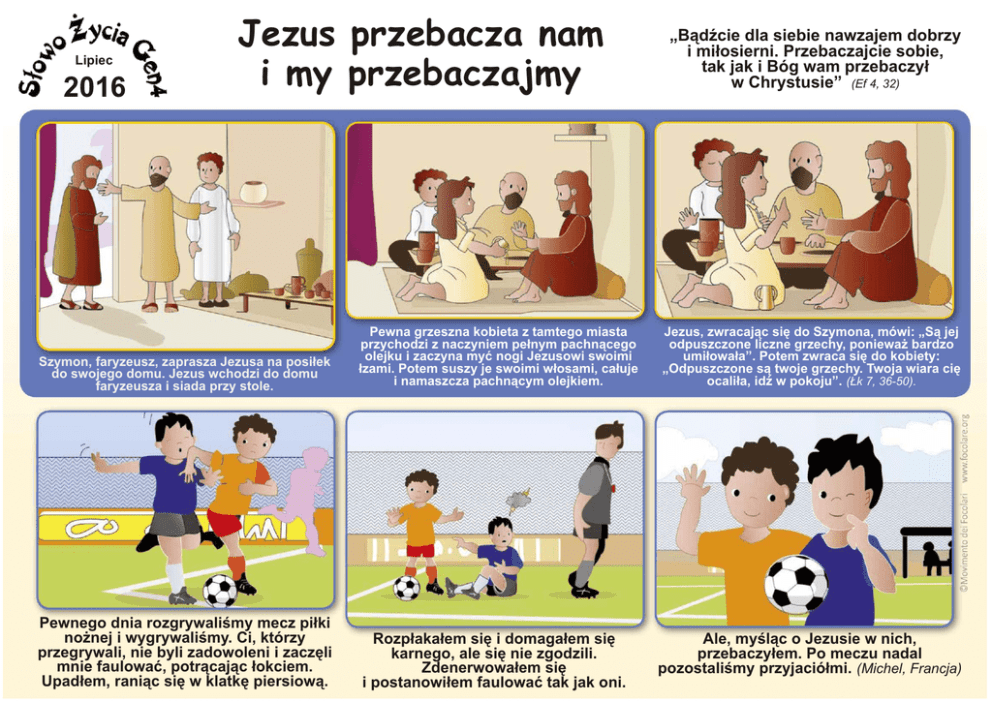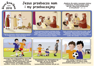 Lipiec 2016 Jezus przebacza nam i my przebaczajmy Szymon, faryzeusz, zaprasza Jezusa na posi³ek do swojego domu. Jezus wchodzi do domu faryzeusza i siada przy stole. Pewna grzeszna kobieta z tamtego miasta przychodzi z naczyniem pe³nym pachn¹cego olejku i zaczyna myæ nogi Jezusowi swoimi ³zami. Potem suszy je swoimi w³osami, ca³uje i namaszcza pachn¹cym olejkiem. Pewnego dnia rozgrywaliœmy mecz pi³ki no¿nej i wygrywaliœmy. Ci, którzy przegrywali, nie byli zadowoleni i zaczêli mnie faulowaæ, potr¹caj¹c ³okciem. Upad³em, rani¹c siê w klatkê piersiow¹. Rozp³aka³em siê i domaga³em siê karnego, ale siê nie zgodzili. Zdenerwowa³em siê i postanowi³em faulowaæ tak jak oni. „B¹dŸcie dla siebie nawzajem dobrzy i mi³osierni. Przebaczajcie sobie, tak jak i Bóg wam przebaczy³ w Chrystusie” (Ef 4, 32) Jezus, zwracaj¹c siê do Szymona, mówi: „S¹ jej odpuszczone liczne grzechy, poniewa¿ bardzo umi³owa³a”. Potem zwraca siê do kobiety: „Odpuszczone s¹ twoje grzechy. Twoja wiara ciê ocali³a, idŸ w pokoju”. (£k 7, 36-50). Ale, myœl¹c o Jezusie w nich, przebaczy³em. Po meczu nadal pozostaliœmy przyjació³mi. (Michel, Francja)