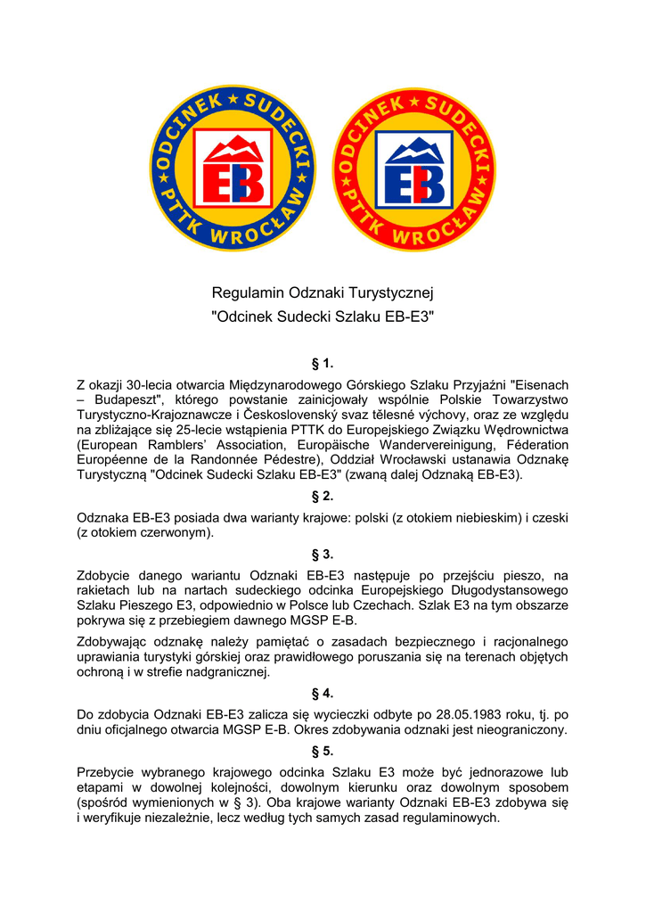 Regulamin Odznaki Turystycznej "Odcinek Sudecki Szlaku EB-E3" § 1. Z okazji 30-lecia otwarcia Międzynarodowego Górskiego Szlaku Przyjaźni "Eisenach – Budapeszt", którego powstanie zainicjowały wspólnie Polskie Towarzystwo Turystyczno-Krajoznawcze i Československý svaz tělesné výchovy, oraz ze względu na zbliżające się 25-lecie wstąpienia PTTK do Europejskiego Związku Wędrownictwa (European Ramblers’ Association, Europäische Wandervereinigung, Féderation Européenne de la Randonnée Pédestre), Oddział Wrocławski ustanawia Odznakę Turystyczną "Odcinek Sudecki Szlaku EB-E3" (zwaną dalej Odznaką EB-E3). § 2. Odznaka EB-E3 posiada dwa warianty krajowe: polski (z otokiem niebieskim) i czeski (z otokiem czerwonym). § 3. Zdobycie danego wariantu Odznaki EB-E3 następuje po przejściu pieszo, na rakietach lub na nartach sudeckiego odcinka Europejskiego Długodystansowego Szlaku Pieszego E3, odpowiednio w Polsce lub Czechach. Szlak E3 na tym obszarze pokrywa się z przebiegiem dawnego MGSP E-B. Zdobywając odznakę należy pamiętać o zasadach bezpiecznego i racjonalnego uprawiania turystyki górskiej oraz prawidłowego poruszania się na terenach objętych ochroną i w strefie nadgranicznej. § 4. Do zdobycia Odznaki EB-E3 zalicza się wycieczki odbyte po 28.05.1983 roku, tj. po dniu oficjalnego otwarcia MGSP E-B. Okres zdobywania odznaki jest nieograniczony. § 5. Przebycie wybranego krajowego odcinka Szlaku E3 może być jednorazowe lub etapami w dowolnej kolejności, dowolnym kierunku oraz dowolnym sposobem (spośród wymienionych w § 3). Oba krajowe warianty Odznaki EB-E3 zdobywa się i weryfikuje niezależnie, lecz według tych samych zasad regulaminowych. Orientacyjny przebieg Szlaku E3 w Sudetach polskich i czeskich podają załączniki do niniejszego regulaminu. W przypadku zmiany przebiegu szlaku należy dostosować się do aktualnie obowiązującego oznakowania. § 6. Przebycie każdego etapu Szlaku E3 należy udokumentować książeczkami turystyki kwalifikowanej (np. GOT) albo samodzielnie prowadzoną kroniką. Samodzielnie prowadzona kronika powinna zawierać następujące informacje: dane personalne (imię i nazwisko, datę urodzenia, adres), daty wycieczek, trasy wędrówek, potwierdzenia wycieczek (np. pieczątki mijanych obiektów turystycznych, bilety wstępu zwiedzonych przy trasie miejsc, fotografie zdobywającego przy charakterystycznych punktach trasy, podpisy i pieczątki kadry turystycznej uczestniczącej w wycieczce). Zdobywca przedstawiający do weryfikacji książeczki turystyki kwalifikowanej dostarcza razem z nimi wykaz chronologiczny wycieczek zaliczanych do Odznaki EB-E3, tak aby weryfikator mógł łatwo odnaleźć w książeczkach wszystkie etapy Szlaku E3. § 7. Do potwierdzania wycieczek uprawnieni są przewodnicy turystyczni i przodownicy turystyki kwalifikowanej, z uwzględnieniem ich merytorycznych oraz terytorialnych zakresów uprawnień. § 8. Zdobywanie Odznaki EB-E3 nie wyklucza jednoczesnego zdobywania innych odznak PTTK. § 9. Weryfikację Odznaki EB-E3 prowadzi Komisja Turystyki Górskiej Oddziału Wrocławskiego PTTK Rynek-Ratusz 11/12, 50-106 Wrocław. Weryfikatorzy mają prawo do przeprowadzenia stosownej rozmowy z ubiegającym się o odznakę. Zweryfikowanie przedstawionej dokumentacji i nadanie odpowiedniego wariantu Odznaki EB-E3 potwierdza się wydaniem legitymacji. Weryfikacja odbywa się nieodpłatnie, zdobywający ponosi koszty zakupu odznaki i legitymacji oraz ewentualne koszty przesyłki pocztowej. § 10. Wątpliwości związane z interpretacją niniejszego regulaminu rozstrzygają weryfikatorzy Komisji Turystyki Górskiej Oddziału Wrocławskiego PTTK. § 11. Niniejszy regulamin został uchwalony na posiedzeniu Zarządu Oddziału Wrocławskiego PTTK w dniu 17 czerwca 2013 r. i obowiązuje od daty jego uchwalenia. Załącznik nr 1 Orientacyjny przebieg odcinka sudeckiego Szlaku E3 w Polsce: Jakuszyce (granica państwa) – Przełęcz Szklarska – Rozdroże Izerskie – Bobrowe Skały – Jezioro Pilchowickie – Płoszczyna – Okole1 – Skopiec2 – Radomierz – Schronisko "Szwajcarka" (Krzyżna Góra)3 – Skalnik1 – Kamienna Góra – Chełmiec1 – Szczawno Zdrój – Wałbrzych-Rusinowa – Klasztorzysko1 – Zamek Grodno – Wielka Sowa1 – Srebrna Góra (Ostróg)2 – Bardo – Przełęcz Kłodzka – Lądek Zdrój – Stary Gierałtów – Nowa Morawa – Schronisko "Na Śnieżniku" – Międzylesie – północny skraj Boboszowa – Boboszów (granica państwa). Przebycie poniższych fragmentów Szlaku E3 nie jest wymagane do zdobycia polskiego wariantu Odznaki EB-E3: Jakuszyce (granica państwa) – Przełęcz Szklarska oraz północny skraj Boboszowa – Boboszów (granica państwa). Załącznik nr 2 Orientacyjny przebieg odcinka sudeckiego Szlaku E3 w Czechach: Studený – Studenec3 – Jedlová3 – Luž3 – Hvozd1 – Velký Vápenný1 – Ještěd3 – Liberec – Jizera3 – Smědava – Jizerka (Bukovec)3 – Harrachov – Harrachov (granica państwa) Dolní Lipka (granica państwa) – Dolní Boříkovice – Králíky – Králický Sněžník1 – Schronisko "Paprsek" – Keprník1 – Praděd3 – Vysoká hole1 – Rýmařov – Ryžoviště – Slunečná1 – Budišov nad Budišovkou – Vikštejn3 – Hradec nad Moravicí – Fulnek – Suchdol nad Odrou – most na Odrze przed Bernaticami. Przebycie poniższych fragmentów Szlaku E3 nie jest wymagane do zdobycia czeskiego wariantu Odznaki EB-E3: Harrachov – Harrachov (granica państwa) oraz Dolní Lipka (granica państwa) – Dolní Boříkovice. Przypisy do załączników: 1 Szczyt jest zaliczany do odznak "Korona Sudetów" lub "Sudecki Włóczykij". 2 Patrz przypis 1. Szlak E3 przechodzi obok szczytu. Patrz przypis 1. Szlak E3 przechodzi obok szczytu; na wierzchołek prowadzi tzw. odboczka. 3