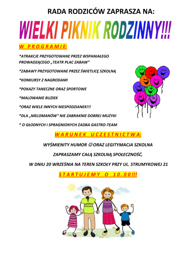 RADA RODZICÓW ZAPRASZA NA: W P R O G R A M I E: *ATRAKCJE PRZYGOTOWANE NE PRZEZ W WSPANIAŁEGO PROWADZĄCEGO „TEATR PLAC ZABAW” *ZABAWY ZABAWY PRZYGOTOWANE PRZEZ ŚWIETLICĘ SZKOLNĄ *KONKURSY Z NAGRODAMI *POKAZY POKAZY TANECZNE ORAZ SPORTOWE *MALOWANIE BUZIEK *ORAZ WIELE INNYCH NIESPODZIANEK!!! *DLA DLA „MELOMANÓW” NIE ZABRAKNIE DOBREJ MUZYKI * O GŁODNYCH I SPRAGNIONYCH ZADBA GASTRO-TEAM W A R U N E K U C Z E S T N I C T W A: WYŚMIENITY HUMOR ☺ ORAZ LEGITYMACJA SZKOLNA ZAPRASZAMY CAŁĄ SZKOLNĄ SPOŁECZNOŚĆ, W DNIU 20 WRZEŚNIA NA TEREN SZKOŁY PRZY UL. STRUMYKOWEJ 21 S T A R T U J E M Y O 1 0 . 0 0 !!!