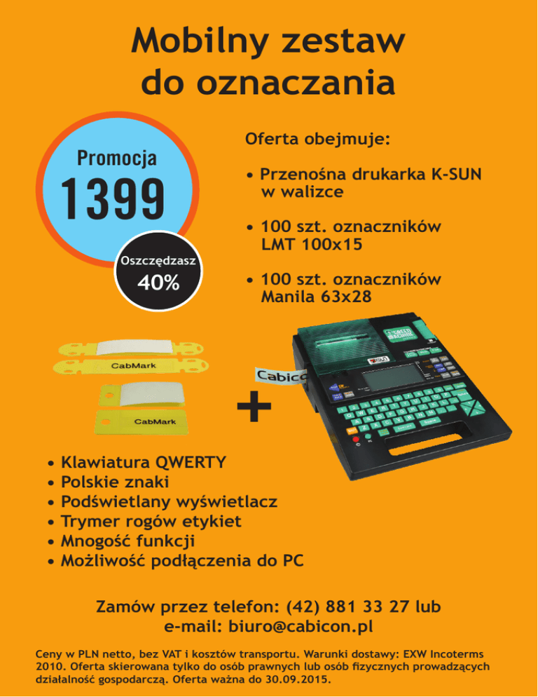 Mobilny zestaw do oznaczania Promocja 1399 Oszczędzasz 40% Oferta obejmuje: • Przenośna drukarka K-SUN w walizce • 100 szt. oznaczników LMT 100x15 • 100 szt. oznaczników Manila 63x28 + • Klawiatura QWERTY • Polskie znaki • Podświetlany wyświetlacz • Trymer rogów etykiet • Mnogość funkcji • Możliwość podłączenia do PC Zamów przez telefon: (42) 881 33 27 lub e-mail: [email protected] Ceny w PLN netto, bez VAT i kosztów transportu. Warunki dostawy: EXW Incoterms 2010. Oferta skierowana tylko do osób prawnych lub osób fizycznych prowadzących działalność gospodarczą. Oferta ważna do 30.09.2015.