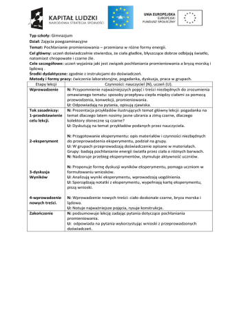 [Wpisz tekst] Typ szkoły: Gimnazjum Dział: Zajęcia poegzaminacyjne Temat: Pochłanianie promieniowania – przemiana w różne formy energii. Cel główny: uczeń doświadczalnie stwierdza, że ciała gładkie, błyszczące dobrze odbijają światło, natomiast chropowate i czarne źle. Cele szczegółowe: uczeń wyjaśnia jaki jest związek pochłaniania promieniowania a bryzą morską i lądową . Środki dydaktyczne: zgodnie z instrukcjami do doświadczeń. Metody i formy pracy: ćwiczenia laboratoryjne, pogadanka, dyskusja, praca w grupach. Etapy lekcji Czynności: nauczyciel (N), uczeń (U). Wprowadzenie N: Przypomnienie najważniejszych pojęć i treści niezbędnych do zrozumienia omawianego tematu: sposoby przepływu ciepła między ciałami za pomocą przewodzenia, konwekcji, promieniowania. U: Odpowiadają na pytania, opisują zjawiska. Tok zasadniczy: N: Prezentacja przykładów ilustrujących temat główny lekcji: pogadanka na 1-przedstawienie temat dlaczego latem nosimy jasne ubrania a zimą czarne, dlaczego celu lekcji. kolektory słoneczne są czarne? U: Dyskutują na temat przykładów podanych przez nauczyciela. 2-eksperyment 3-dyskusja Wyników 4-wprowadzenie nowych treści. Zakończenie N: Przygotowanie eksperymentu: opis materiałów i czynności niezbędnych do przeprowadzenia eksperymentu, podział na grupy. U: W grupach przeprowadzają doświadczenie opisane w materiałach. Grupy: badają pochłanianie energii światła przez ciała o różnych barwach. N: Nadzoruje przebieg eksperymentów, stymuluje aktywność uczniów. N: Proponuje formę dyskusji wyników eksperymentu, pomaga uczniom w formułowaniu wniosków. U: Analizują wyniki eksperymentu, wprowadzają uogólnienia. U: Sporządzają notatki z eksperymentu, wypełniają kartę eksperymentu, piszą wnioski. N: Wprowadzenie nowych treści: ciało doskonale czarne, bryza morska i lądowa. U: Notuje najważniejsze pojęcia, rysuje konstrukcje. N: podsumowuje lekcję zadając pytania dotyczące pochłaniania promieniowania. U: odpowiada na pytania wykorzystując wnioski z przeprowadzonych doświadczeń. [Wpisz tekst] Karta eksperymentu Temat eksperymentu Instrukcja wykonania Obserwacje (opisujemy w punktach przebieg eksperymentu: przyczyna skutek) Wnioski (odniesienie do teorii) Pochłanianie energii światła przez ciała o różnych barwach. Sporządzić zestaw doświadczalny zgodnie z instrukcją (materiały str…). Nalej do puszek (jedna pomalowana na czarno a druga na biało) jednakową ilość wody. Zmierz temperaturę wody w obu puszkach używając termometrów. Tuż przed puszkami z włożonymi termometrami ustaw lampę, tak aby oświetlała równomiernie boczną powierzchnię obu puszek. Włącz lampę i przez kilkanaście minut obserwuj wskazania obu termometrów. Jak wyjaśnić wynik doświadczenia?