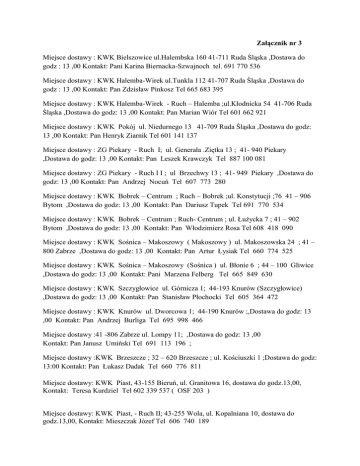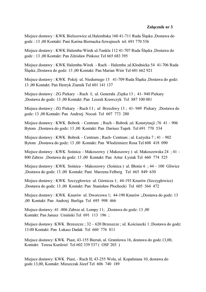 Załącznik nr 3 Miejsce dostawy : KWK Bielszowice ul.Halembska 160 41-711 Ruda Śląska ,Dostawa do godz : 13 ,00 Kontakt: Pani Karina Biernacka-Szwajnoch tel. 691 770 536 Miejsce dostawy : KWK Halemba-Wirek ul.Tunkla 112 41-707 Ruda Śląska ,Dostawa do godz : 13 ,00 Kontakt: Pan Zdzisław Pinkosz Tel 665 683 395 Miejsce dostawy : KWK Halemba-Wirek - Ruch – Halemba ;ul.Kłodnicka 54 41-706 Ruda Śląska ,Dostawa do godz: 13 ,00 Kontakt: Pan Marian Wiór Tel 601 662 921 Miejsce dostawy : KWK Pokój ul. Niedurnego 13 41-709 Ruda Śląska ,Dostawa do godz: 13 ,00 Kontakt: Pan Henryk Ziarnik Tel 601 141 137 Miejsce dostawy : ZG Piekary - Ruch I; ul. Generała .Ziętka 13 ; 41- 940 Piekary ,Dostawa do godz: 13 ,00 Kontakt: Pan Leszek Krawczyk Tel 887 100 081 Miejsce dostawy : ZG Piekary - Ruch I I ; ul Brzechwy 13 ; 41- 949 Piekary ,Dostawa do godz: 13 ,00 Kontakt: Pan Andrzej Nocuń Tel 607 773 280 Miejsce dostawy : KWK Bobrek – Centrum ; Ruch – Bobrek ;ul. Konstytucji ;76 41 – 906 Bytom ,Dostawa do godz: 13 ,00 Kontakt: Pan Dariusz Tupek Tel 691 770 534 Miejsce dostawy : KWK Bobrek – Centrum ; Ruch- Centrum ; ul. Łużycka 7 ; 41 – 902 Bytom ,Dostawa do godz: 13 ,00 Kontakt: Pan Włodzimierz Rosa Tel 608 418 090 Miejsce dostawy : KWK Sośnica – Makoszowy ( Makoszowy ) ul. Makoszowska 24 ; 41 – 800 Zabrze ,Dostawa do godz: 13 ,00 Kontakt: Pan Artur Łysiak Tel 660 774 525 Miejsce dostawy : KWK Sośnica – Makoszowy (Sośnica ) ul. Błonie 6 ; 44 – 100 Gliwice ,Dostawa do godz: 13 ,00 Kontakt: Pani Marzena Felberg Tel 665 849 630 Miejsce dostawy : KWK Szczygłowice ul. Górnicza 1; 44-193 Knurów (Szczygłowice) ,Dostawa do godz: 13 ,00 Kontakt: Pan Stanisław Płochocki Tel 605 364 472 Miejsce dostawy : KWK Knurów ul. Dworcowa 1; 44-190 Knurów ;,Dostawa do godz: 13 ,00 Kontakt: Pan Andrzej Burliga Tel 695 998 466 Miejsce dostawy :41 -806 Zabrze ul. Lompy 11; ,Dostawa do godz: 13 ,00 Kontakt: Pan Janusz Umiński Tel 691 113 196 ; Miejsce dostawy :KWK Brzeszcze ; 32 – 620 Brzeszcze ; ul. Kościuszki 1 ;Dostawa do godz: 13:00 Kontakt: Pan Łukasz Dadak Tel 660 776 811 Miejsce dostawy: KWK Piast, 43-155 Bieruń, ul. Granitowa 16, dostawa do godz.13,00, Kontakt: Teresa Kurdziel Tel 602 339 537 ( OSF 203 ) Miejsce dostawy: KWK Piast, - Ruch II; 43-255 Wola, ul. Kopalniana 10, dostawa do godz.13,00, Kontakt: Mieszczak Józef Tel 606 740 189 Miejsce dostawy: KWK Ziemowit, 43-143 Lędziny, ul. Pokoju 4, dostawa do godz.13,00, Kontakt: Kachel Jan Tel 660 776 524 Miejsce dostawy: KWK Bolesław Śmiały, 43-173 Łaziska Górne, ul. Pstrowskiego 12, dostawa do godz.13,00, Kontakt: Żurawski Bogdan Tel 663 812 396 Miejsce dostawy: KWK Marcel , 44-310 Radlin, ul. Korfantego 52, dostawa do godz.13,00, Kontakt: Nowak Beata Tel 665 084 360 Miejsce dostawy: KWK Jankowice, 44-253 Rybnik, ul. Jastrzębska 10, dostawa do godz.13,00, Kontakt: Rogala Dariusz Tel 606 469 278 Miejsce dostawy: KWK Chwałowice , 44-206 Rybnik, ul. 1 Maja 26, dostawa do godz.13,00, Kontakt: Radomski Marek Kontakt Tel 606 740 263 Miejsce dostawy: KWK Rydułtowy-Anna ;44-370 Pszów Ul. Ks. Skwary 21, dostawa do godz.13,00, Kontakt: Ciapka Zdzisław Tel 603 725 046 Miejsce dostawy: Bieruń ul. Granitowa 132. , dostawa do godz.13,00, ( OSF 206 ) Kontakt: : Bryzek Sławomir Tel 606 442 244 Miejsce dostawy : 41 – 806 Zabrze; ul. Lompy 11; - dostawa do godz 13: 00 Kontakt : Lidia Adamiec v- Tel : 32 – 717 - 0245
