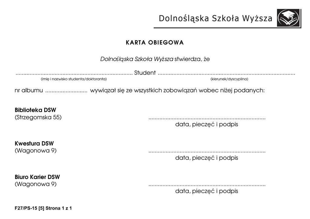 KARTA OBIEGOWA Dolnośląska Szkoła Wyższa stwierdza, że ........................................................................... Student ........................................................................................ (imię i nazwisko studenta/doktoranta) (kierunek/dyscyplina) nr albumu ........................... wywiązał się ze wszystkich zobowiązań wobec niżej podanych: Biblioteka DSW (Strzegomska 55) Kwestura DSW (Wagonowa 9) Biuro Karier DSW (Wagonowa 9) F27/PS-15 [5] Strona 1 z 1 ........................................................................... data, pieczęć i podpis ........................................................................... data, pieczęć i podpis ........................................................................... data, pieczęć i podpis