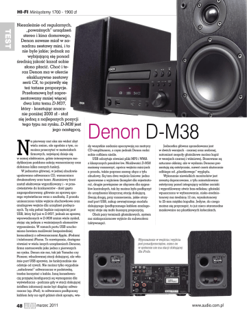 HI-FI Minisystemy 1700 - 1900 zł TEST Niezależnie od regularnych, „poważnych” urządzeń stereo i kina domowego, Denon zawsze miał w zanadrzu zestawy mini, i to nie byle jakie; jednak za wybijającą się ponad średnią jakość kazał sobie słono płacić. Choć i teraz Denon ma w ofercie ekskluzywne zestawy serii CX, to pojawiły się też tańsze propozycje. Przełomową był zaprezentowany mniej więcej dwa lata temu D-M37, który - kosztując znacznie poniżej 2000 zł - stał się jedną z najlepszych pozycji tego typu na rynku. D-M38 jest jego następcą. N a pierwszy rzut oka nie widać zbyt wielu zmian, ale zgodnie z tym, co można przeczytać w materiałach firmowych, najwięcej dzieje się w samej elektronice, gdzie intensywnym modyfikacjom poddano sekcję wzmacniaczy oraz dołożono kilka cennych funkcji. W jednostce głównej, w jednej obudowie upakowano odtwarzacz CD, wzmacniacz dwukanałowy oraz tuner. Aluminiowy front został efektownie wyprofilowany i - w przeciwieństwie do konkurentów - dość gęsto zagospodarowany, głównie za sprawą sporego wyświetlacza wraz z szufladą. Z przodu umieszczono także wyjście słuchawkowe oraz analogowe wejście dla urządzeń podręcznych. Tę rolę pełnić będzie najczęściej port USB, który był już w D-M37, jednak za sprawą wprowadzonych w D-M38 zmian wiele zyskał, stając się jednym z ważniejszych elementów wyposażenia. W ramach portu USB uruchomiono bowiem możliwość bezpośredniej komunikacji z odtwarzaczami Apple, iPodami i telefonami iPhone. To rozwiązanie, dostępne również w wielu innych urządzeniach Denona, firma zastosowała jako jedna z pierwszych na rynku. Denon nie ma, tak jak Yamaha czy Pioneer, wbudowanej stacji dokującej, ale właśnie port USB sprawia, że funkcjonalnie nie odstaje od rywali. Nie można tylko wygodnie „załadować” odtwarzacza w podstawkę, trzeba korzystać z kabla. Inną konsekwencją przyjętej konfiguracji są wymagania dla wyświetlacza - podczas gdy w stacji dokującej źródłem informacji może być display odtwarzacza (np. iPod), to odtwarzacz podłączony kablem leży na ogół gdzieś obok sprzętu, wte- 48 marzec 2011 Denon D-M38 dy wszystkie zadania spoczywają na matrycy CD-amplitunera, z czym jednak Denon radzi sobie całkiem nieźle. USB odczytuje również pliki MP3 i WMA z klasycznych pendrive’ów. Możliwości D-M38 możemy rozszerzyć, oprócz wejścia mini-jack z przodu, także poprzez szereg złącz z tyłu obudowy. Są tam dwa wejścia liniowe: jedno sparowane z wyjściem (komplet dla rejestratora), drugie powiązane ze złączem dla sygnałów kontrolnych, tak by można było podłączyć do urządzenia klasyczną stację dokującą. Swoją drogą, przy rozszerzeniu, jakie otrzymał port USB, zakup zewnętrznego modułu dokującego (podłączanego kablem analogowym) staje się mało kuszącą propozycją. Obok pary terminali głośnikowych, system ma niskopoziomowe wyjście do subwoofera (aktywnego). Jednostka główna sprzedawana jest w dwóch wersjach - czarnej oraz srebrnej, natomiast zespoły głośnikowe można kupić w wersjach czarnej i wiśniowej. Stosowane są sztuczne okleiny, ale w wydaniu Denona prezentują się estetycznie, nawet czerń skutecznie odbiega od „plastikowego” wyglądu. Wykonanie niewielkich monitorków jest zresztą dopracowane, z tyłu zainstalowano estetyczny panel integrujący solidne zaciski i wyprofilowany otwór bas-refleksu; głośniki wpuszczono w wyfrezowania, nisko-średniotonowy ma średnicę 12 cm, wysokotonowy to 25-mm miękka kopułka. Jedyne, do czego można się przyczepić, to już nieco staromodne maskownice na plastikowych kołeczkach. Wyposażenie w wejścia i wyjścia jest ponadprzeciętne, mimo że w systemie nie ma stacji dokującej dla iPoda. www.audio.com.pl ODSŁUCH Denon nie chce grać niskim dźwiękiem i nie oszukujmy się, nie ma takich możliwości… lecz bez ambicji sięgania w głęboki bas też da się żyć, a całemu brzmieniu Denona wychodzi to nawet na zdrowie. Lepiej skupić się w zakresie, w którym można pokazać prawdziwy, nieudawany potencjał. Zamiast grzmieć i przy okazji się krztusić, Denon stawia na rytm i całkiem pokaźną energię. Jednocześnie wyższego basu, który nam serwuje, jest pod dostatkiem, by wypełnić wcale nie najmniejsze pomieszczenie, choć oczywiście nie będzie to swoboda i szaleństwo na miarę dużych kolumn podłogowych. Dobra kondycja Denona wynika bowiem nie tylko (a może nie tyle) z basu, co z odważnego i żywego środka, polot tego zakresu wszystko wynagradza. Dźwięk jest pełen emocji, dużo jest też iskier sypiących się w zakresie wysokich tonów, chociaż sam poziom tego zakresu wcale nie wydaje się wyeksponowany. Jedno jest pewne nigdy nie będzie nudno. D-M38 CENA:1900 ZŁ Pilot jest dość obszerny i gwarantuje niezłą orientację nawet w szeregu opcji podłączonego iPoda. Wykonanie CD-amplituner precyzyjnie „wykrojony” z metalu, małe monitorki z kompletem dobrych głośników. FUNKCJONALNOŚĆ Wszechstronne USB z bezpośrednią obsługą iPoda, czytelny wyświetlacz, intuicyjna obsługa pilotem. BRZMIENIE Energetyczne, odważne, z mocnym środkiem, selektywną górą i rytmicznym basikiem. R E K L A M A DYSTRYBUTOR: horn distribution www.denon.pl Z przodu jest wejście analogowe oraz wyjście dla słuchawek. Najłatwiej zachęcić do podłączenia odtwarzacza przez zwykły kabel i port USB, który może także pełnić klasyczną funkcję bazy dla nośników pamięci. www.audio.com.pl marzec 2011 49