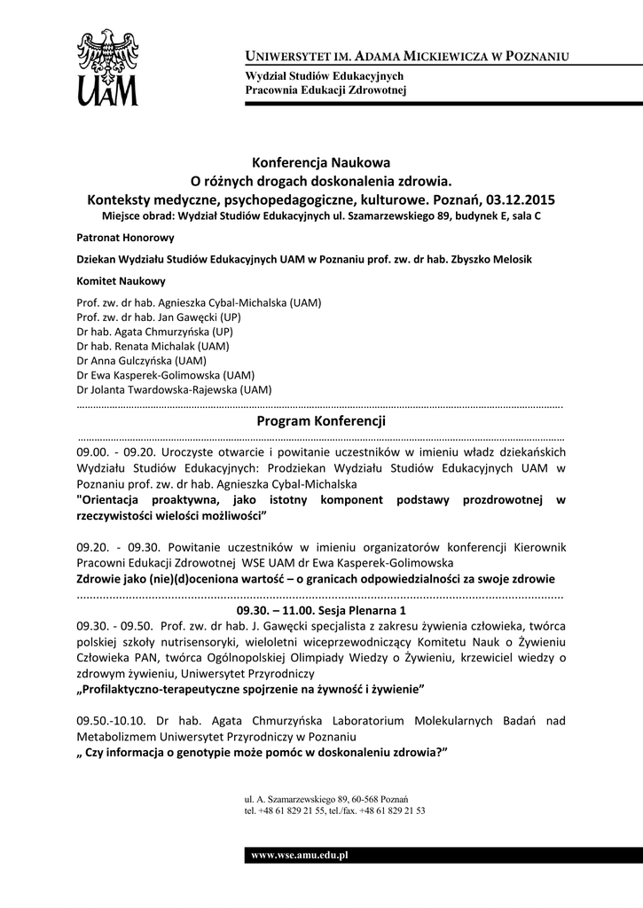 Wydział Studiów Edukacyjnych Pracownia Edukacji Zdrowotnej Konferencja Naukowa O różnych drogach doskonalenia zdrowia. Konteksty medyczne, psychopedagogiczne, kulturowe. Poznań, 03.12.2015 Miejsce obrad: Wydział Studiów Edukacyjnych ul. Szamarzewskiego 89, budynek E, sala C Patronat Honorowy Dziekan Wydziału Studiów Edukacyjnych UAM w Poznaniu prof. zw. dr hab. Zbyszko Melosik Komitet Naukowy Prof. zw. dr hab. Agnieszka Cybal-Michalska (UAM) Prof. zw. dr hab. Jan Gawęcki (UP) Dr hab. Agata Chmurzyńska (UP) Dr hab. Renata Michalak (UAM) Dr Anna Gulczyńska (UAM) Dr Ewa Kasperek-Golimowska (UAM) Dr Jolanta Twardowska-Rajewska (UAM) ……………………………………………………………………………………………………………………………………………………………. Program Konferencji ……………………………………………………………….…………………………………………………………………………………………… 09.00. - 09.20. Uroczyste otwarcie i powitanie uczestników w imieniu władz dziekańskich Wydziału Studiów Edukacyjnych: Prodziekan Wydziału Studiów Edukacyjnych UAM w Poznaniu prof. zw. dr hab. Agnieszka Cybal-Michalska "Orientacja proaktywna, jako istotny komponent podstawy prozdrowotnej w rzeczywistości wielości możliwości” 09.20. - 09.30. Powitanie uczestników w imieniu organizatorów konferencji Kierownik Pracowni Edukacji Zdrowotnej WSE UAM dr Ewa Kasperek-Golimowska Zdrowie jako (nie)(d)oceniona wartość – o granicach odpowiedzialności za swoje zdrowie ..................................................................................................................................................... 09.30. – 11.00. Sesja Plenarna 1 09.30. - 09.50. Prof. zw. dr hab. J. Gawęcki specjalista z zakresu żywienia człowieka, twórca polskiej szkoły nutrisensoryki, wieloletni wiceprzewodniczący Komitetu Nauk o Żywieniu Człowieka PAN, twórca Ogólnopolskiej Olimpiady Wiedzy o Żywieniu, krzewiciel wiedzy o zdrowym żywieniu, Uniwersytet Przyrodniczy „Profilaktyczno-terapeutyczne spojrzenie na żywność i żywienie” 09.50.-10.10. Dr hab. Agata Chmurzyńska Laboratorium Molekularnych Badań nad Metabolizmem Uniwersytet Przyrodniczy w Poznaniu „ Czy informacja o genotypie może pomóc w doskonaleniu zdrowia?” ul. A. Szamarzewskiego 89, 60-568 Poznań tel. +48 61 829 21 55, tel./fax. +48 61 829 21 53 www.wse.amu.edu.pl Wydział Studiów Edukacyjnych Pracownia Edukacji Zdrowotnej 10.10.-10.30. Dr Marzena Wiernicka Zakład Kinezyterapii Akademia Wychowania Fizycznego im. E. Piaseckiego w Poznaniu „Budowanie prawidłowych wzorców ruchowych podstawą zdrowego stylu życia” 10.30.- 10.50. Dr hab. Renata Michalak Zakład Edukacji Elementarnej i Terapii Pedagogicznej WSE UAM „Wpływ zdrowego stylu życia na rozwój i funkcjonowanie jednostki w kontekście neuroscience. Od poczęcia do późnej dorosłości” ……………………………………………………………………………………………………………………………………………… 11.00.- 11.30. - Przerwa na kawę ………………………………………………………………………………………………………………………………………………. 11.30.-13.00. Sesja plenarna 2 11.30. - 11.45. mgr Hanna Rajcic-Mergler Wicekurator Oświaty Kuratorium Oświaty w Poznaniu „Edukacja prozdrowotna w szkole i jej rola w przygotowaniu do zdrowego stylu życia” 11.45. - 12.00. mgr Irena Sierpowska-Glapiak Koordynator Szkół Promujących Zdrowie Kuratorium Oświaty, Delegatura w Lesznie „Dla zdrowia warto tworzyć szkoły promujące zdrowie i edukować od najmłodszych lat” 12.00. - 12.15. mgr Beata Witczak Ośrodek Doskonalenia Nauczycieli w Poznaniu, Zespół Szkół Licealno-Technicznych, ul. 28 Czerwca 1956 r. 352/360 w Poznaniu „Sukcesy i trudności promocji zdrowia w szkole na przykładzie wybranych poznańskich szkół” 12.15. - 12.30. mgr Alina Pioterek dr Agnieszka Dyk - Duszyńska Oddział Oświaty Zdrowotnej i Promocji Zdrowia Wojewódzkiej Stacji Sanitarno - Epidemiologicznej w Poznaniu „Działania w zakresie oświaty zdrowotnej i promocji zdrowia realizowane przez pracowników Państwowej Inspekcji Sanitarnej województwa wielkopolskiego” 12.30. - 12.45. Dr Agata Woźniak Gnieźnieńska Szkoła Wyższa Milenium w Gnieźnie, Pracownia Psychologiczno-Pedagogiczna, Poznań „Wspieranie zasobów w pracy z rodziną w przedszkolach, szkołach i placówkach” 12.45. - 13.00. mgr Agnieszka Kaczmarczyk Polskie Stowarzyszenie Pedagogów i Animatorów KLANZA „Wykorzystanie metod aktywizujących w edukacji zdrowotnej na przykładzie działań podejmowanych przez Polskie Stowarzyszenie Pedagogów i Animatorów KLANZA” ul. A. Szamarzewskiego 89, 60-568 Poznań tel. +48 61 829 21 55, tel./fax. +48 61 829 21 53 www.wse.amu.edu.pl Wydział Studiów Edukacyjnych Pracownia Edukacji Zdrowotnej ……………………………………………………………………………………………………………………………………………… 13.00.- 14.00 przerwa na lunch ……………………………………………………………………………………………………………………………………………… 14.00.-16.00. Sesja plenarna 3 14.00. - 14.15. dr Patrycja Rąglewska Zakład Fizykoterapii i Odnowy Biologicznej AWF w Poznaniu, WSEiT Wydział Zamiejscowy Szczecin, dr Renata Śleboda Zakład Tańca i Fitnessu AWF w Poznaniu, dr Małgorzata Woźniewicz - Dobrzyńska Zakład Metodyki Rekreacji AWF w Poznaniu „Profilaktyka stresu - techniki relaksacyjne i ich rola w ochronie i promocji zdrowia” 14.15. - 14.30. dr Barbara Jankowiak Zakład Promocji Zdrowia i Psychoterapii WSE UAM „Rola czynników chroniących w profilaktyce zachowań ryzykownych adolescentów” 14.30. - 14.45. dr Graży