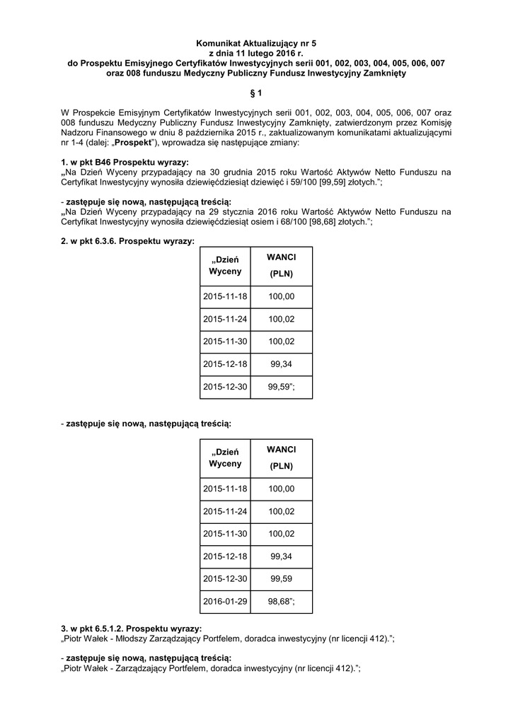 Komunikat Aktualizujący nr 5 z dnia 11 lutego 2016 r. do Prospektu Emisyjnego Certyfikatów Inwestycyjnych serii 001, 002, 003, 004, 005, 006, 007 oraz 008 funduszu Medyczny Publiczny Fundusz Inwestycyjny Zamknięty §1 W Prospekcie Emisyjnym Certyfikatów Inwestycyjnych serii 001, 002, 003, 004, 005, 006, 007 oraz 008 funduszu Medyczny Publiczny Fundusz Inwestycyjny Zamknięty, zatwierdzonym przez Komisję Nadzoru Finansowego w dniu 8 października 2015 r., zaktualizowanym komunikatami aktualizującymi nr 1-4 (dalej: „Prospekt”), wprowadza się następujące zmiany: 1. w pkt B46 Prospektu wyrazy: „Na Dzień Wyceny przypadający na 30 grudnia 2015 roku Wartość Aktywów Netto Funduszu na Certyfikat Inwestycyjny wynosiła dziewięćdziesiąt dziewięć i 59/100 [99,59] złotych.”; - zastępuje się nową, następującą treścią: „Na Dzień Wyceny przypadający na 29 stycznia 2016 roku Wartość Aktywów Netto Funduszu na Certyfikat Inwestycyjny wynosiła dziewięćdziesiąt osiem i 68/100 [98,68] złotych.”; 2. w pkt 6.3.6. Prospektu wyrazy: „Dzień Wyceny WANCI 2015-11-18 100,00 2015-11-24 100,02 2015-11-30 100,02 2015-12-18 99,34 2015-12-30 99,59”; (PLN) - zastępuje się nową, następującą treścią: „Dzień Wyceny WANCI 2015-11-18 100,00 2015-11-24 100,02 2015-11-30 100,02 2015-12-18 99,34 2015-12-30 99,59 2016-01-29 98,68”; (PLN) 3. w pkt 6.5.1.2. Prospektu wyrazy: „Piotr Wałek - Młodszy Zarządzający Portfelem, doradca inwestycyjny (nr licencji 412).”; - zastępuje się nową, następującą treścią: „Piotr Wałek - Zarządzający Portfelem, doradca inwestycyjny (nr licencji 412).”; 4. w pkt 6.5.3.1.2. Prospektu, wyrazy: „6) Pan Wojciech Pątkiewicz jako likwidator (wcześniej Członek Zarządu) Ibanq S.A. - spółka zakończyła działalność i pozostaje w likwidacji;”; „8) Pan Andrzej Sykulski jako Członek Zarządu Ibanq S.A. - spółka zakończyła działalność i pozostaje w likwidacji.”; - zastępuje się nową, następującą treścią: „6) Pan Wojciech Pątkiewicz jako likwidator (wcześniej Członek Zarządu) Ibanq S.A. - spółka zakończyła działalność i została wykreślona z rejestru przedsiębiorców KRS;”; „8) Pan Andrzej Sykulski jako Członek Zarządu Ibanq S.A. - spółka zakończyła działalność i została wykreślona z rejestru przedsiębiorców KRS.”; 5. w pkt 6.5.3.1.2. Prospektu, w części dotyczącej opisu doświadczenia Pana Wojciecha Pątkiewicza, wyrazy: „Od 2013 -2016 Ibanq Spółka Akcyjna w likwidacji – likwidator; Od 2006 do 2013 Ibanq Spółka Akcyjna w likwidacji - Członek Zarządu;”; - zastępuje się nową, następującą treścią: „Od 2013 -2016 Ibanq Spółka Akcyjna – likwidator; Od 2006 do 2013 Ibanq Spółka Akcyjna - Członek Zarządu;”; 6. w pkt 6.5.3.1.2. Prospektu, w części dotyczącej opisu doświadczenia Pana Andrzeja Sykulskiego, wyrazy: „Od 2006 do 2013 Ibanq Spółka Akcyjna w likwidacji - Członek Zarządu;”; - zastępuje się nową, następującą treścią: „Od 2006 do 2013 Ibanq Spółka Akcyjna - Członek Zarządu;”; 7. w pkt 6.5.3.1.3. Prospektu, w części dotyczącej opisu doświadczenia Pana Piotra Wałka, wyrazy: „Posiada tytuł Magistra Uniwersytetu Ekonomicznego w Poznaniu na kierunku Finanse i Rachunkowość, ponadto od 2014 odbywa studia trzeciego stopnia w Szkole Głównej Handlowej w Warszawie.”; „Od 2015 zatrudniony w Trigon TFI S.A. na stanowisku Młodszego Zarządzającego Portfelem doradcy inwestycyjnego nr licencji 412;”; - zastępuje się nową, następującą treścią: „Posiada tytuł Magistra Uniwersytetu Ekonomicznego w Poznaniu na kierunku Finanse i Rachunkowość.”; „Od 2015 roku do 31 stycznia 2016 roku zatrudniony w Trigon TFI S.A. na stanowisku Młodszego Zarządzającego Portfelem, doradcy inwestycyjnego (nr licencji 412). Od 1 lutego 2016 roku zatrudniony w Trigon TFI S.A. na stanowisku Zarządzającego Portfelem, doradcy inwestycyjnego (nr licencji 412).”; 8. w pkt 8. Prospektu wyrazy: „Piotr Wałek (Zarządzający Portfelem Młodszy, doradca inwestycyjny - nr licencji 412)- dane dotyczące Pana Piotra Wałka znajdują się w pkt 6.5.3.1.3.”; - zastępuje się nową, następującą treścią: „Piotr Wałek (Zarządzający Portfelem, doradca inwestycyjny - nr licencji 412)- dane dotyczące Pana Piotra Wałka znajdują się w pkt 6.5.3.1.3.”. §2 Pozostałe postanowienia Prospektu pozostają bez zmian. §3 Komunikat Aktualizujący wchodzi w życie w dniu jego ogłoszenia.